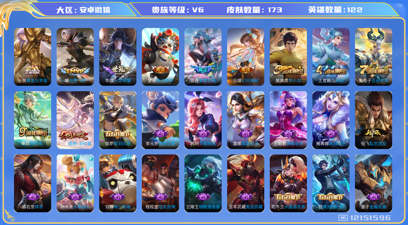 [12151596]【商品标题】:AK597-安卓WX-V6-永恒钻石II段位-123英雄-173皮肤-1典藏(水晶未兑换)-0珍品无双-0无双-0珍品传说-8传说-45史诗