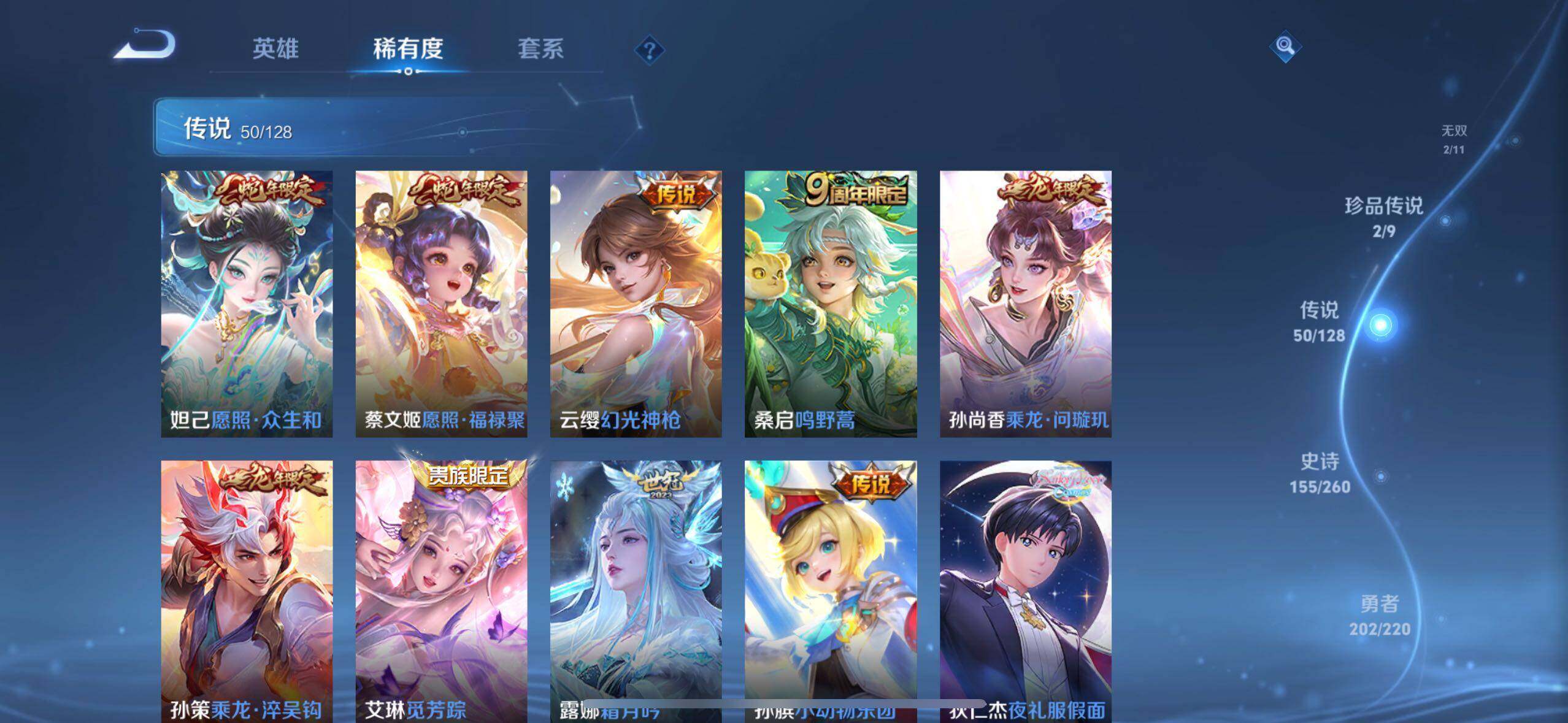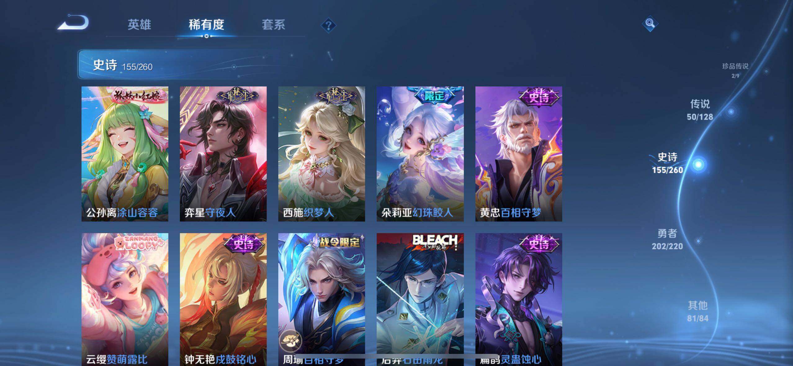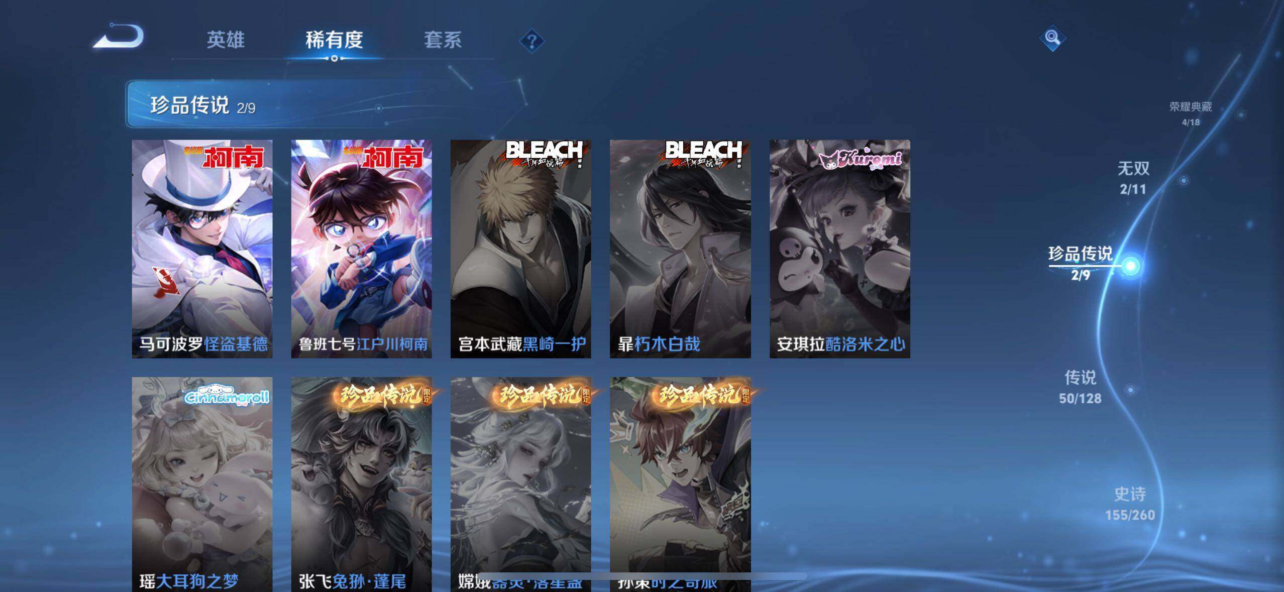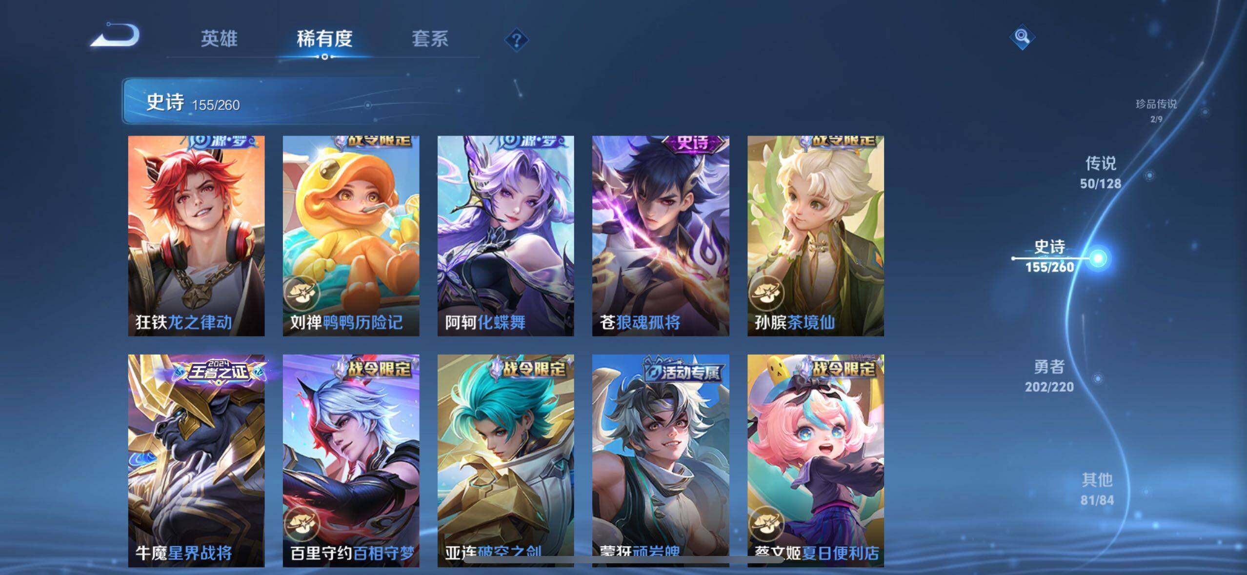 - PX_2104957-Q/至尊星耀/248皮肤/125英雄/1典藏/0珍品无双/0无双/5珍品传说/15传说/81史诗/9稀有英雄 【5 珍品传说】大耳狗之梦 瑶,黑崎一护 宫本武藏,怪盗基德 马可波罗,器灵·落星盏 嫦娥,江户川柯南 鲁班七号, 【1 典藏皮肤】神鉴启示录 虞姬, 【15 传说皮肤】启明星使 虞姬,逐花归海 澜,游龙清影 西施,仲夏夜之梦 貂蝉,祈雪灵祝 公孙离,炽阳神光 镜,黄