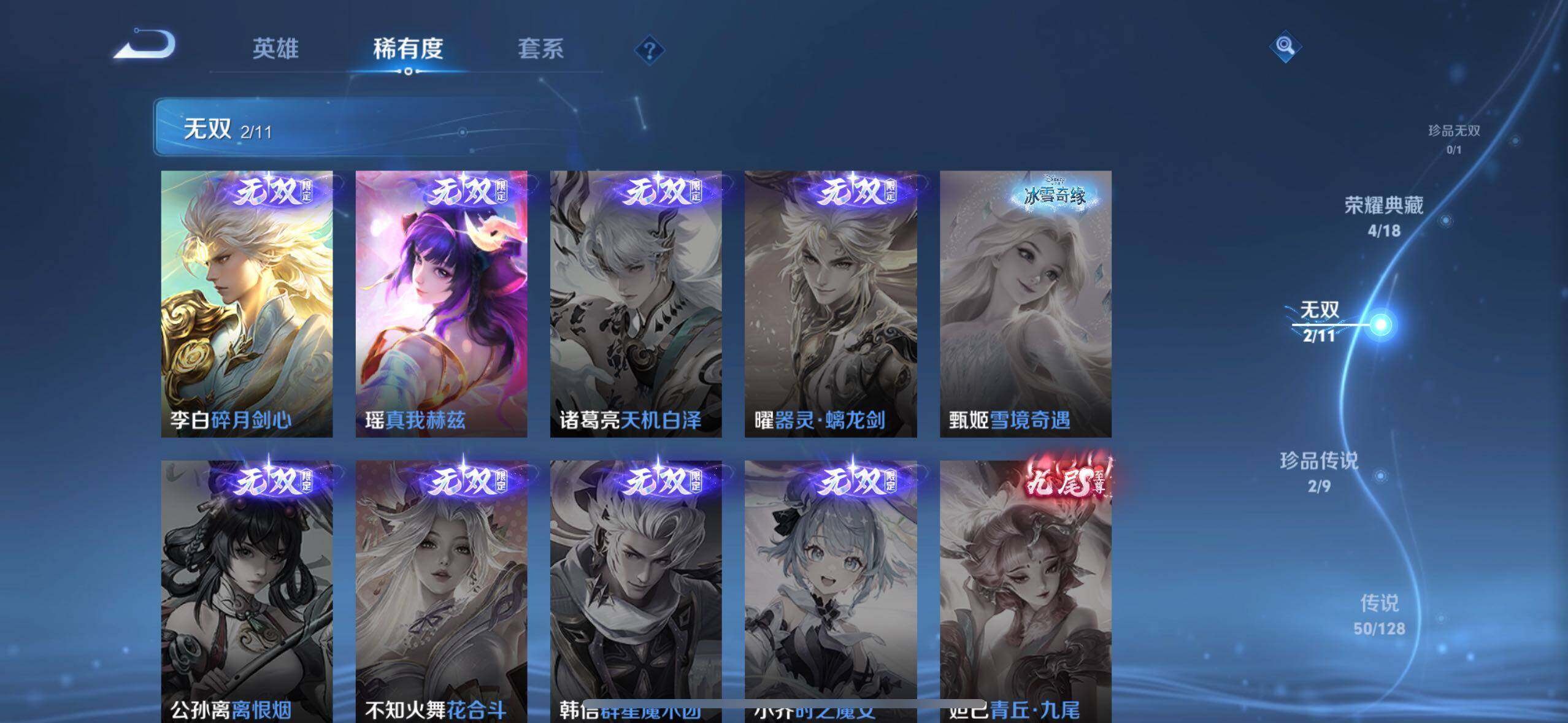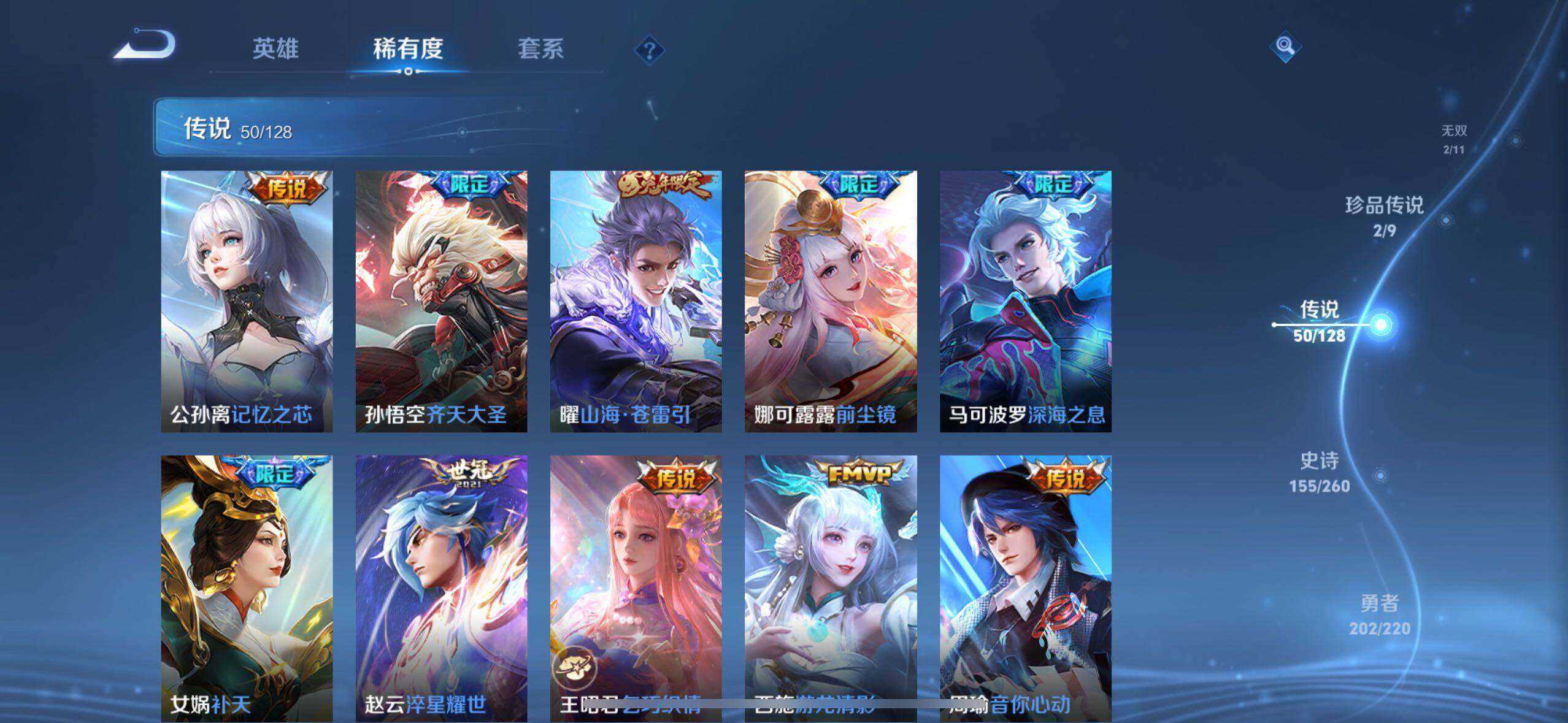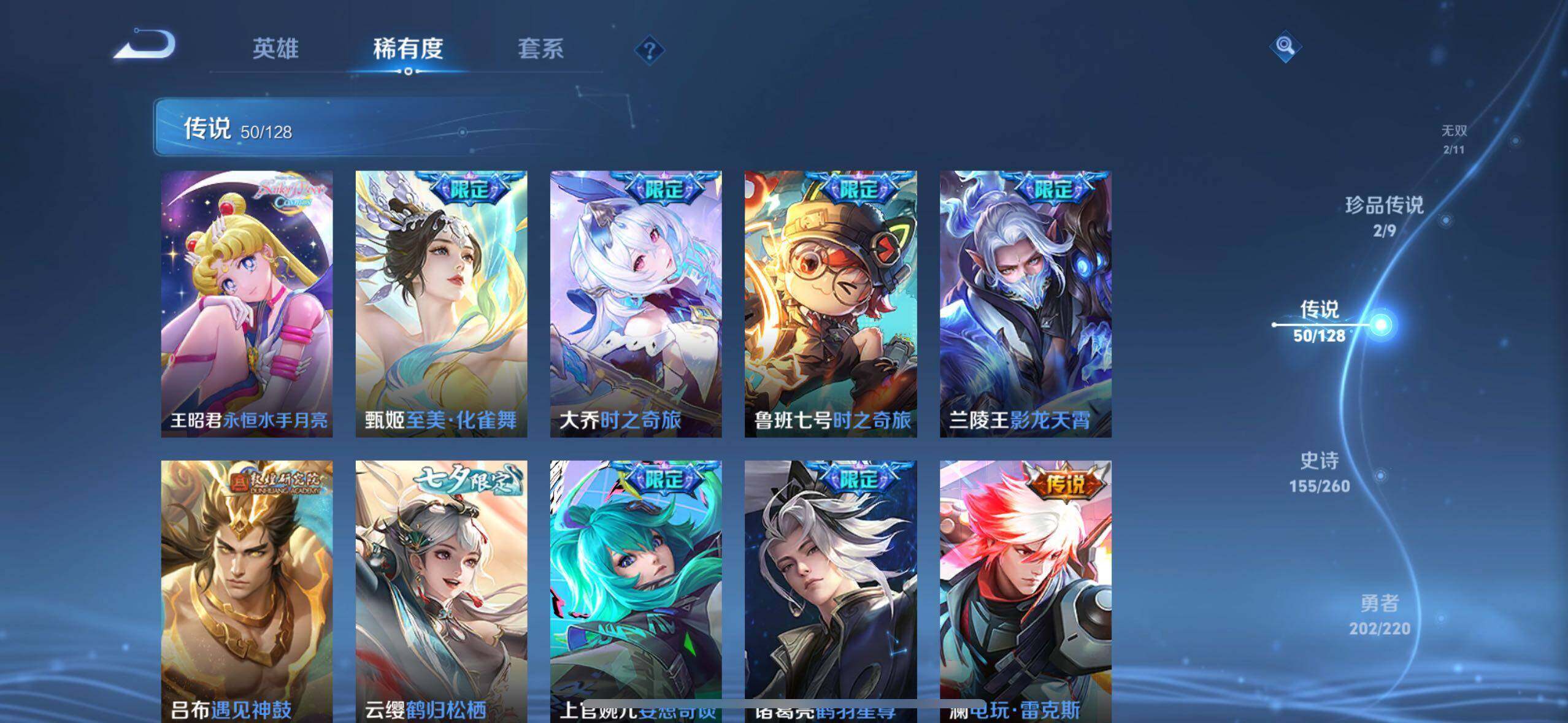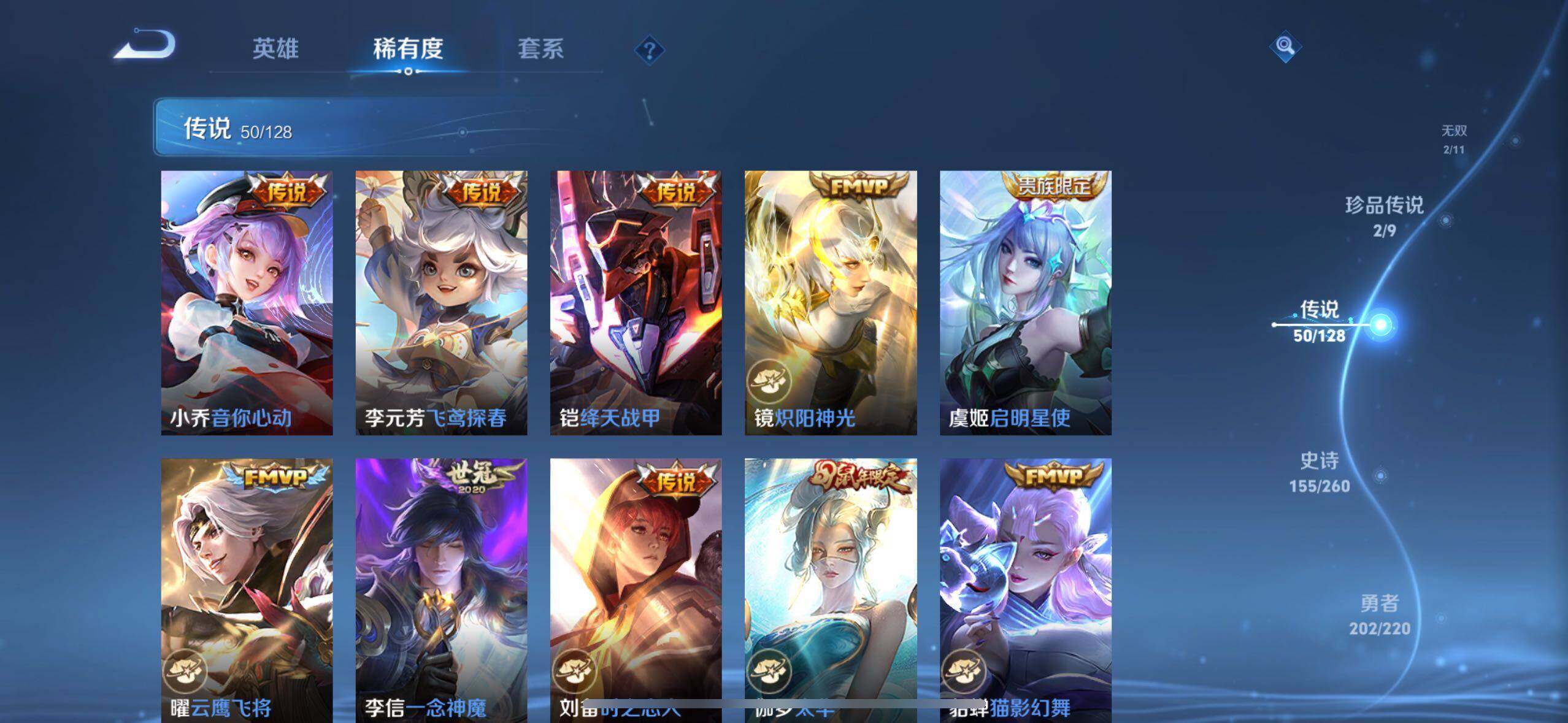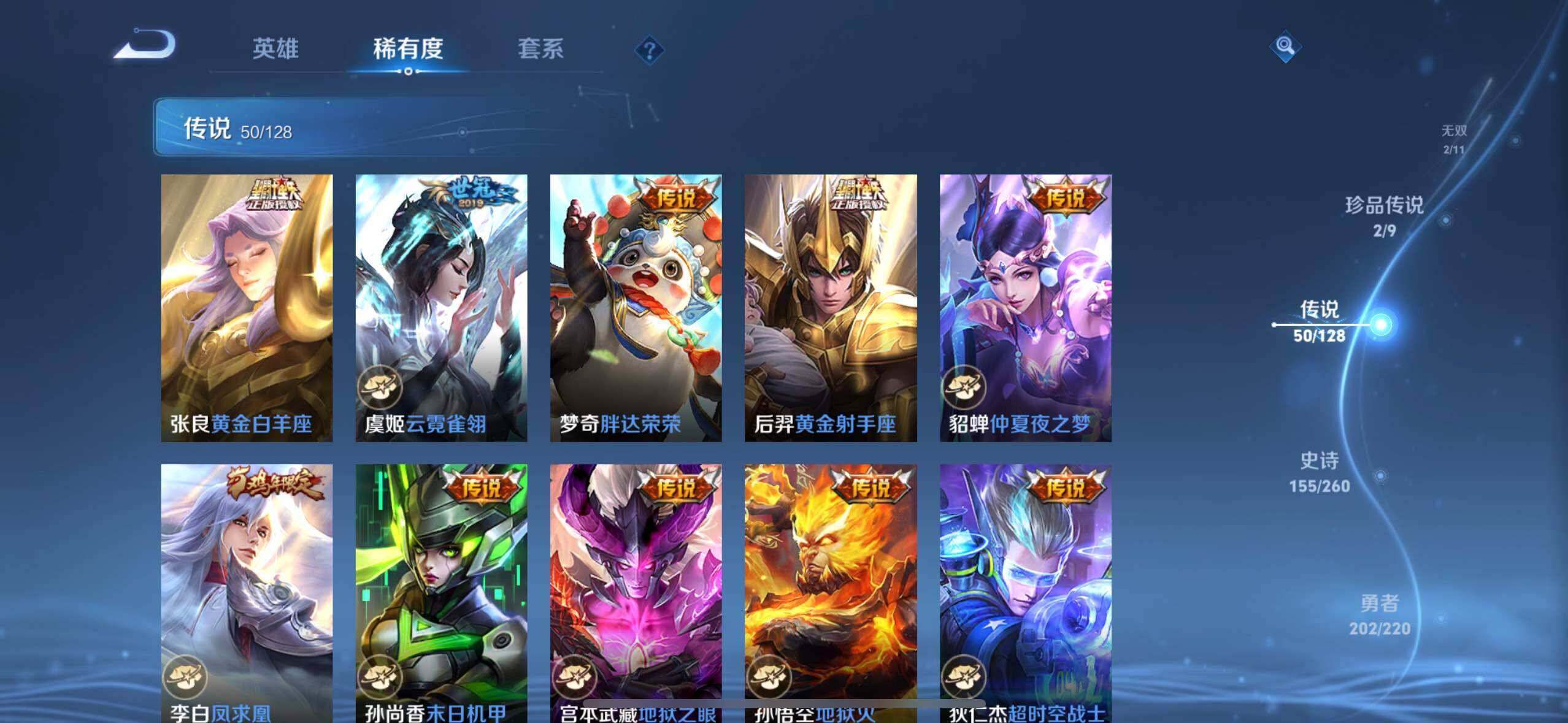 - PX_2104957-Q/至尊星耀/248皮肤/125英雄/1典藏/0珍品无双/0无双/5珍品传说/15传说/81史诗/9稀有英雄 【5 珍品传说】大耳狗之梦 瑶,黑崎一护 宫本武藏,怪盗基德 马可波罗,器灵·落星盏 嫦娥,江户川柯南 鲁班七号, 【1 典藏皮肤】神鉴启示录 虞姬, 【15 传说皮肤】启明星使 虞姬,逐花归海 澜,游龙清影 西施,仲夏夜之梦 貂蝉,祈雪灵祝 公孙离,炽阳神光 镜,黄