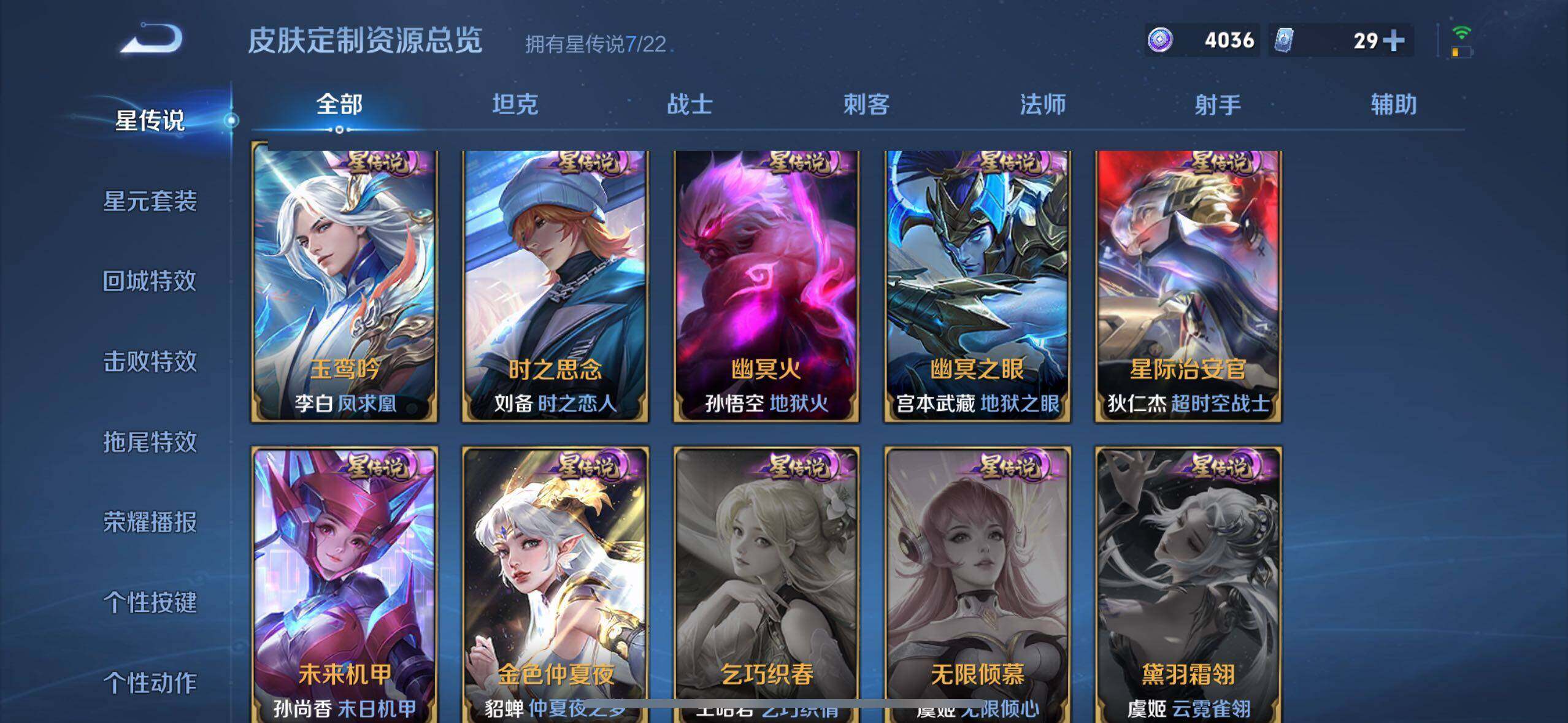 【传说皮肤】:妲己愿照众生和,蔡文姬愿照福禄聚,云缨幻光神枪,桑启鸣野蒿,孙尚香乘龙问璇玑,孙策乘龙淬吴钩,艾琳觅芳踪,露娜霜月吟,孙膑小动物乐团,狄仁杰夜礼服假面,王昭君永恒水手月亮,甄姬至美化雀舞,大乔时之奇旅,鲁班七号时之奇旅,兰陵王影龙天霄,吕布遇见神鼓,云缨鹤归松栖,上官婉儿妄想奇谈,诸葛亮鹤羽星尊,澜电玩雷克斯,公孙离记忆之芯,孙悟空齐天大圣,曜山海苍雷引,娜可露露前尘镜,马可波罗深海之息,女娲补天,赵云淬星耀世,王昭君乞巧织情,西施游龙清影,周瑜音你心动,小乔音你心动,李元芳飞鸢探春,铠绛天战甲,镜炽阳神光,虞姬启明星使,曜云鹰飞将,李信一念神魔,刘备时之恋人,伽罗太华,貂蝉猫影幻舞,张良黄金白羊座,虞姬云霓雀翎,梦奇胖达荣荣,后羿黄金射手座,貂蝉仲夏夜之梦,李白凤求凰,孙尚香末日机甲,宫本武藏地狱之眼,孙悟空地狱火,狄仁杰超时空战士