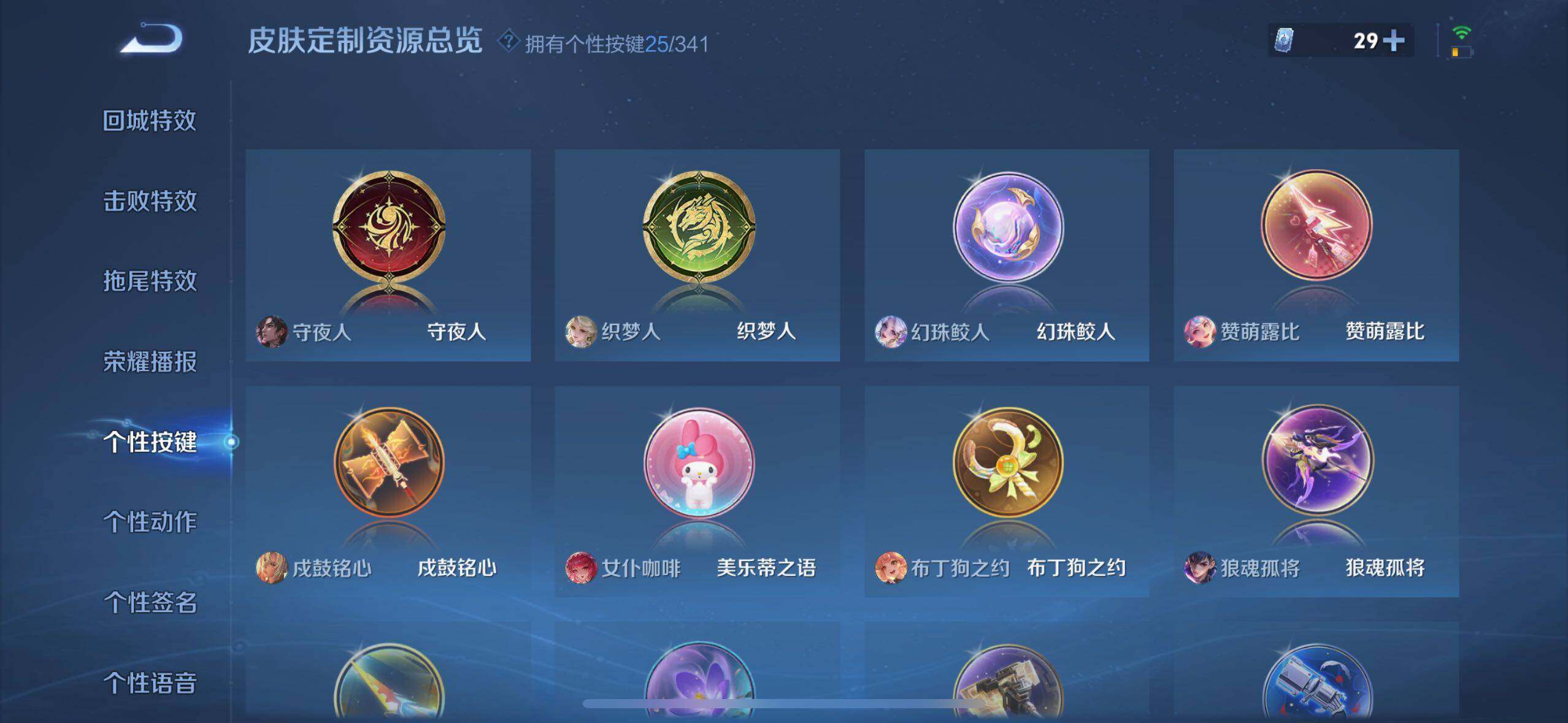 裴擒虎李小龙,上官婉儿梁祝,吕布御风骁将,后羿辉光之辰,典韦岱宗,甄姬幽恒,伽罗太华,裴擒虎天狼狩猎者,周瑜真爱至上,孙悟空大圣娶亲,嫦娥如梦令,干将莫邪冰霜恋舞曲,芈月白晶晶,赵云引擎之心,孙悟空美猴王,猪八戒猪悟能,女娲补天,马可波罗深海之息,娜可露露前尘镜,妲己时之奇旅,马可波罗山海·玄木吟,兰陵王影龙天霄,西施至美·乘鲤谣,甄姬至美·化雀舞,桑启鸣野蒿,蔡文姬愿照·福禄聚,妲己愿照·众生和