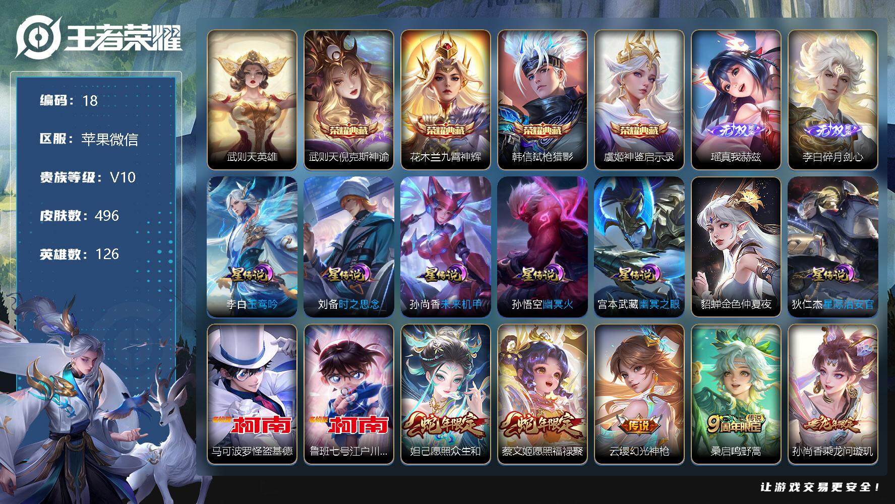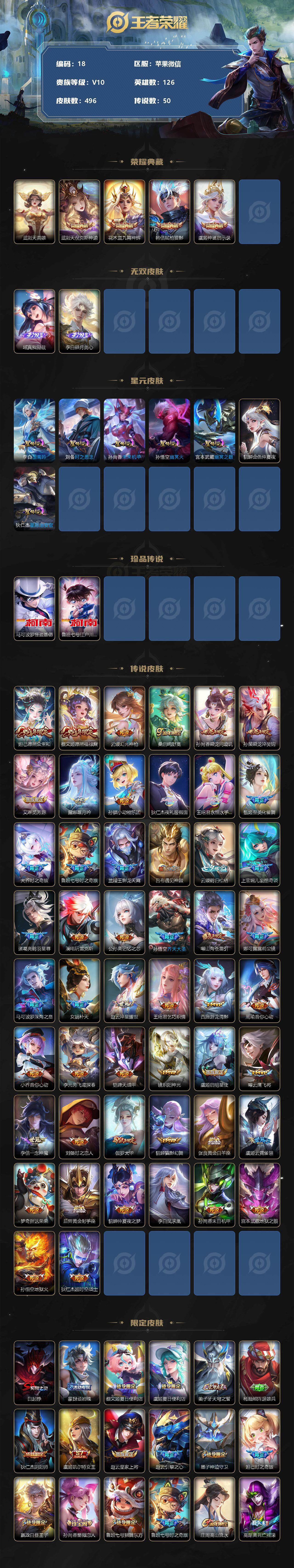 [12151383]AK812-有二次-苹果-V10-126英雄-496皮肤-5水-2无双-2珍品传说-50传说-155史诗 【荣耀典藏】:武则天英雄,武则天倪克斯神谕,花木兰九霄神辉,韩信弑枪猎影,虞姬神鉴启示录 【无双皮肤】:瑶真我赫兹,李白碎月剑心 【珍品传说】:马可波罗怪盗基德,鲁班七号江户川柯南 【传说皮肤】:妲己愿照众生和,蔡文姬愿照福禄聚,云缨幻光神枪,桑启鸣野蒿,孙尚香乘龙问璇玑,孙策乘龙淬吴钩,艾琳觅芳踪,露娜霜月吟,孙膑小动物乐团,狄仁杰夜礼服假面,王昭君永恒水手月亮,甄姬至美化雀舞,大乔时之奇旅,鲁班七号时之奇旅,兰陵王影龙天霄,吕布遇见神鼓,云缨鹤归松栖,上官婉儿妄想奇谈,诸葛亮鹤羽星尊,澜电玩雷克斯,公孙离记忆之芯,孙悟空齐天大圣,曜山海苍雷引,娜可露露前尘镜,马可波罗深海之息,女娲补天,赵云淬星耀世,王昭君乞巧织情,西施游龙清影,周瑜音你心动,小乔音你心动,李元芳飞鸢探春,铠绛天战甲,镜炽阳神光,虞姬启明星使,曜云鹰飞将,李信一念神魔,刘备时之恋人,伽罗太华,貂蝉猫影幻舞,张良黄金白羊座,虞姬云霓雀翎,梦奇胖达荣荣,后羿黄金射手座,貂蝉仲夏夜之梦,李白凤求凰,孙尚香末日机甲,宫本武藏地狱之眼,孙悟空地狱火,狄仁杰超时空战士 【限定皮肤】:白起狰,蒙犽顽岩魄,蔡文姬夏日便利店,虞姬夏日便利店,姜子牙天穹之誓,杨戬破阵退雄兵,狄仁杰阴阳师,虞姬凯尔特女王,赵云皇家上将,赵云引擎之心,墨子神迹守卫,妲己时之奇旅,嬴政白昼王子,孙尚香蔷薇恋人,鲁班七号狮舞东方,鲁班七号时之奇旅,庄周高山流水,高渐离死亡摇滚,阿轲迷踪丽影,钟无艳超时空战士,孙膑妖精王,扁鹊炼金王,扁鹊奇幻香踪,白起夜都怪侠,芈月重明,芈月白晶晶,吕布猎兽之王,吕布御风骁将,吕布遇见神鼓,周瑜真爱至上,周瑜赤莲之焰,元歌云间偶戏,元歌无心,夏侯惇朔风刀,甄姬幽恒,甄姬游园惊梦,甄姬落雪兰心,甄姬至美化雀舞,曹操烛龙,典韦穷奇,典韦蓝屏警告,典韦岱宗,马可波罗暗影游猎,马可波罗深海之息,马可波罗山海玄木吟,狄仁杰魔术师,狄仁杰万华元夜,达摩沙漠行僧,项羽海滩派对,老夫子醍醐杖,程咬金演武夺筹,刘邦夺宝奇兵,王昭君午后时光,兰陵王影龙天霄,兰陵王驯魔猎人,兰陵王金庭之子,娜可露露前尘镜,亚瑟潮玩骑士王,孙悟空美猴王,孙悟空大圣娶亲,孙悟空齐天大圣,牛魔御旌,后羿辉光之辰,后羿圣弓游侠,李元芳银河之约,李