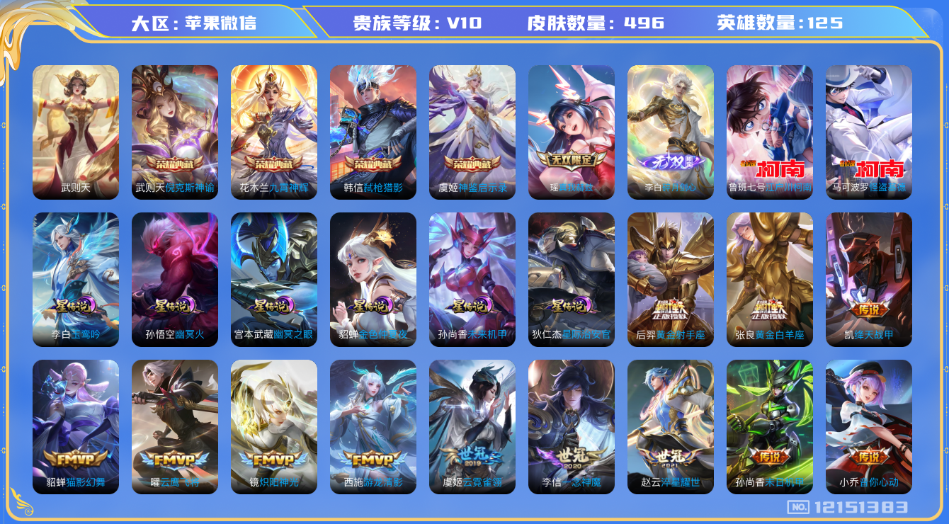 [12151383]AK812-有二次-苹果-V10-126英雄-496皮肤-5水-2无双-2珍品传说-50传说-155史诗