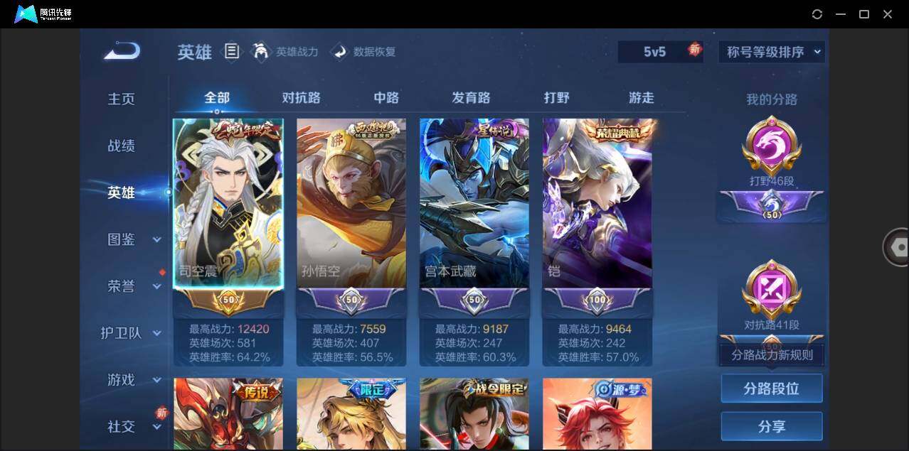 [12100900]打野46段/对抗路41段【特价急出/详情看图】:安卓Q-V11-至尊星耀V段位-125英雄-525皮肤-10典藏-5珍品传说-74传说-164史诗