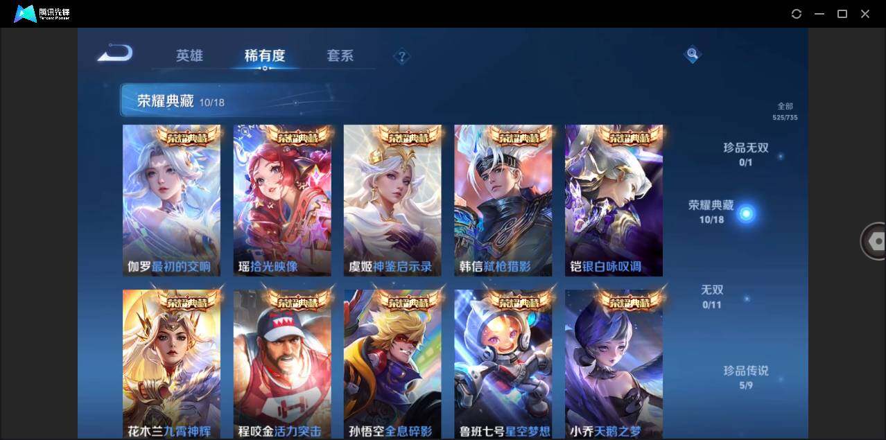 【荣耀典藏】:孙悟空全息碎影,小乔天鹅之梦,鲁班七号星空梦想,程咬金活力突击,花木兰九霄神辉,铠银白咏叹调,韩信弑枪猎影,虞姬神鉴启示录,瑶拾光映像,伽罗最初的交响