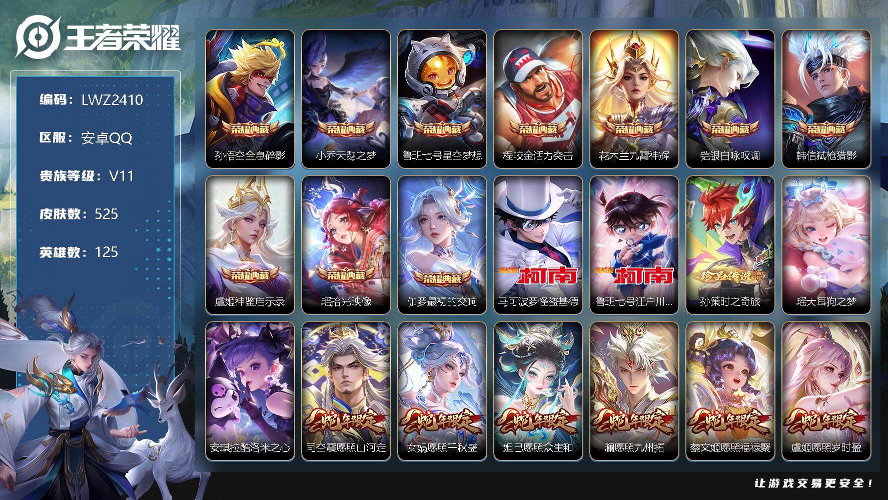 [12100900]打野46段/对抗路41段【特价急出/详情看图】:安卓Q-V11-至尊星耀V段位-125英雄-525皮肤-10典藏-5珍品传说-74传说-164史诗 【荣耀典藏】:孙悟空全息碎影,小乔天鹅之梦,鲁班七号星空梦想,程咬金活力突击,花木兰九霄神辉,铠银白咏叹调,韩信弑枪猎影,虞姬神鉴启示录,瑶拾光映像,伽罗最初的交响 【珍品传说】:马可波罗怪盗基德,鲁班七号江户川柯南,孙策时之奇旅,瑶大耳狗之梦,安琪拉酷洛米之心 【传说皮肤】:司空震愿照山河定,女娲愿照千秋盛,妲己愿照众生和,澜愿照九州拓,蔡文姬愿照福禄聚,虞姬愿照岁时盈,云缨幻光神枪,裴擒虎祥瑞亨通,嬴政玄雷天君,桑启鸣野蒿,庄周牧神诗旅,铠冥王哈迪斯,海月金乌负日,亚连落雪白狼,吕布曦玄引,貂蝉曦玄引,典韦战鼓燎原,孙尚香乘龙问璇玑,孙策乘龙淬吴钩,赵云乘龙铭钟鼎,马超琥珀纪元,铠琥珀纪元,澜逐花归海,艾琳觅芳踪,孙膑小动物乐团,狄仁杰夜礼服假面,王昭君永恒水手月亮,甄姬至美化雀舞,鲁班七号时之奇旅,兰陵王影龙天霄,吕布遇见神鼓,宫本武藏惊梅引,上官婉儿妄想奇谈,马可波罗妄想实况,东皇太一灼幽烈阳,诸葛亮鹤羽星尊,澜电玩雷克斯,夏洛特浮生妄,干将莫邪画中仙,伽罗炽翼辉光,孙悟空齐天大圣,吕布怒海麟威,李白诗剑行,狄仁杰神器狴犴令,马可波罗深海之息,后羿无尽星芒,马超无双飞将,孙策末日机甲,鲁班七号寅虎瑞焰,西施游龙清影,曜李逍遥 ,周瑜音你心动,小乔音你心动,诸葛亮时雨天司,铠绛天战甲,镜炽阳神光,虞姬启明星使,孙悟空零号赤焰,曜云鹰飞将,李信一念神魔,刘备时之恋人,貂蝉猫影幻舞,张良黄金白羊座,干将莫邪久胜战神,虞姬云霓雀翎,达摩黄金狮子座,花木兰冠军飞将,梦奇胖达荣荣,后羿黄金射手座,貂蝉仲夏夜之梦,孙尚香末日机甲,宫本武藏地狱之眼,孙悟空地狱火,狄仁杰超时空战士 【限定皮肤】:铠冥王哈迪斯,暃埋骨钱,蒙犽顽岩魄,蔡文姬夏日便利店,大乔绒语心约,虞姬夏日便利店,姜子牙天穹之誓,杨戬破阵退雄兵,李白谪仙醉月,狄仁杰阴阳师,赵云皇家上将,妲己时之彼端,妲己时之奇旅,孙尚香蔷薇恋人,鲁班七号狮舞东方,鲁班七号乒乒小将,鲁班七号寅虎瑞焰,鲁班七号时之奇旅,庄周高山流水,高渐离死亡摇滚,高渐离玩趣恶龙,钟无艳超时空战士,扁鹊奇幻香踪,白起夜都怪侠,芈月重明,芈月幻夜卜梦,吕布猎兽之王,吕布御风骁将,吕布遇见神鼓,周瑜赤莲