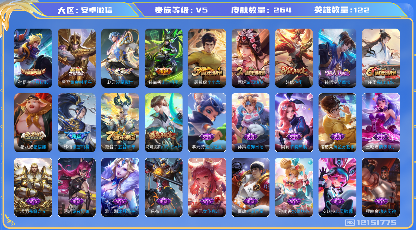 - PX_2099260-贵族等级: V5 英雄数: 121 皮肤数: 123 传说皮: 山海·炽霜斩,幻光神枪 限定皮: 游园惊梦,高山流水,五谷丰年,鸣野蒿,愿照·山河定,愿照·九州拓