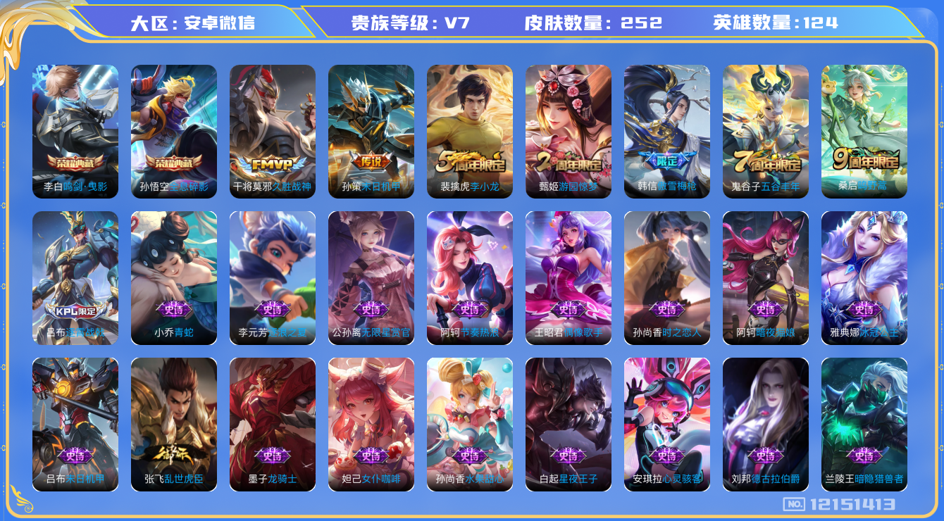 [12151413]【商品标题】:AK205-安卓WX-V3-永恒钻石II段位-125英雄-252皮肤-2典藏-0珍品无双-0无双-0珍品传说-3传说-56史诗