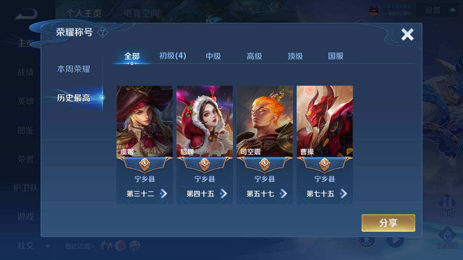 - PX_2091653- 可二次 V8 贵族积分53822 苹果QQ/291皮肤/124英雄/1典藏/0珍品无双/0无双/0珍品传说/10传说/88史诗/9稀有英雄 发育路32段 【1 典藏皮肤】,九霄神辉 花木兰, 【10 传说皮肤】,武圣 关羽,启明星使 虞姬,零号·赤焰 孙悟空,猫影幻舞 貂蝉,武陵仙君 诸葛亮,黄金射手座 后羿,久胜战神 干将莫邪,末日机甲 孙尚香,淬星耀世 赵云,鸣野蒿 桑
