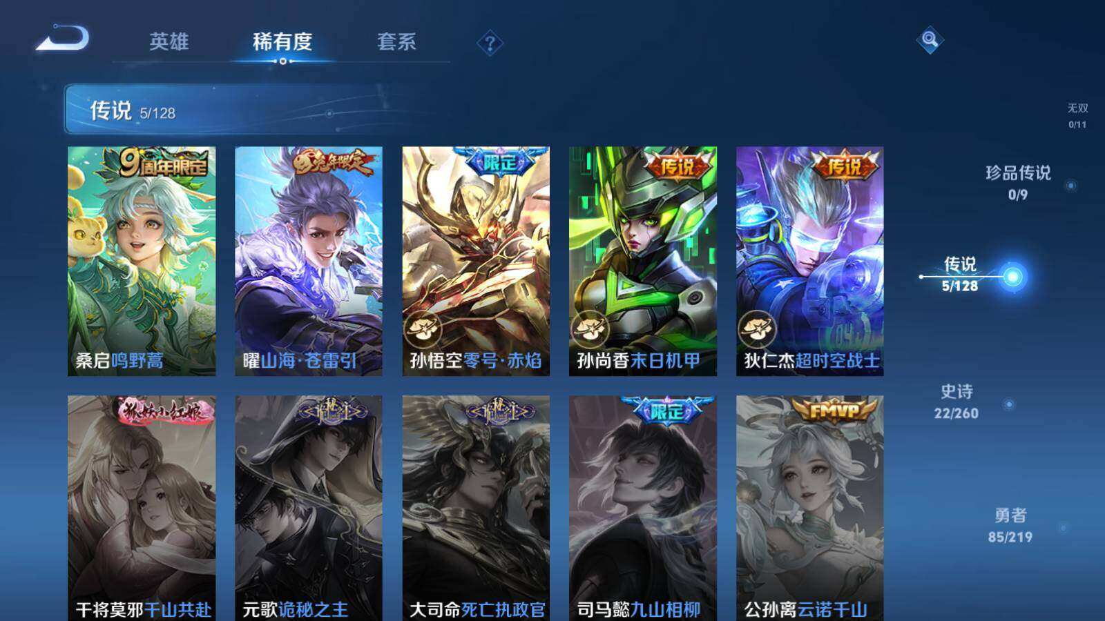 【传说皮肤】:桑启鸣野蒿,曜山海苍雷引,孙悟空零号赤焰,孙尚香末日机甲,狄仁杰超时空战士