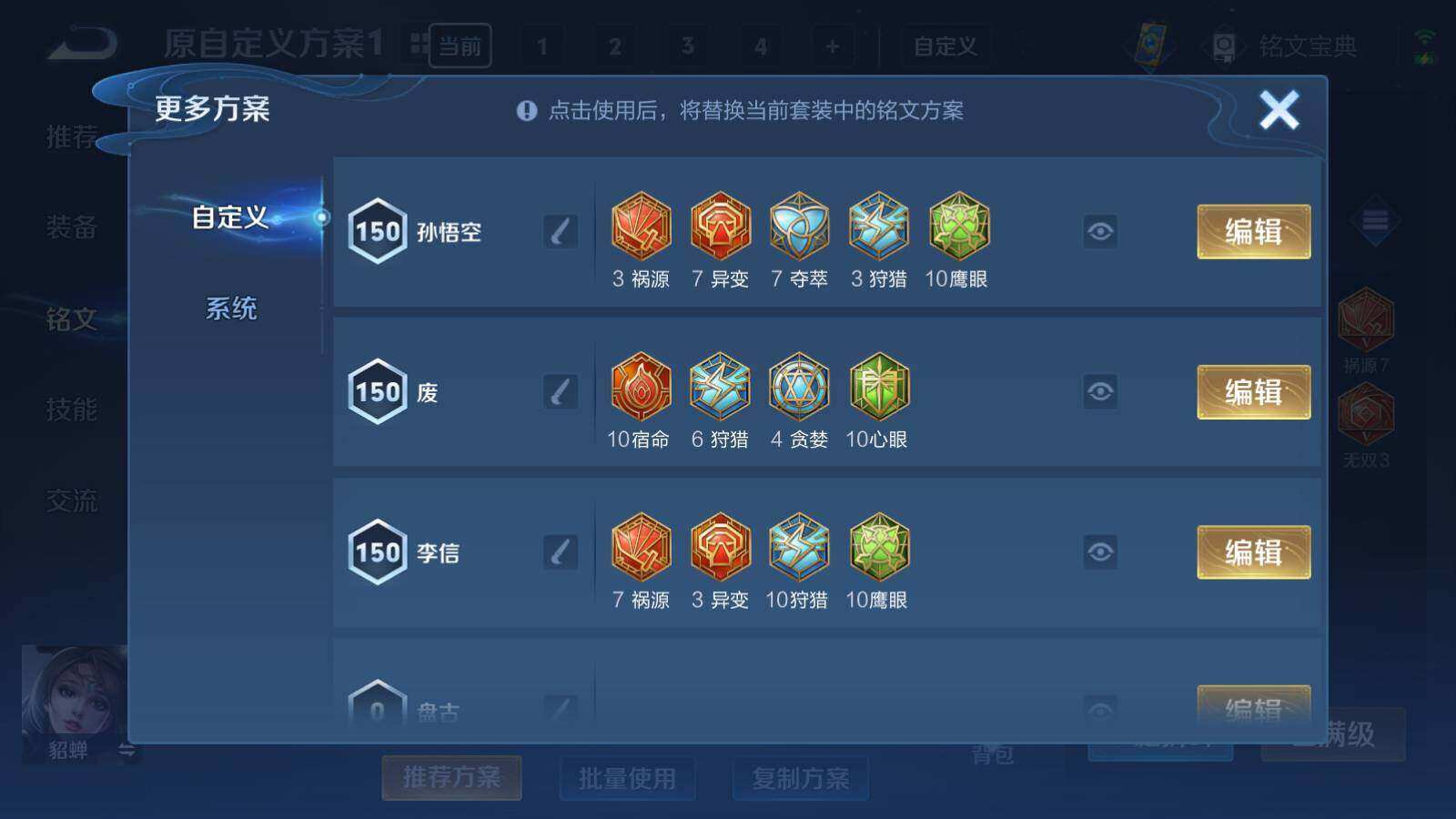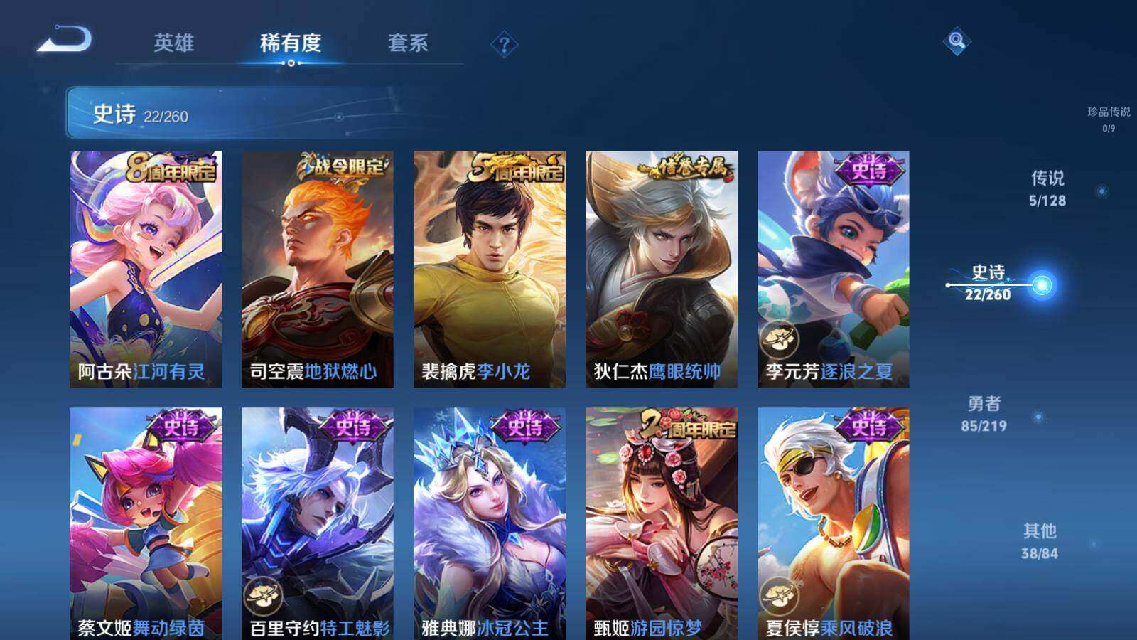 【其他皮肤】:项羽海滩派对,韩信教廷特使,韩信街头霸王,阿轲致命风华,达摩大发明家,赵云忍炎影,扁鹊化身博士,宫本武藏未来纪元,妲己少女阿狸,典韦黄金武士,亚瑟死亡骑士,花木兰兔女郎,宫本武藏万象初新,狄仁杰阴阳师,庄周蜃楼王,刘备纽约教父,孙膑妖精王,刘备汉昭烈帝,李元