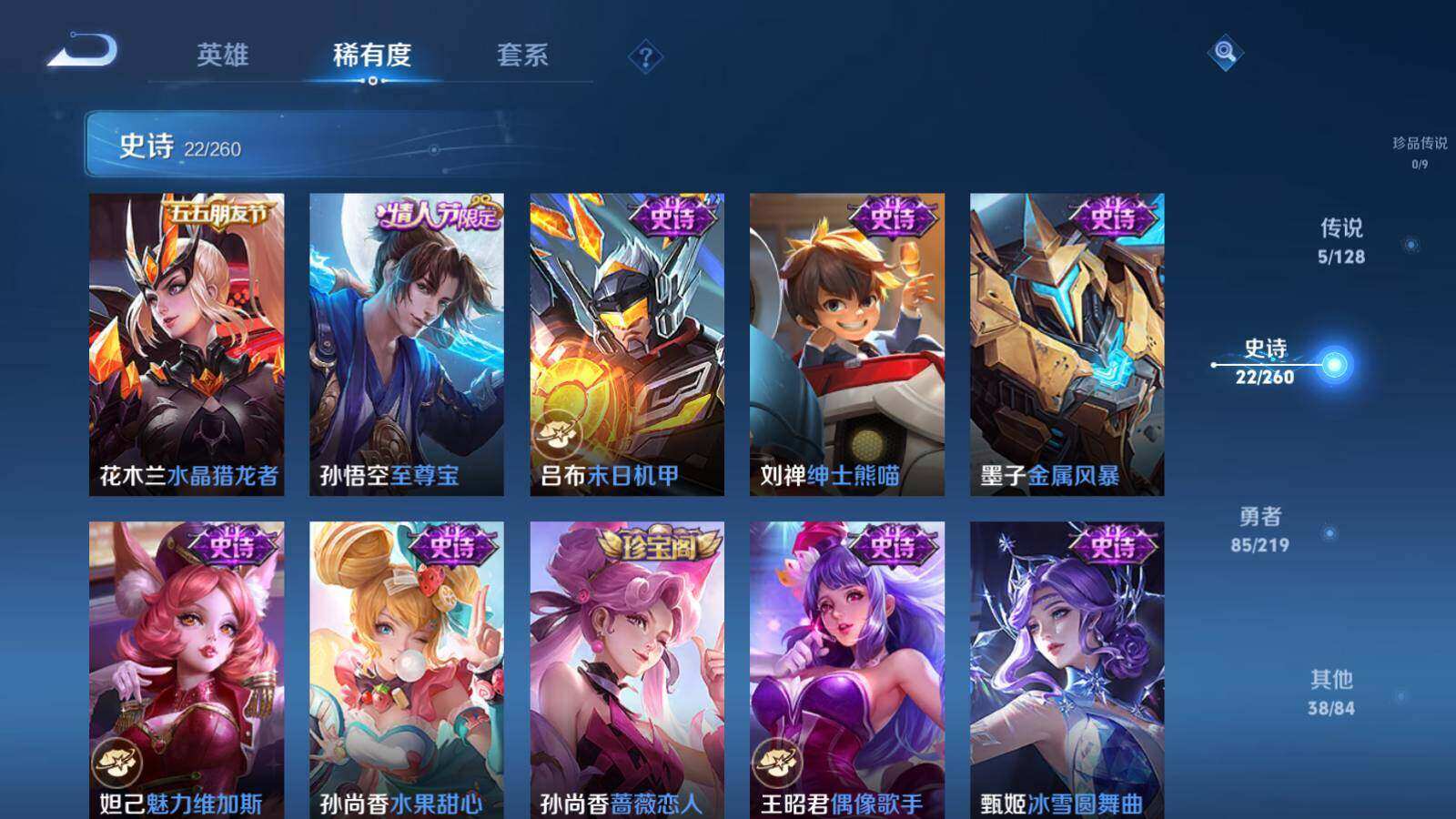 【史诗皮肤】:赵云皇家上将,貂蝉圣诞恋歌,甄姬冰雪圆舞曲,王昭君偶像歌手,孙尚香蔷薇恋人,孙尚香水果甜心,妲己魅力维加斯,墨子金属风暴,刘禅绅士熊喵,吕布末日机甲,孙悟空至尊宝,花木兰水晶猎龙者,夏侯惇乘风破浪,甄姬游园惊梦,雅典娜冰冠公主,百里守约特工魅影,蔡文姬舞动绿茵,李元芳逐浪之夏,狄仁杰鹰眼统帅,裴擒虎李小龙,司空震地狱燃心,阿古朵江河有灵