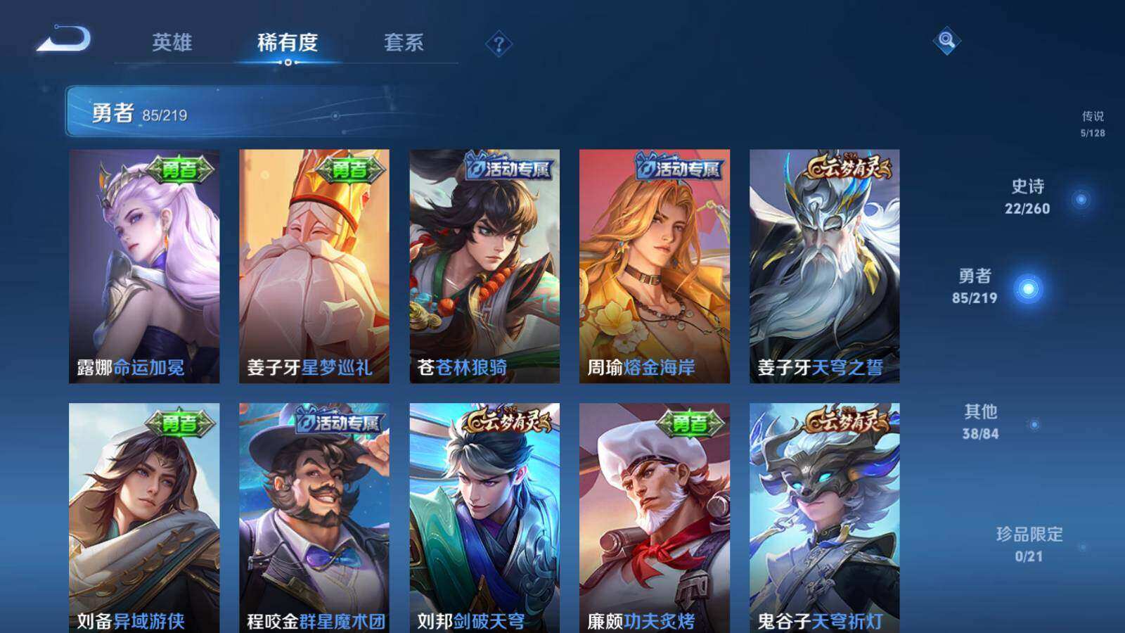 庄周蜃楼王,孙膑妖精王,扁鹊炼金王,虞姬凯尔特女王,白起狰,太乙真人饕餮,曹操烛龙,芈月重明,典韦穷奇,狂铁御狮,米莱狄御霄,牛魔御旌,夏侯惇朔风刀,明世隐疑决卦,老夫子醍醐杖,鬼谷子原初探秘者,狄仁杰万华元夜,程咬金演武夺筹,钟馗驱傩正仪,弈星混沌棋,达摩沙漠行僧,兰陵王金庭之子,沈梦溪大漠名商,李元芳云中旅人,桑启海盐诗旅,裴擒虎擒涛扼浪,鲁班大师探海日志,张良古海寻踪