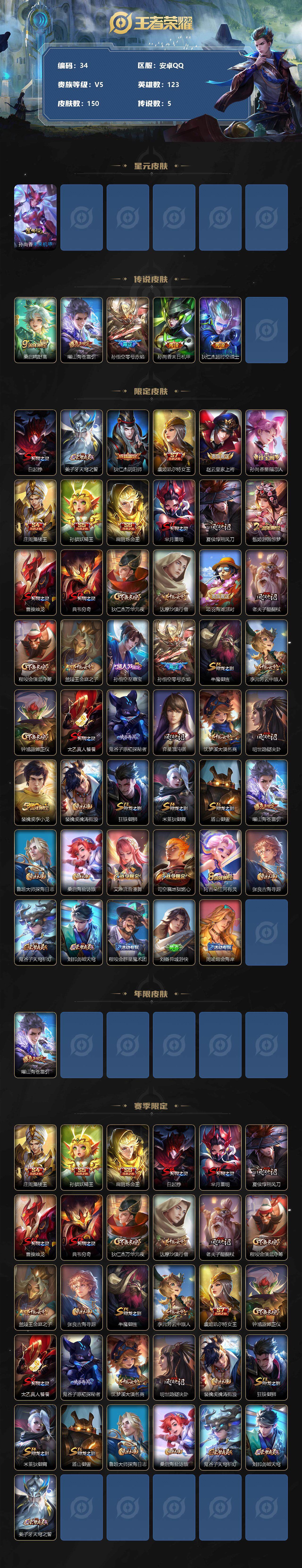 - [11520485]V7 2典藏 4传说 122英雄 270皮肤 可修改实名 荣耀水晶:鸣剑·曳影,弑枪猎影(韩信典藏) 传说皮:淬星耀世,山海·苍雷引(电光曜子) 珍宝阁皮:女武神,玩趣恶龙 限定皮:鸣野蒿,至尊宝,遇见飞天,匿光决锋者,五谷丰年,梁祝,天狼溯光者,李小龙,引擎之心,冰霜恋舞曲,枫霜尽 史诗皮:紫霞仙子,电玩小子(小书包),白龙吟,黄金分割率,特工魅影,千年之狐,永昼,江河有灵,高渐离燃音魔法,百解令(蒙犽),冰冠公主,偶像歌手,电玩·爆裂旋风,百相守梦(关羽),龙骑士(小龙虾),末日机甲-吕布,猫狗日记-孙策,猫狗日记-大乔,乱世虎臣,节奏热浪,女仆咖啡,摇滚巨星,水果甜心,绅士熊喵,天才门将,星夜王子,心灵骇客,功夫厨神,德古拉伯爵,暗隐猎兽者,幽灵船长,鬼剑武藏,心灵战警,舞动绿茵,纤云弄巧,繁星吟游(呼啦呼啦),拒霜思,缤纷独角兽,乘风破浪,逐浪之夏,水晶猎龙者,曙光守护者,箭羽风息,金属风暴,圣诞狂欢,圣诞恋歌,鹰眼统帅,暗夜贵公子,魅力维加斯,无心,未来纪元-赵云