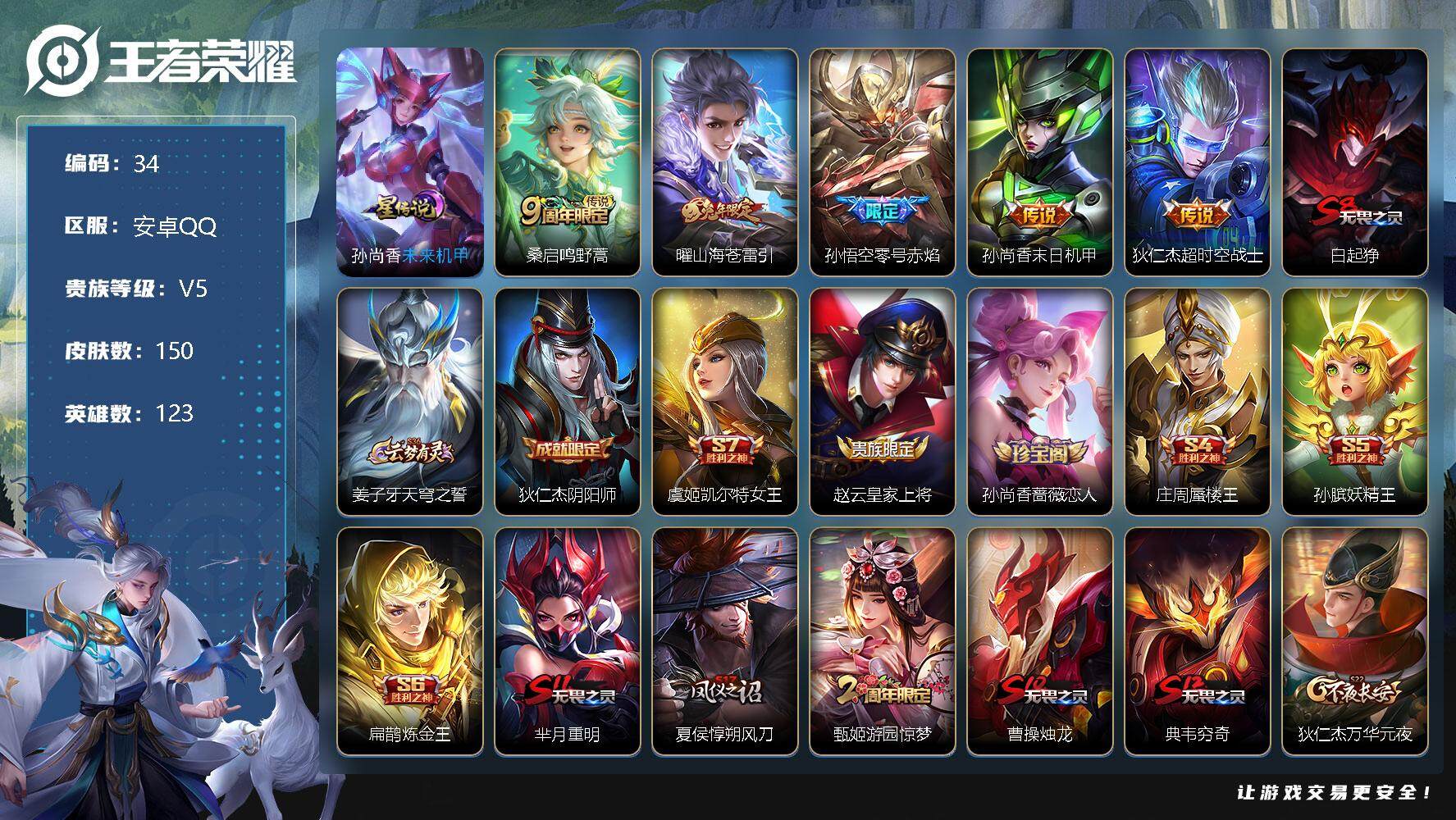 [12151453]MQ890-有二次-安卓Q-V5-荣耀黄金I段位-123英雄-150皮肤-5传说-22史诗 【传说皮肤】:桑启鸣野蒿,曜山海苍雷引,孙悟空零号赤焰,孙尚香末日机甲,狄仁杰超时空战士 【限定皮肤】:白起狰,姜子牙天穹之誓,狄仁杰阴阳师,虞姬凯尔特女王,赵云皇家上将,孙尚香蔷薇恋人,庄周蜃楼王,孙膑妖精王,扁鹊炼金王,芈月重明,夏侯惇朔风刀,甄姬游园惊梦,曹操烛龙,典韦穷奇,狄仁杰万华元夜,达摩沙漠行僧,项羽海滩派对,老夫子醍醐杖,程咬金演武夺筹,兰陵王金庭之子,孙悟空至尊宝,孙悟空零号赤焰,牛魔御旌,李元芳云中旅人,钟馗驱傩正仪,太乙真人饕餮,鬼谷子原初探秘者,弈星混沌棋,沈梦溪大漠名商,明世隐疑决卦,裴擒虎李小龙,裴擒虎擒涛扼浪,狂铁御狮,米莱狄御霄,盾山御銮,曜山海苍雷引,鲁班大师探海日志,桑启海盐诗旅,艾琳流音漫舞,司空震地狱燃心,阿古朵江河有灵,张良古海寻踪,鬼谷子天穹祈灯,刘邦剑破天穹,程咬金群星魔术团,刘备异域游侠,周瑜熔金海岸 【年限皮肤】:曜山海苍雷引 【赛季限定】:庄周蜃楼王,孙膑妖精王,扁鹊炼金王,白起狰,芈月重明,夏侯惇朔风刀,曹操烛龙,典韦穷奇,狄仁杰万华元夜,达摩沙漠行僧,老夫子醍醐杖,程咬金演武夺筹,兰陵王金庭之子,张良古海寻踪,牛魔御旌,李元芳云中旅人,虞姬凯尔特女王,钟馗驱傩正仪,太乙真人饕餮,鬼谷子原初探秘者,弈星混沌棋,沈梦溪大漠名商,明世隐疑决卦,裴擒虎擒涛扼浪,狂铁御狮,米莱狄御霄,盾山御銮,鲁班大师探海日志,桑启海盐诗旅,鬼谷子天穹祈灯,刘邦剑破天穹,姜子牙天穹之誓 【战令限定】:艾琳流音漫舞,司空震地狱燃心 【史诗皮肤】:赵云皇家上将,貂蝉圣诞恋歌,甄姬冰雪圆舞曲,王昭君偶像歌手,孙尚香蔷薇恋人,孙尚香水果甜心,妲己魅力维加斯,墨子金属风暴,刘禅绅士熊喵,吕布末日机甲,孙悟空至尊宝,花木兰水晶猎龙者,夏侯惇乘风破浪,甄姬游园惊梦,雅典娜冰冠公主,百里守约特工魅影,蔡文姬舞动绿茵,李元芳逐浪之夏,狄仁杰鹰眼统帅,裴擒虎李小龙,司空震地狱燃心,阿古朵江河有灵 【其他皮肤】:项羽海滩派对,韩信教廷特使,韩信街头霸王,阿轲致命风华,达摩大发明家,赵云忍炎影,扁鹊化身博士,宫本武藏未来纪元,妲己少女阿狸,典韦黄金武士,亚瑟死亡骑士,花木兰兔女郎,宫本武藏万象初新,狄仁杰阴阳师,庄周蜃楼王,刘备纽约教父,孙膑妖精王,刘备汉昭烈帝,李元