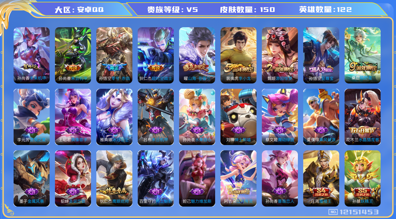 [12151453]MQ890-有二次-安卓Q-V5-荣耀黄金I段位-123英雄-150皮肤-5传说-22史诗