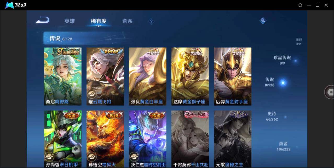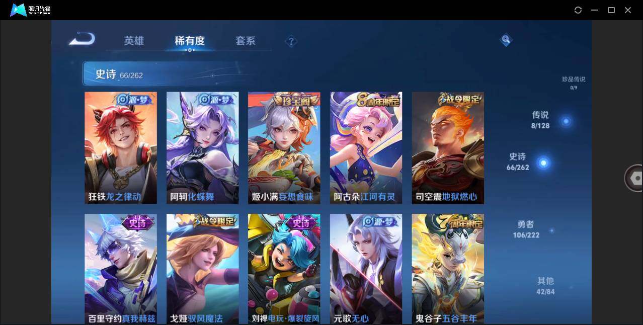 - [11795567]V7 1典藏 1珍品传说 8传说 123英雄 278皮肤 可修改实名 优质装备:鸣剑·曳影,怪盗基德,炽阳神光,一念神魔,涂山容容 传说皮:云诺千山,幻光神枪 珍宝阁皮:蔷薇恋人,女武神,玩趣恶龙 限定皮:愿照·九州拓(澜年限),愿照·山河定(司空震年限),逐霄战戟,鸣野蒿,异界灵契(白毛香),傲雪梅枪,遇见飞天,高山流水,五谷丰年,游园惊梦,梁祝,李小龙,大圣娶亲 史诗皮:鸭鸭历险记-刘禅,器灵·浮梦炉,狼魂孤将,绮世丹青,化蝶舞,星界战将,谪仙醉月,龙之律动,石田雨龙,茶境仙,破空之剑,蒙犽顽岩魄,百相守梦-百里守约,紫霞仙子,白龙吟,特工魅影,千年之狐,江河有灵,冰冠公主,青蛇,偶像歌手,暗夜猫娘,猫狗日记-孙策,时之恋人-孙尚香,节奏热浪,女仆咖啡,水果甜心,绅士熊喵,星夜王子,心灵骇客,德古拉伯爵,暗隐猎兽者,幽灵船长,鬼剑武藏,心灵战警,乐园奇幻夜,地狱岩魂,纤云弄巧,繁星吟游(呼啦呼啦),拒霜思,缤纷独角兽,乘风破浪,逐浪之夏,水晶猎龙者,曙光守护者,箭羽风息,金属风暴,圣诞狂欢,鹰眼统帅,魅力维加斯,黎明之约,未来纪元-赵云,玫瑰异探