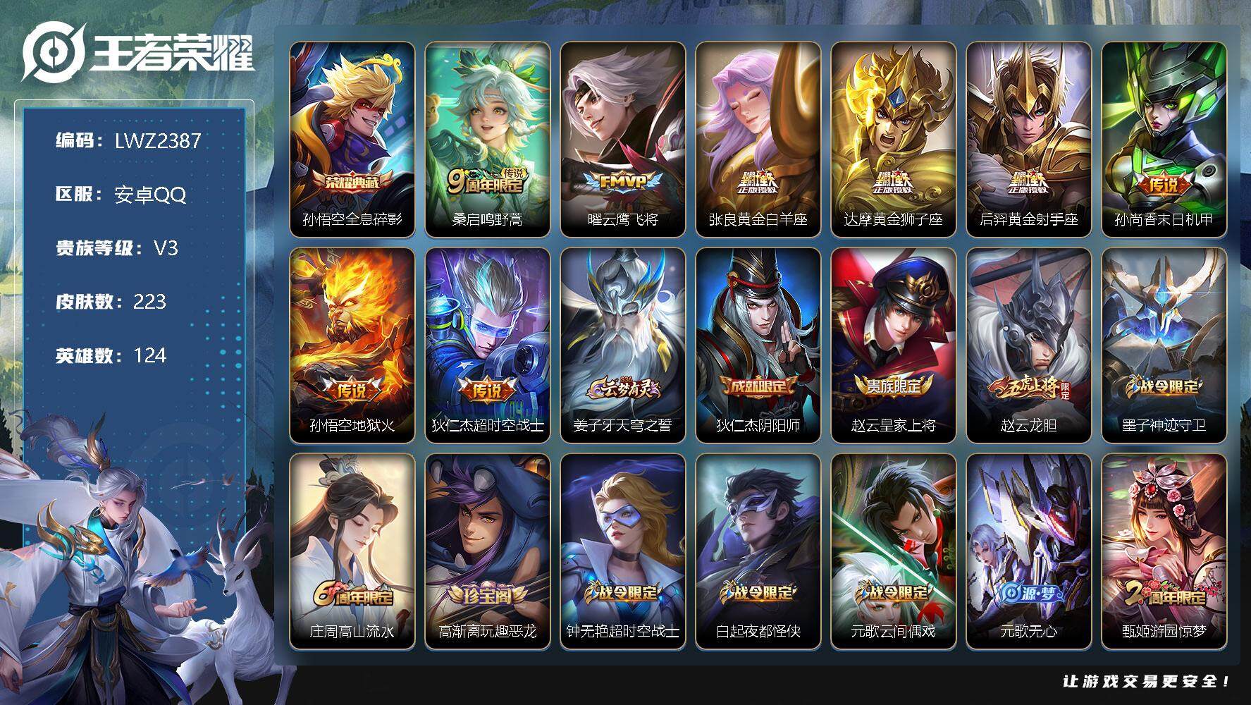 - [11688271]V8 2典藏 1无双 17传说 124英雄 250皮肤 可修改实名 优质装备:银白咏叹调(倪克斯侍卫),弑枪猎影(韩信典藏),碎月剑心(李白无双),黄金狮子座,云鹰飞将(小将军),一念神魔,零号·赤焰,地狱之眼,音你心动-周瑜,李逍遥,淬星耀世,惊梅引,遇见神鼓,澜逐花归海 传说皮:吕布曦玄引 珍宝阁皮:妄想食味,玩趣恶龙 限定皮:鸣野蒿,至尊宝,飞衡(韩信年限),诗剑行,怒海麟威,五谷丰年,青龙志(铠年限),武圣,梁祝,李小龙,辉光之辰,大圣娶亲 史诗皮:星界战将,蔬乡物语(鲁班七号),百相守梦-黄忠,紫霞仙子,苍穹之光,电玩小子(小书包),黄金分割率,特工魅影,千年之狐,江河有灵,魅语,高渐离燃音魔法,蒙恬荣光圣徽,无限星赏官,冰冠公主,偶像歌手,晚萤,电玩·爆裂旋风,末日机甲-吕布,猫狗日记-孙策,乱世虎臣,节奏热浪,修罗,女仆咖啡,摇滚巨星,水果甜心,天才门将,星夜王子,德古拉伯爵,暗隐猎兽者,幽灵船长,鬼剑武藏,心灵战警,舞动绿茵,地狱岩魂,纤云弄巧,乘风破浪,曙光守护者,箭羽风息,金属风暴,原初追逐者,圣诞狂欢,圣诞恋歌,鹰眼统帅,暗夜贵公子,魅力维加斯,黎明之约,无心,未来纪元-赵云