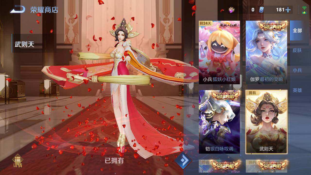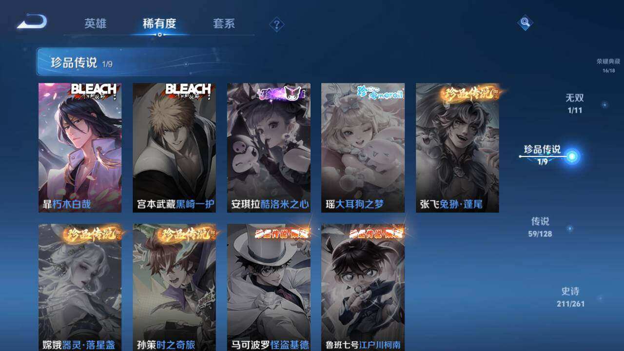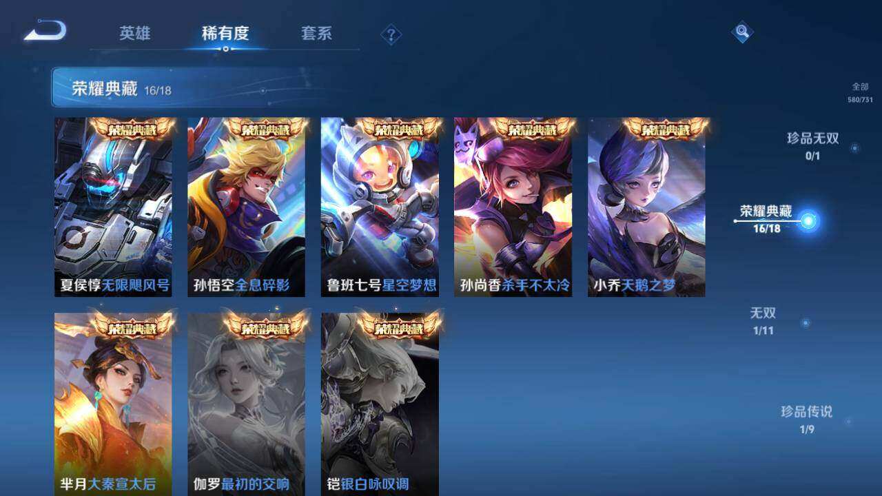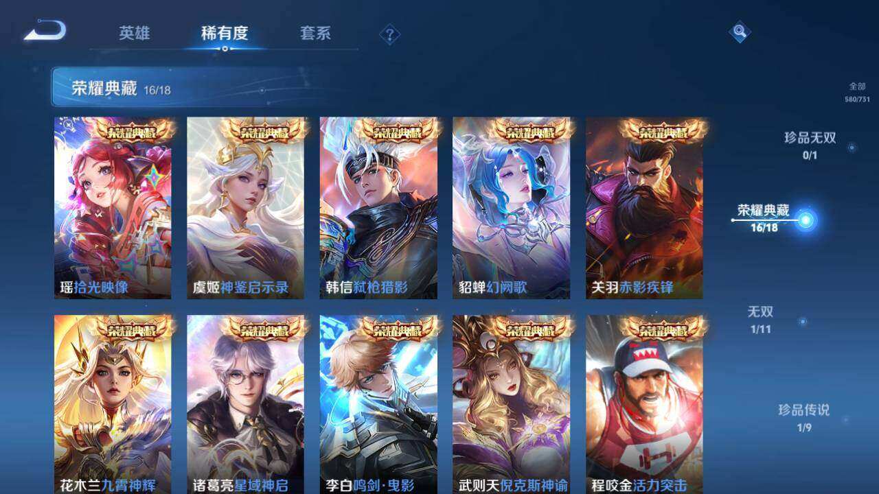【荣耀典藏】:武则天英雄,孙悟空全息碎影,武则天倪克斯神谕,夏侯惇无限飓风号,小乔天鹅之梦,孙尚香杀手不太冷,鲁班七号星空梦想,芈月大秦宣太后,程咬金活力突击,李白鸣剑曳影,诸葛亮星域神启,花木兰九霄神辉,关羽赤影疾锋,貂蝉幻阙歌,韩信弑枪猎影,虞姬神鉴启示录,瑶拾光映像