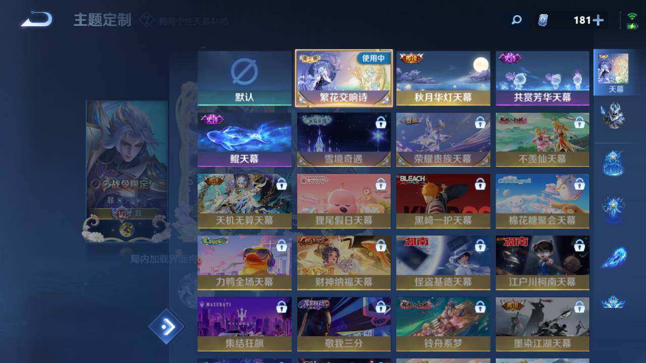 曹操烛龙,芈月重明,典韦穷奇,狂铁御狮,米莱狄御霄,牛魔御旌,夏侯惇朔风刀,明世隐疑决卦,老夫子醍醐杖,鬼谷子原初探秘者,狄仁杰万华元夜,程咬金演武夺筹,钟馗驱傩正仪,苏烈千军破阵,吕布猎兽之王,嬴政白昼王子,女娲朔望之晖,典韦蓝屏警告,钟馗神迹守卫,鲁班七号狮舞东方,沈梦溪星空之诺,李元芳银河之约,刘邦夺宝奇兵,马可波罗暗影游猎,蒙犽狂想玩偶喵,元歌云间偶戏,弈星混沌棋,达摩沙漠行僧,兰陵王金庭之子,沈梦溪大漠名商,李元芳云中旅人,桑启海盐诗旅,裴擒虎擒涛扼浪,鲁班大师探海日志,张良古海寻踪,项羽苍威无极,镜青焰无极