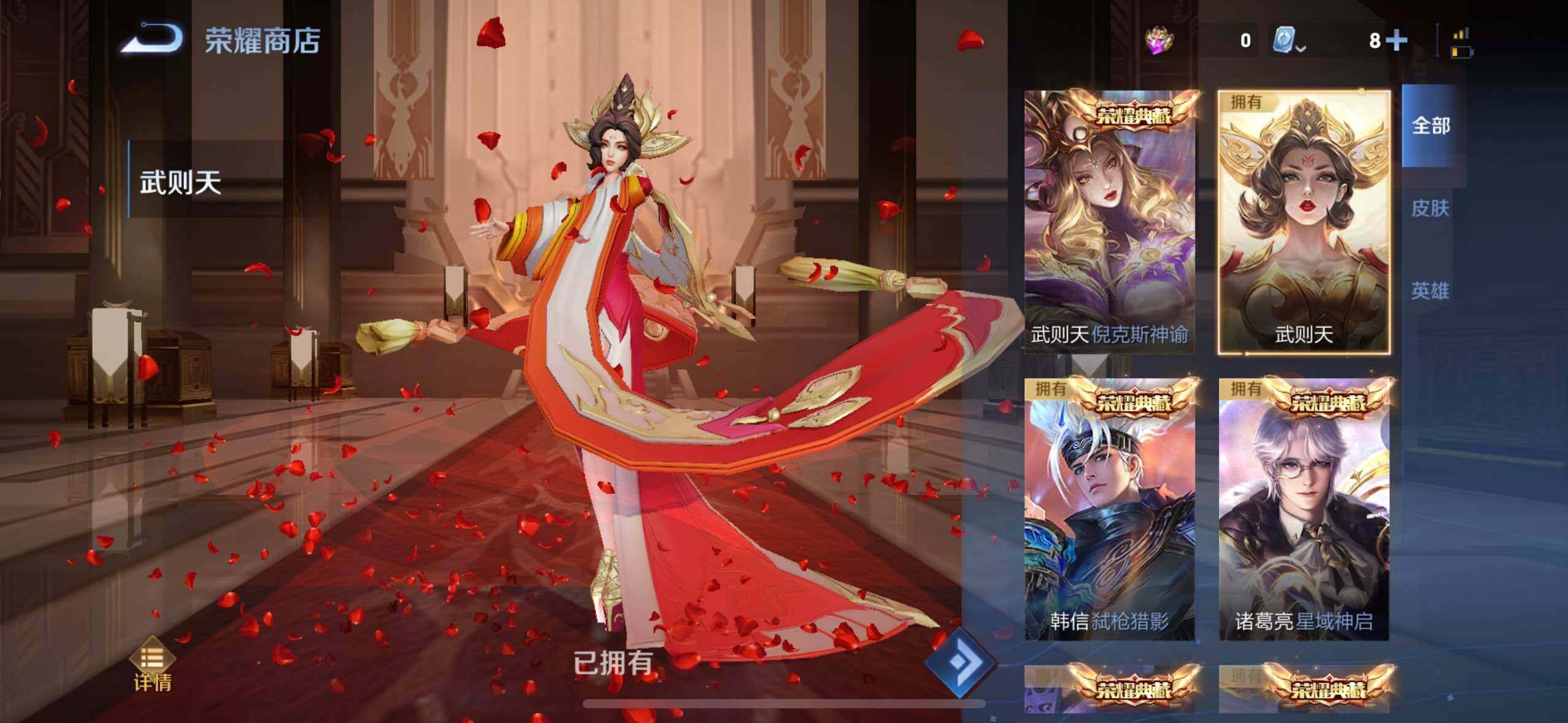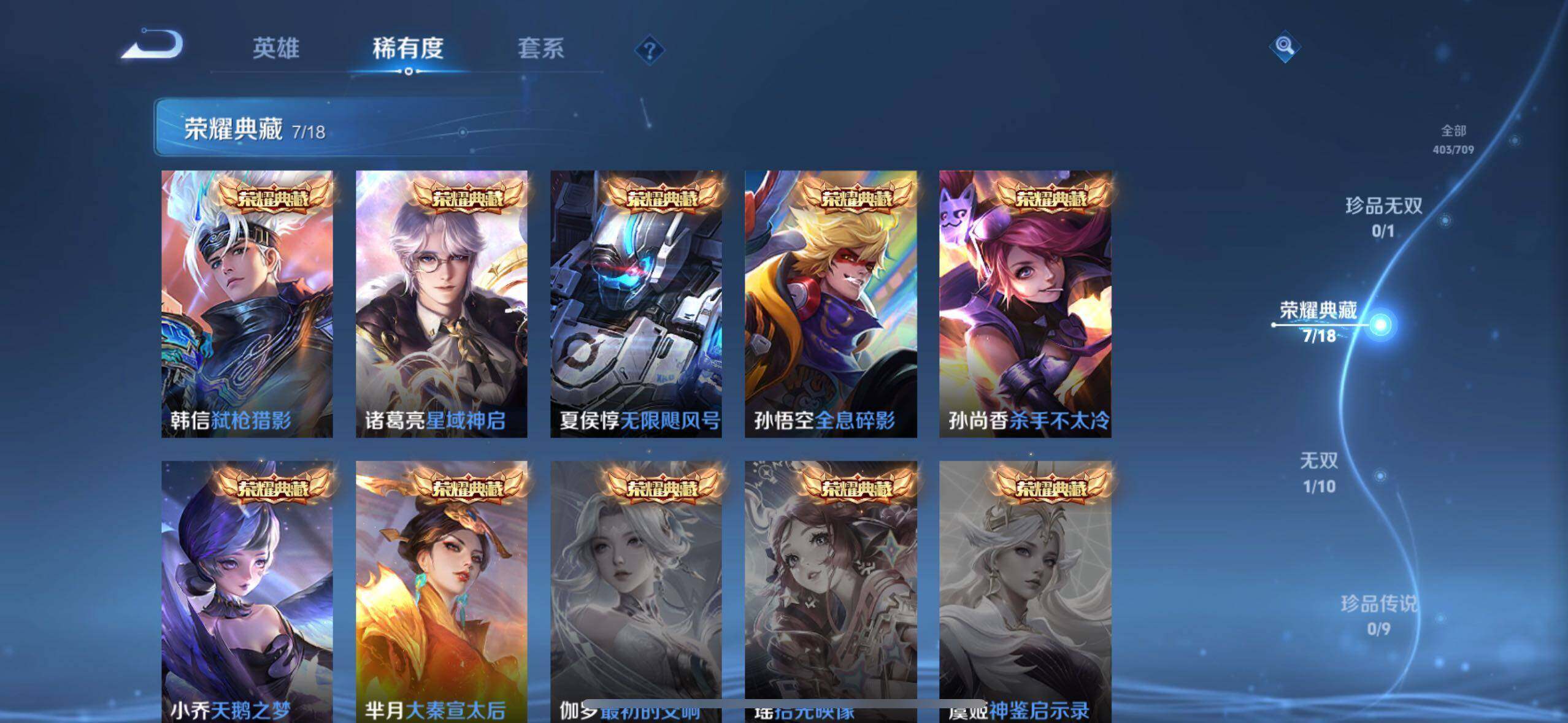 【荣耀典藏】:武则天英雄,孙悟空全息碎影,夏侯惇无限飓风号,小乔天鹅之梦,孙尚香杀手不太冷,芈月大秦宣太后,诸葛亮星域神启,韩信弑枪猎影
