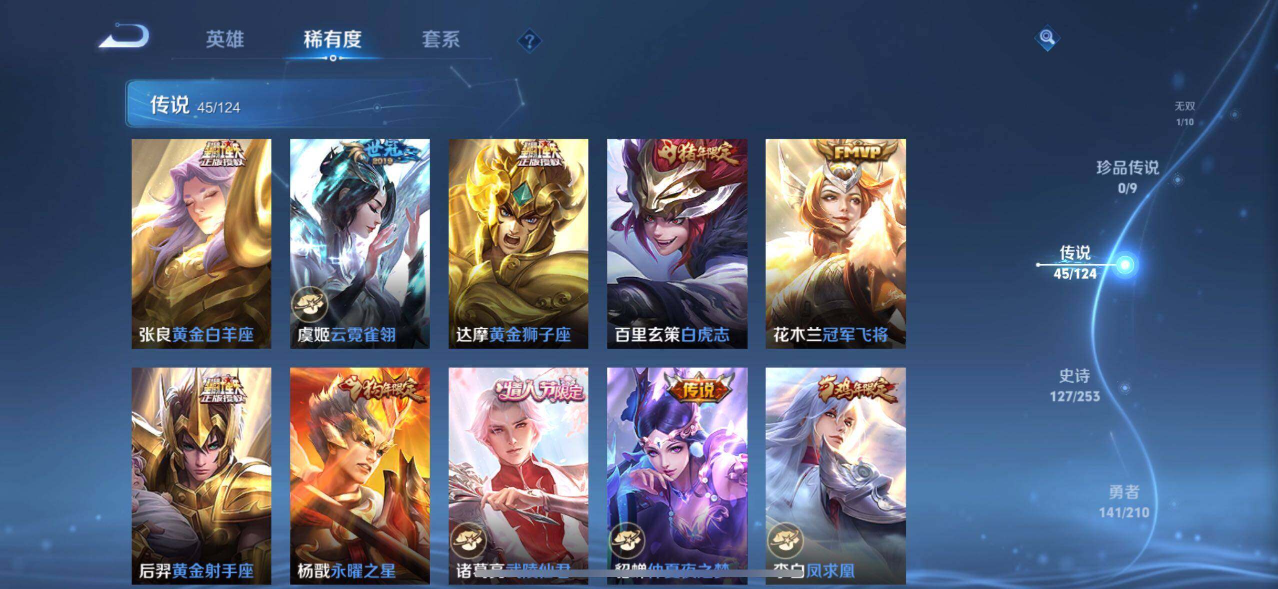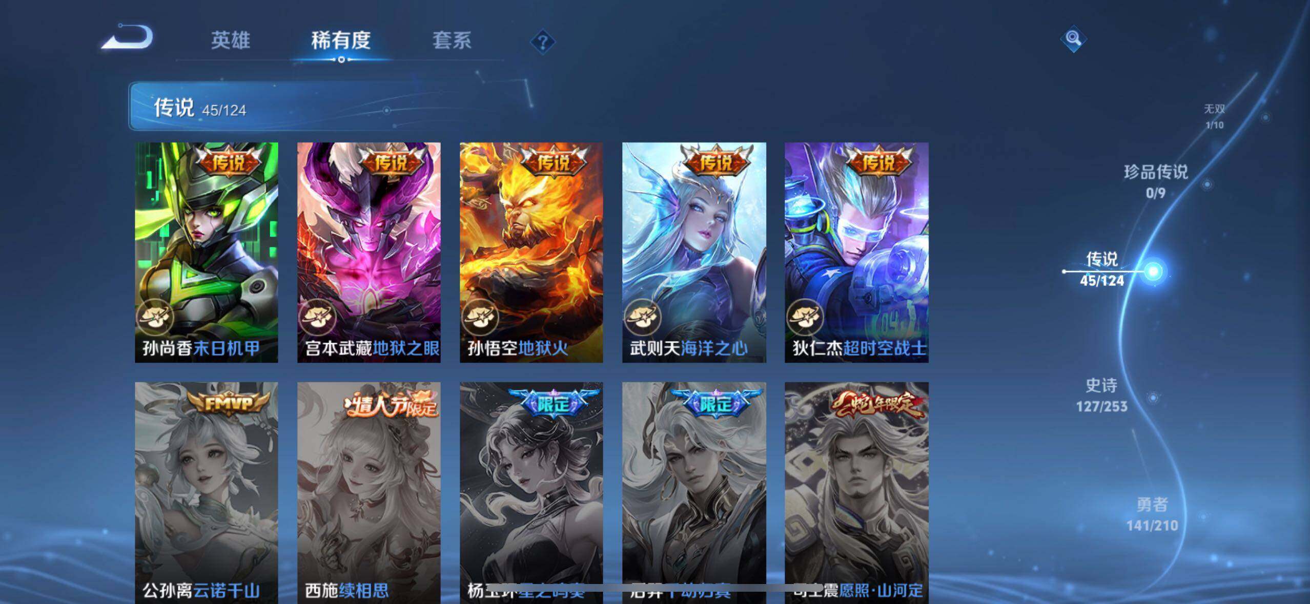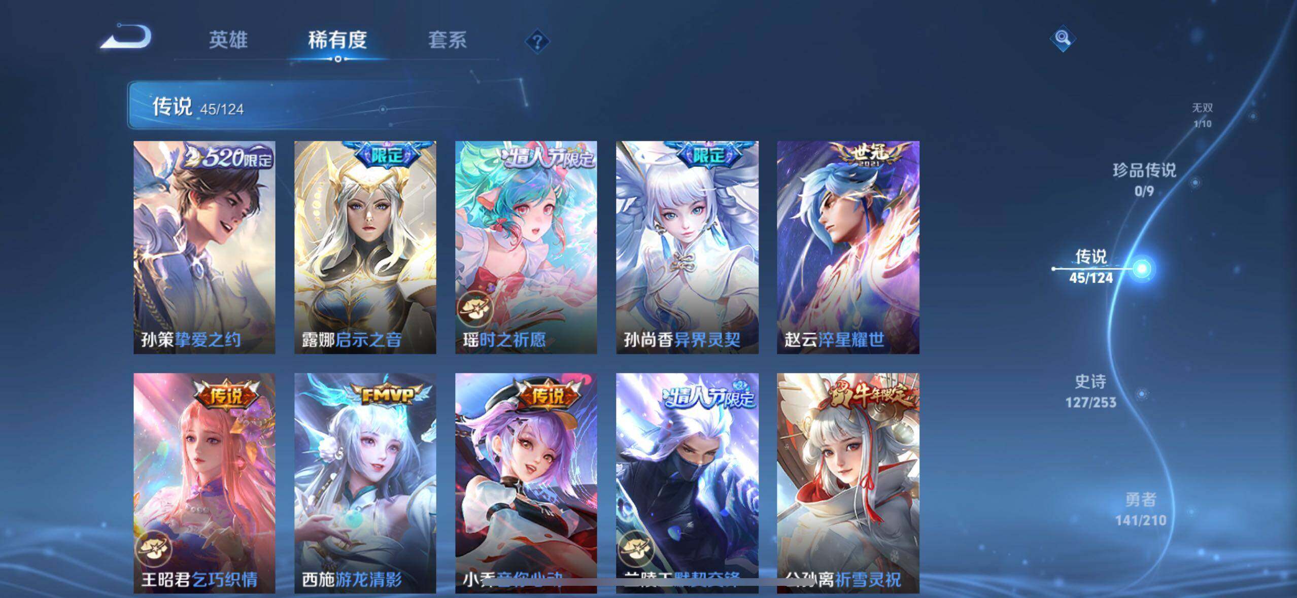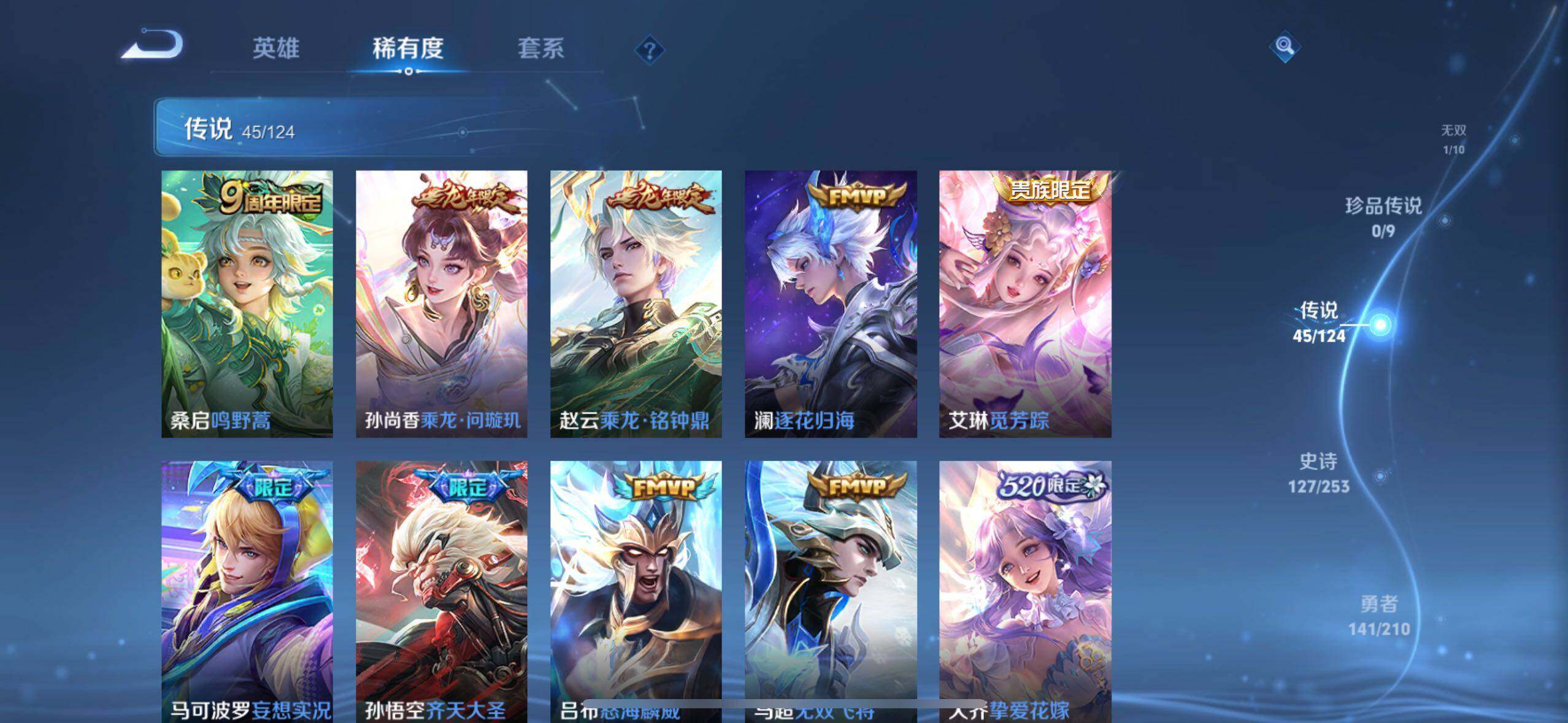 【传说皮肤】:桑启鸣野蒿,孙尚香乘龙问璇玑,赵云乘龙铭钟鼎,澜逐花归海,艾琳觅芳踪,马可波罗妄想实况,孙悟空齐天大圣,吕布怒海麟威,马超无双飞将,大乔挚爱花嫁,孙策挚爱之约,露娜启示之音,瑶时之祈愿,孙尚香异界灵契,赵云淬星耀世,王昭君乞巧织情,西施游龙清影,小乔音你心动,兰陵王默契交锋,公孙离祈雪灵祝,诸葛亮时雨天司,镜炽阳神光,虞姬启明星使,孙悟空零号赤焰,关羽武圣,曜云鹰飞将,李信一念神魔,刘备时之恋人,伽罗太华,貂蝉猫影幻舞,张良黄金白羊座,虞姬云霓雀翎,达摩黄金狮子座,百里玄策白虎志,花木兰冠军飞将,后羿黄金射手座,杨戬永曜之星,诸葛亮武陵仙君,貂蝉仲夏夜之梦,李白凤求凰,孙尚香末日机甲,宫本武藏地狱之眼,孙悟空地狱火,武则天海洋之心,狄仁杰超时空战士