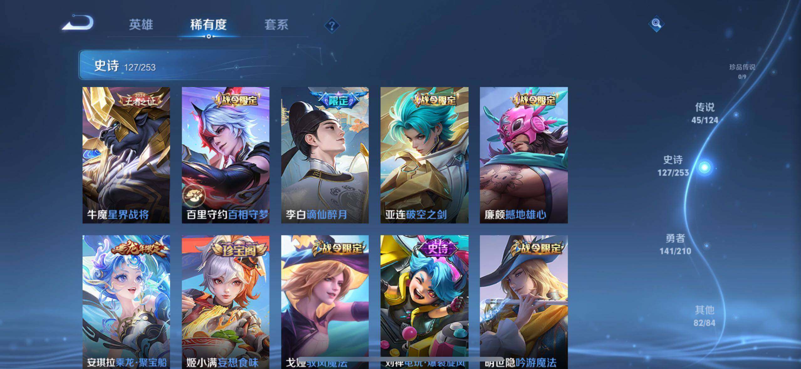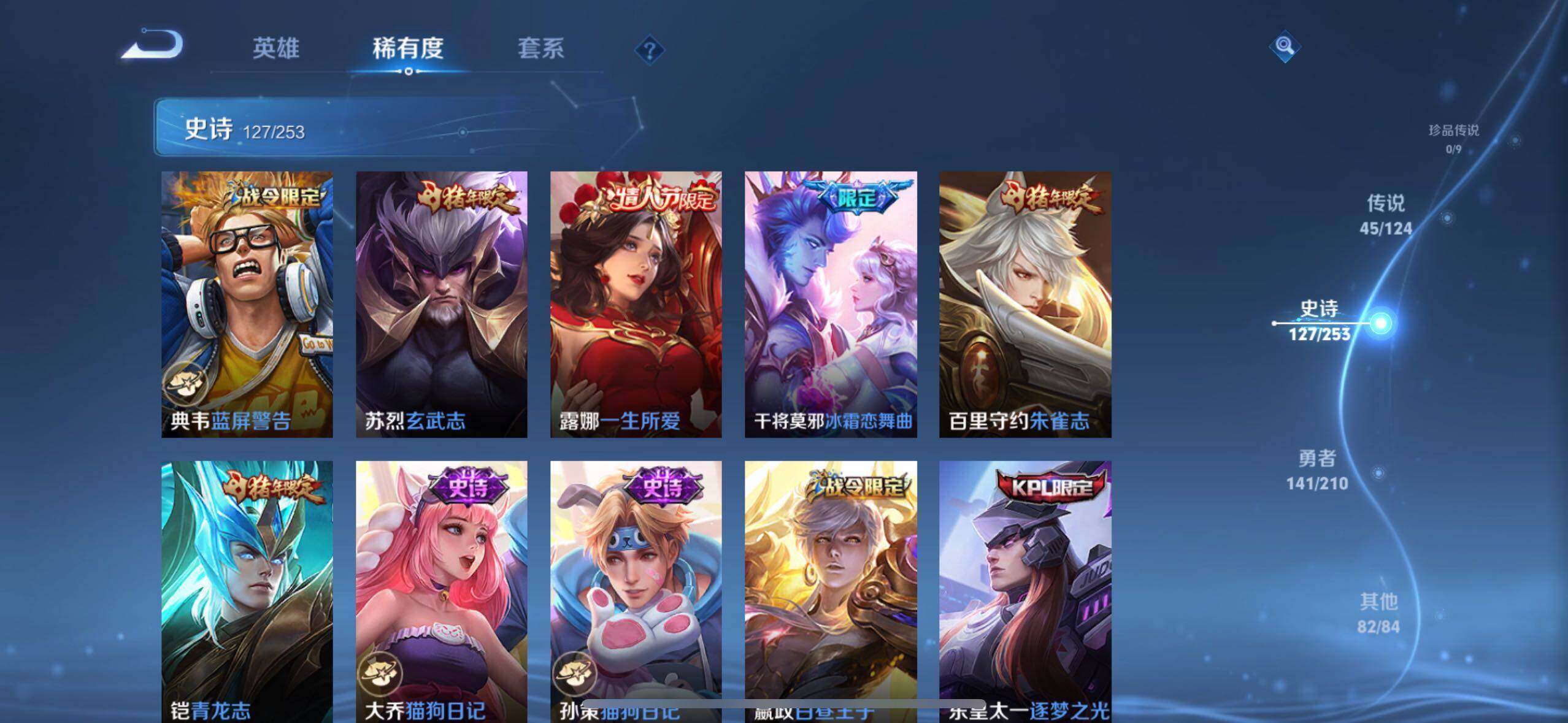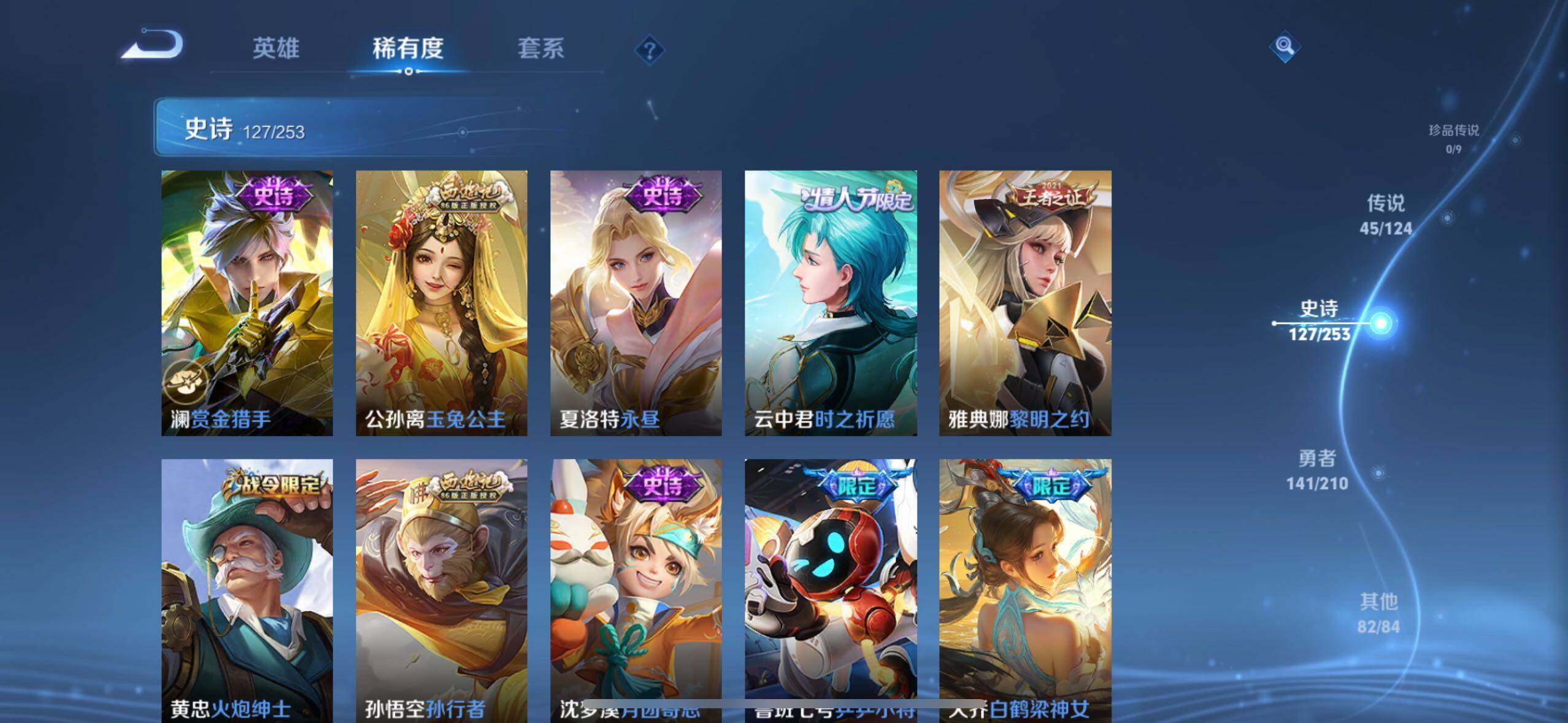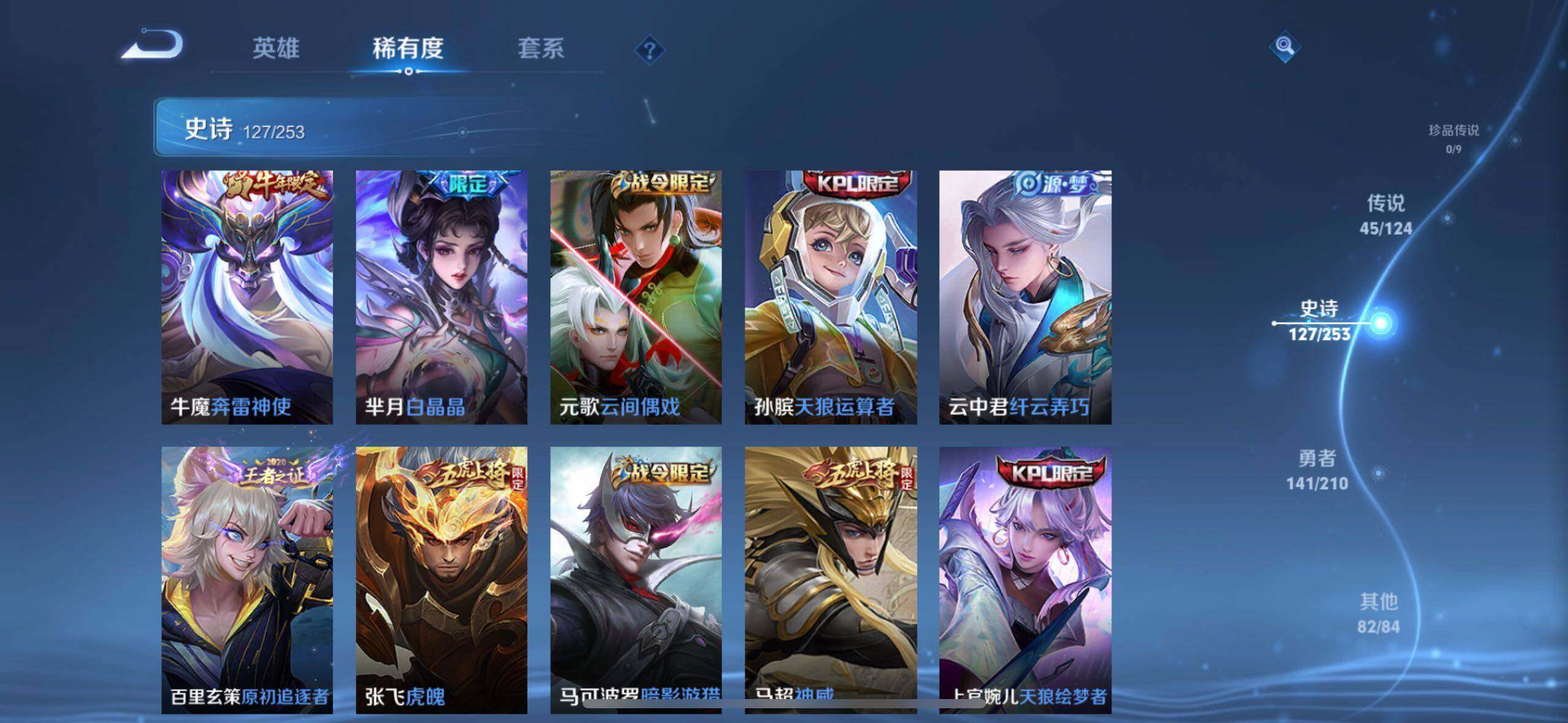 虞姬凯尔特女王,白起狰,太乙真人饕餮,曹操烛龙,芈月重明,典韦穷奇,狂铁御狮,米莱狄御霄,牛魔御旌,夏侯惇朔风刀,明世隐疑决卦,老夫子醍醐杖,鬼谷子原初探秘者,狄仁杰万华元夜,程咬金演武夺筹,钟馗驱傩正仪,吕布猎兽之王,嬴政白昼王子,女娲朔望之晖,典韦蓝屏警告,钟馗神迹守卫,鲁班七号狮舞东方,沈梦溪星空之诺,李元芳银河之约,刘邦夺宝奇兵,马可波罗暗影游猎,元歌云间偶戏,弈星混沌棋,达摩沙漠行僧,兰陵王金庭之子,沈梦溪大漠名商,李元芳云中旅人,桑启海盐诗旅,裴擒虎擒涛扼浪,鲁班大师探海日志,张良古海寻踪