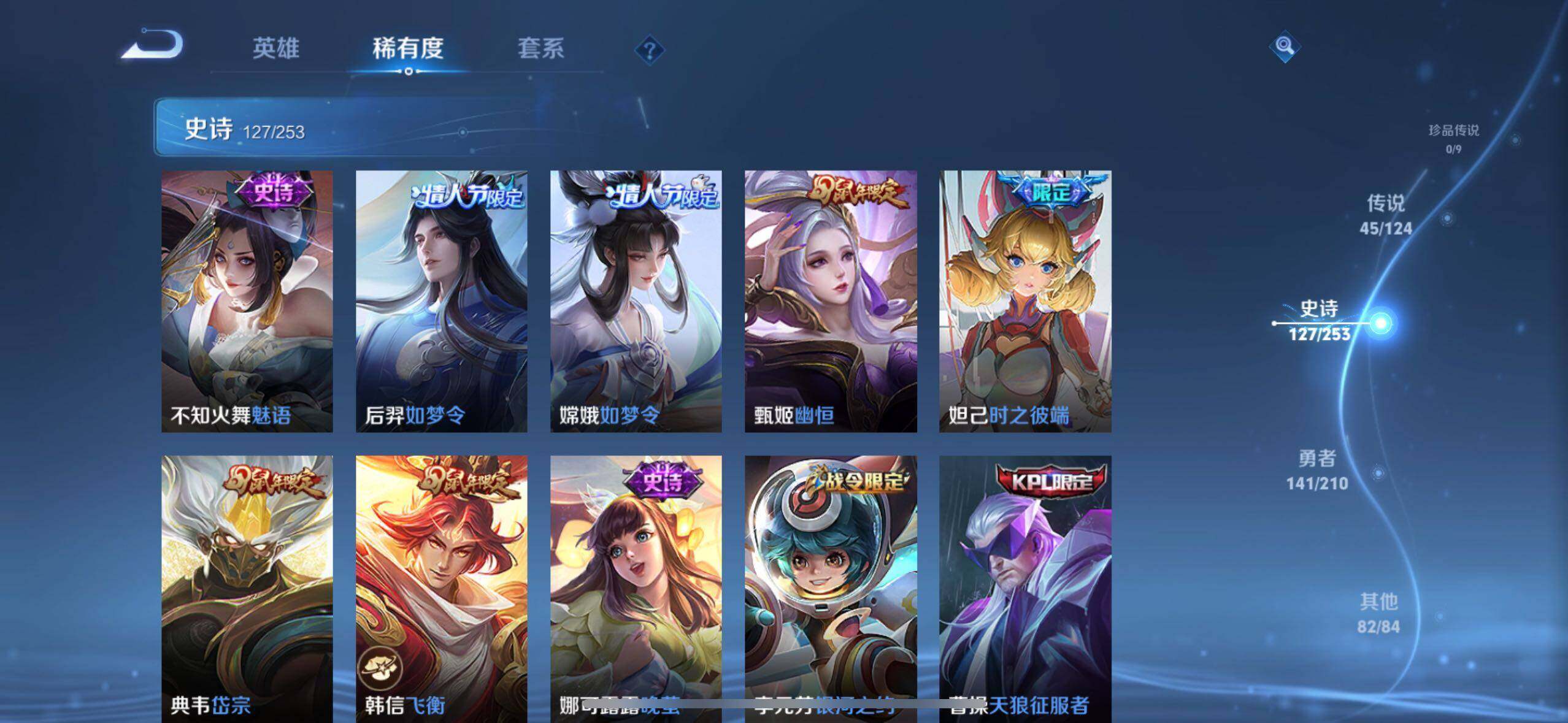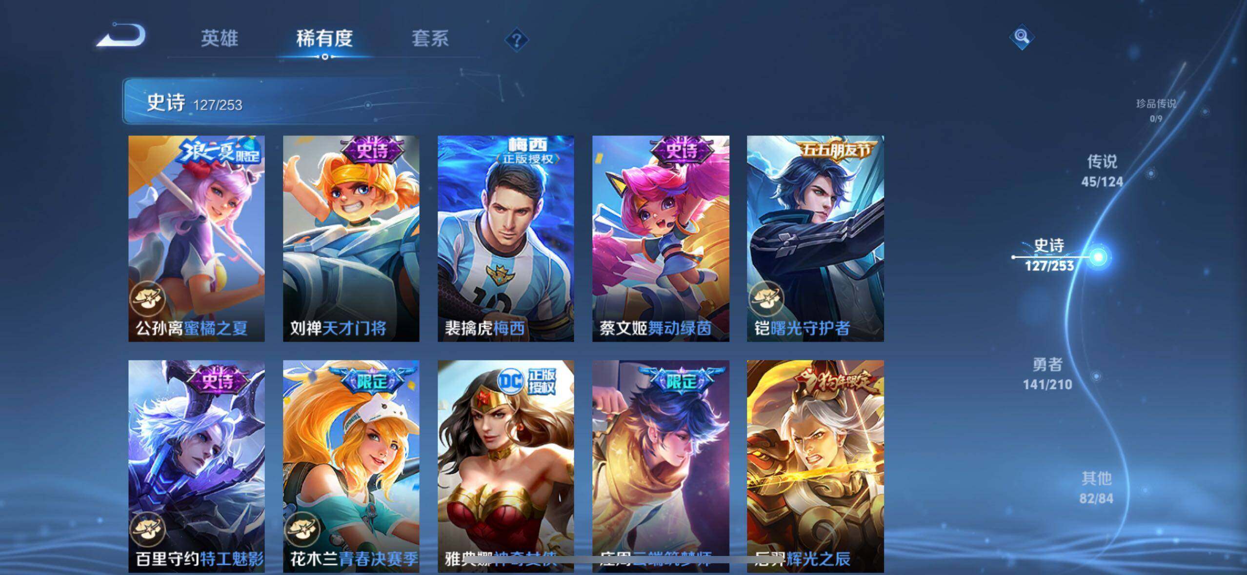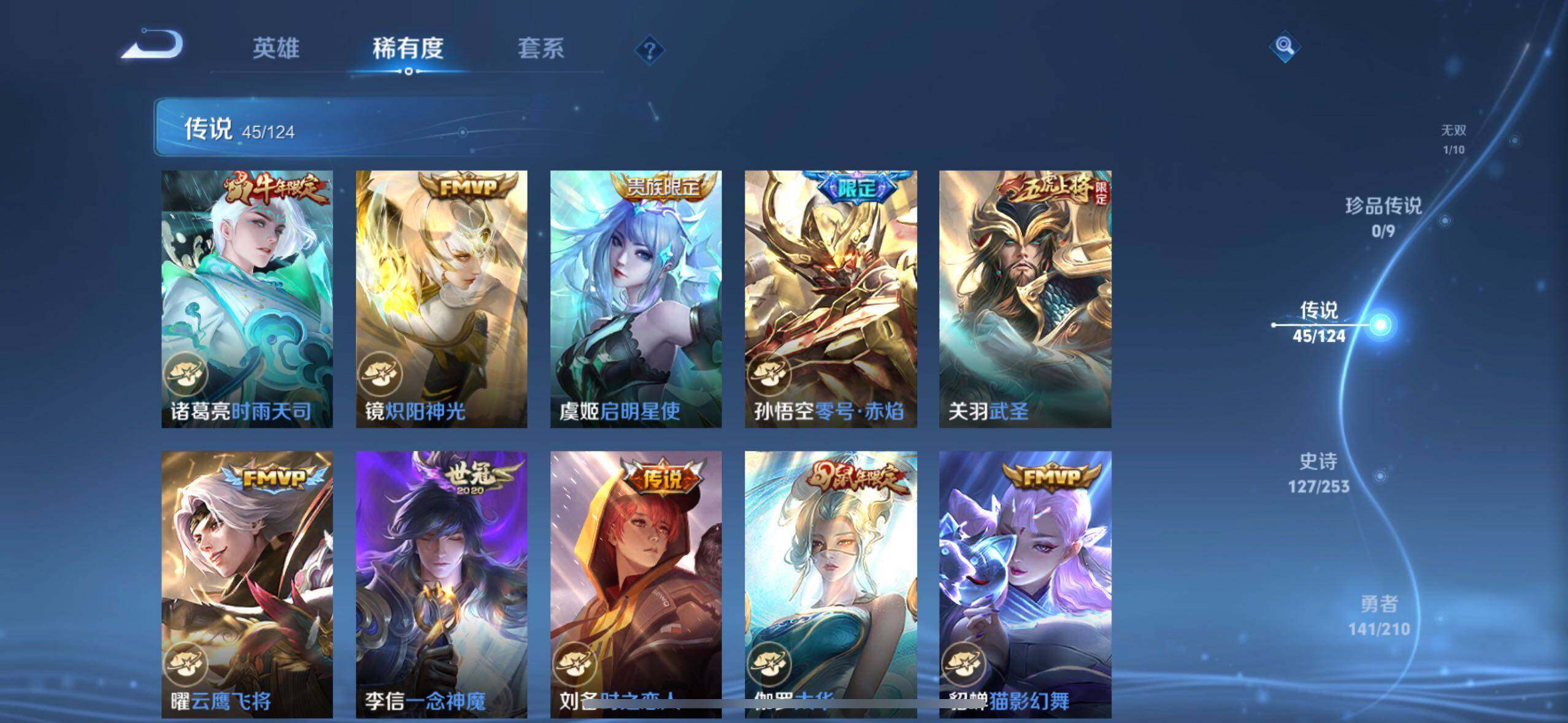 虞姬凯尔特女王,白起狰,太乙真人饕餮,曹操烛龙,芈月重明,典韦穷奇,狂铁御狮,米莱狄御霄,牛魔御旌,夏侯惇朔风刀,明世隐疑决卦,老夫子醍醐杖,鬼谷子原初探秘者,狄仁杰万华元夜,程咬金演武夺筹,钟馗驱傩正仪,吕布猎兽之王,嬴政白昼王子,女娲朔望之晖,典韦蓝屏警告,钟馗神迹守卫,鲁班七号狮舞东方,沈梦溪星空之诺,李元芳银河之约,刘邦夺宝奇兵,马可波罗暗影游猎,元歌云间偶戏,弈星混沌棋,达摩沙漠行僧,兰陵王金庭之子,沈梦溪大漠名商,李元芳云中旅人,桑启海盐诗旅,裴擒虎擒涛扼浪,鲁班大师探海日志,张良古海寻踪