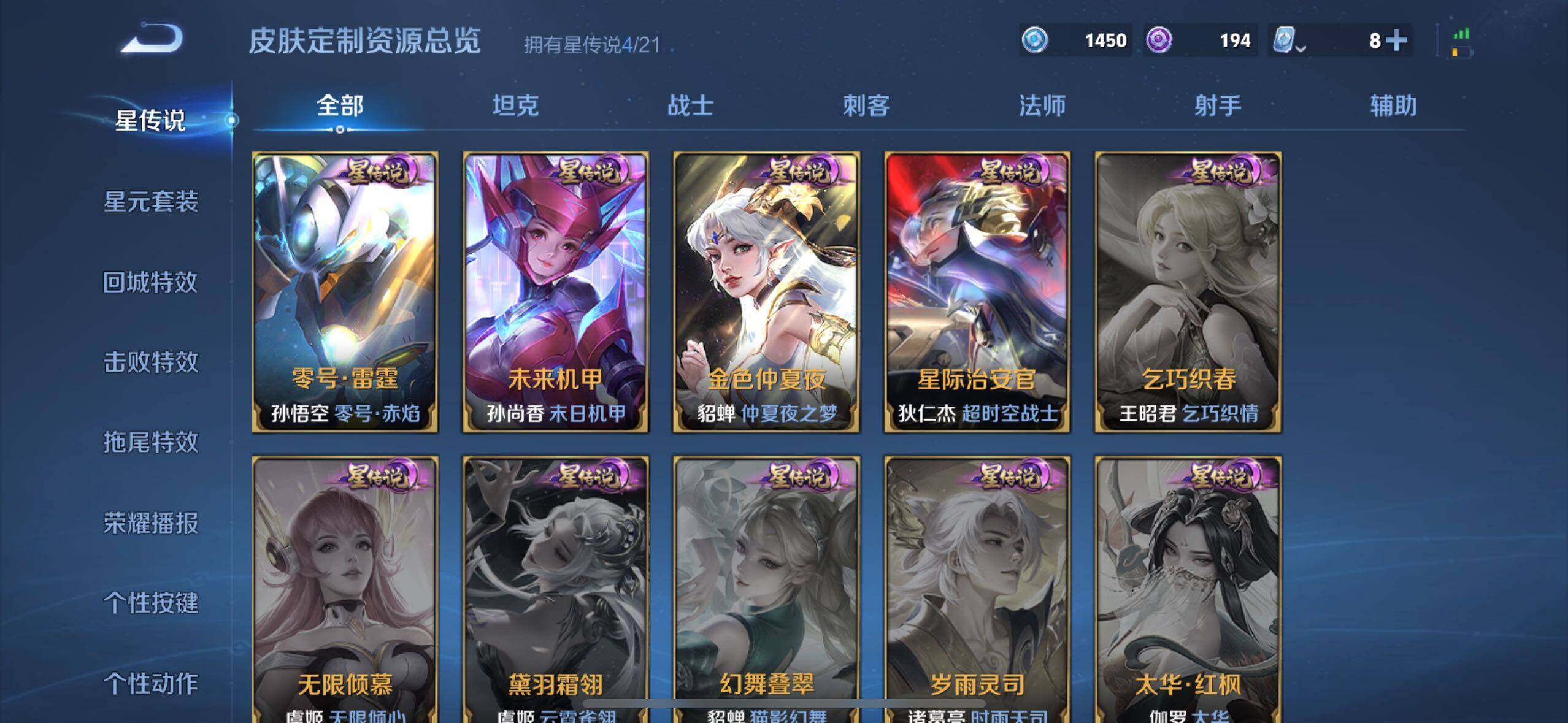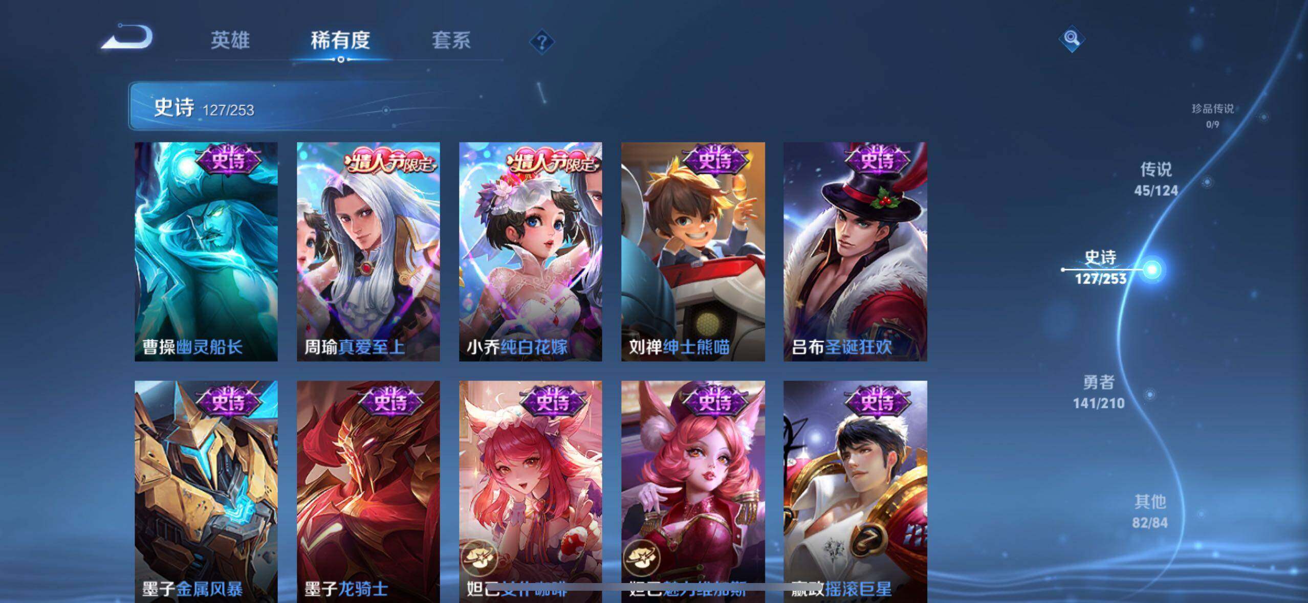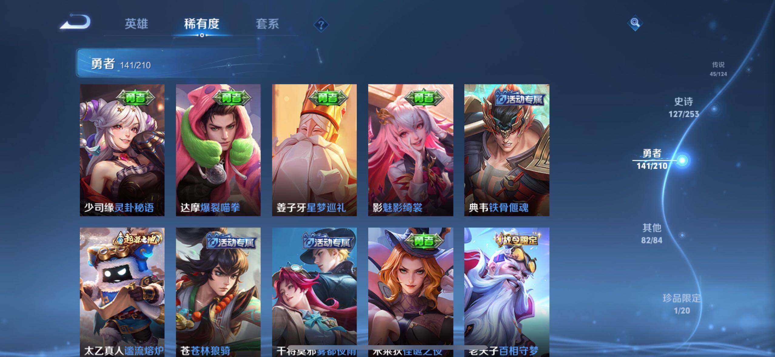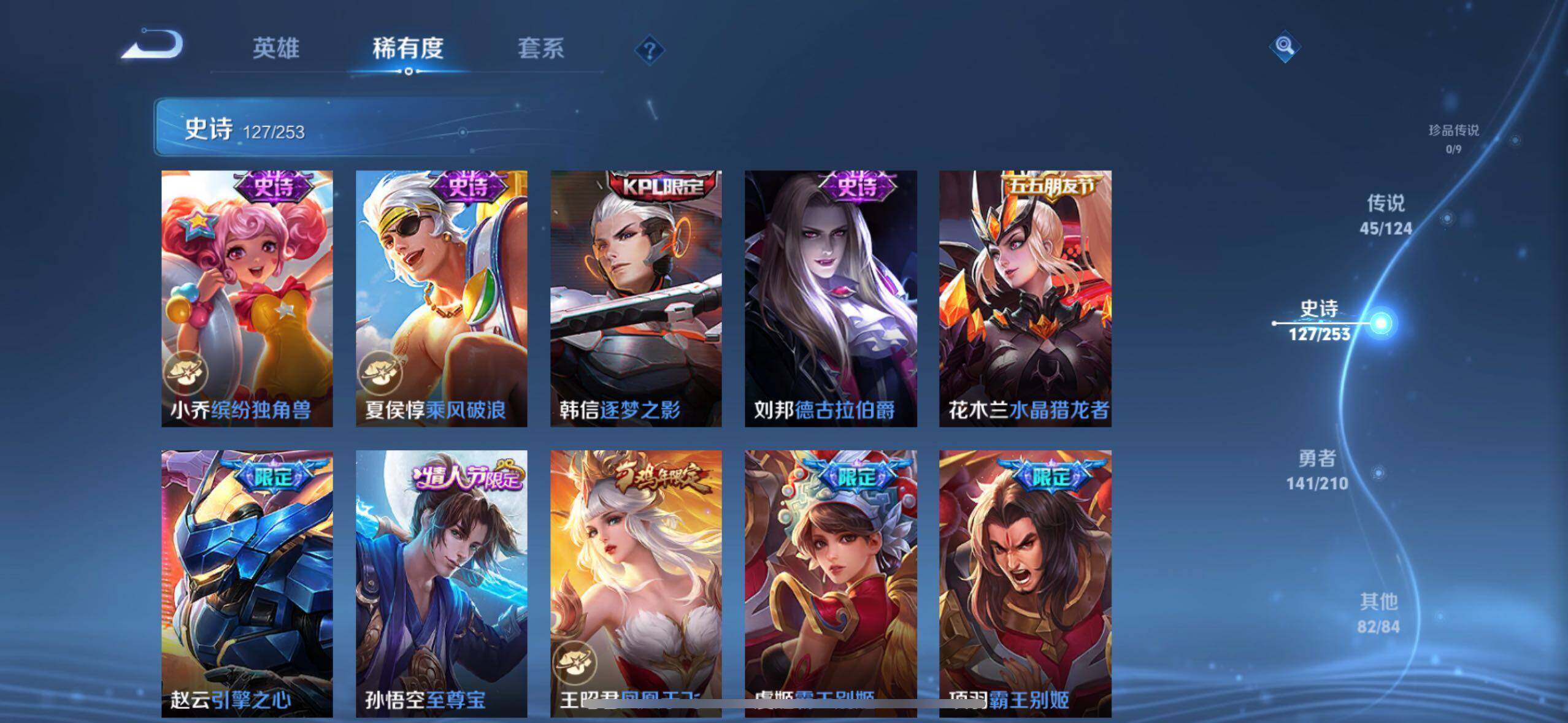 虞姬凯尔特女王,白起狰,太乙真人饕餮,曹操烛龙,芈月重明,典韦穷奇,狂铁御狮,米莱狄御霄,牛魔御旌,夏侯惇朔风刀,明世隐疑决卦,老夫子醍醐杖,鬼谷子原初探秘者,狄仁杰万华元夜,程咬金演武夺筹,钟馗驱傩正仪,吕布猎兽之王,嬴政白昼王子,女娲朔望之晖,典韦蓝屏警告,钟馗神迹守卫,鲁班七号狮舞东方,沈梦溪星空之诺,李元芳银河之约,刘邦夺宝奇兵,马可波罗暗影游猎,元歌云间偶戏,弈星混沌棋,达摩沙漠行僧,兰陵王金庭之子,沈梦溪大漠名商,李元芳云中旅人,桑启海盐诗旅,裴擒虎擒涛扼浪,鲁班大师探海日志,张良古海寻踪