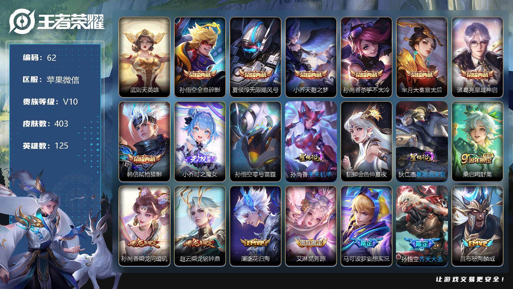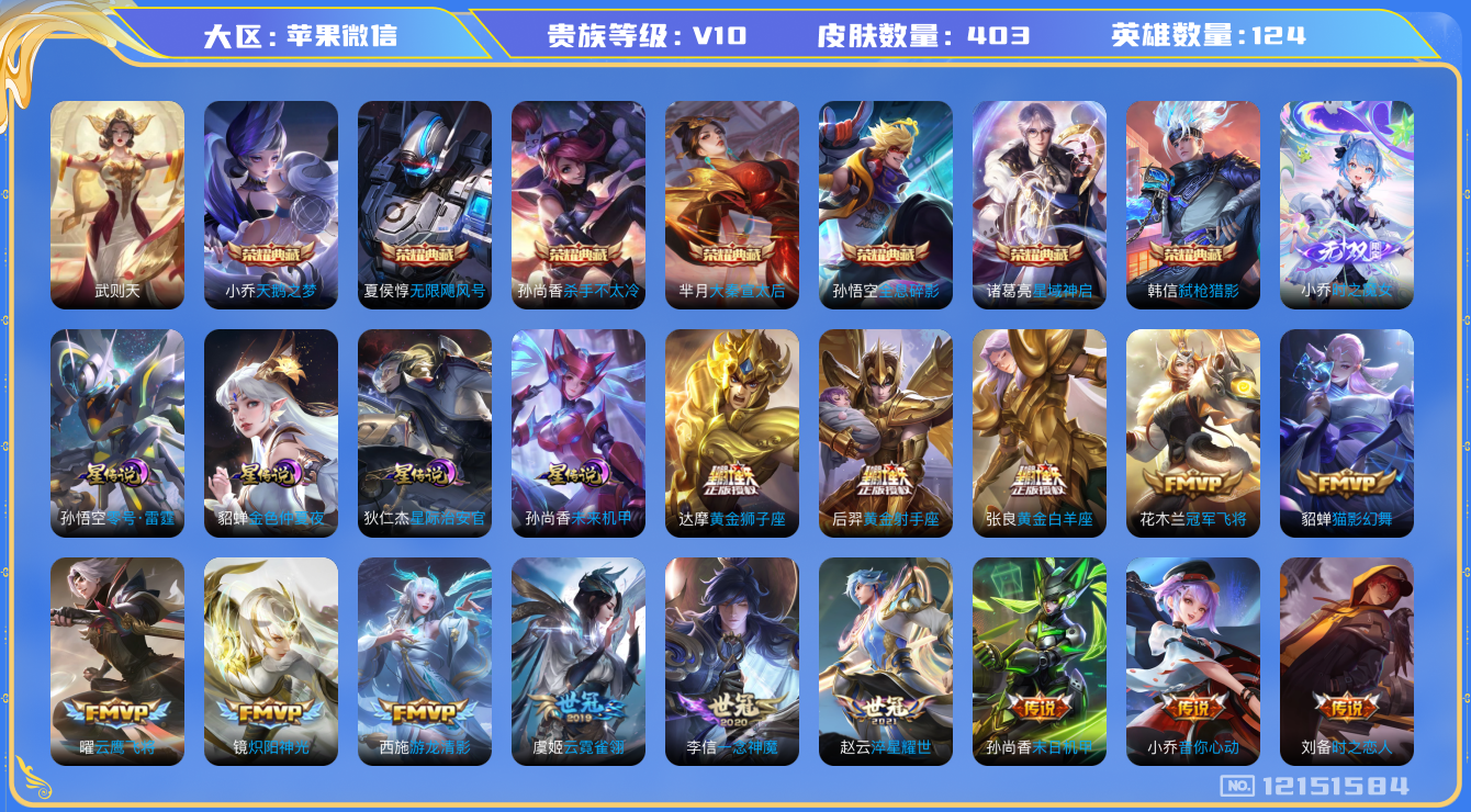 - [12299654]V8 1典藏 2珍品传说 17传说 124英雄 266皮肤 可修改实名 优质装备:鸣剑·曳影,酷洛米之心,大耳狗之梦,黄金狮子座,云鹰飞将(小将军),黄金白羊座,海洋之心,飞鸢探春,挚爱之约,无双飞将,山海·苍雷引(电光曜子),浮生妄,澜逐花归海,涂山容容 传说皮:乘龙·铭钟鼎(赵云年限),九山相柳 珍宝阁皮:万物之道,蔷薇恋人 限定皮:愿照·九州拓(澜年限),鸣野蒿,至尊宝,凤求凰(白切鸡),白晶晶,飞衡(韩信年限),遇见飞天,诗剑行,五谷丰年,李小龙,一生所爱,大圣娶亲,美猴王 史诗皮:鸭鸭历险记-刘禅,器灵·浮梦炉,化蝶舞,龙之律动,百相守梦-周瑜,茶境仙,幻珠鲛人,海诺心动手记,百相守梦-黄忠,织梦人,紫霞仙子,黄金分割率,特工魅影,千年之狐,江河有灵,高渐离燃音魔法,无限星赏官,冰冠公主,青蛇,偶像歌手,白蛇,电玩·爆裂旋风,暗夜猫娘,末日机甲-吕布,猫狗日记-孙策,猫狗日记-大乔,乱世虎臣,水果甜心,绅士熊喵,天才门将,心灵骇客,暗隐猎兽者,幽灵船长,鬼剑武藏,舞动绿茵,纤云弄巧,繁星吟游(呼啦呼啦),缤纷独角兽,乘风破浪,逐浪之夏,水晶猎龙者,曙光守护者,箭羽风息,金属风暴,原初追逐者,圣诞狂欢,圣诞恋歌,鹰眼统帅,无心,玫瑰异探