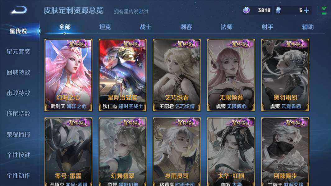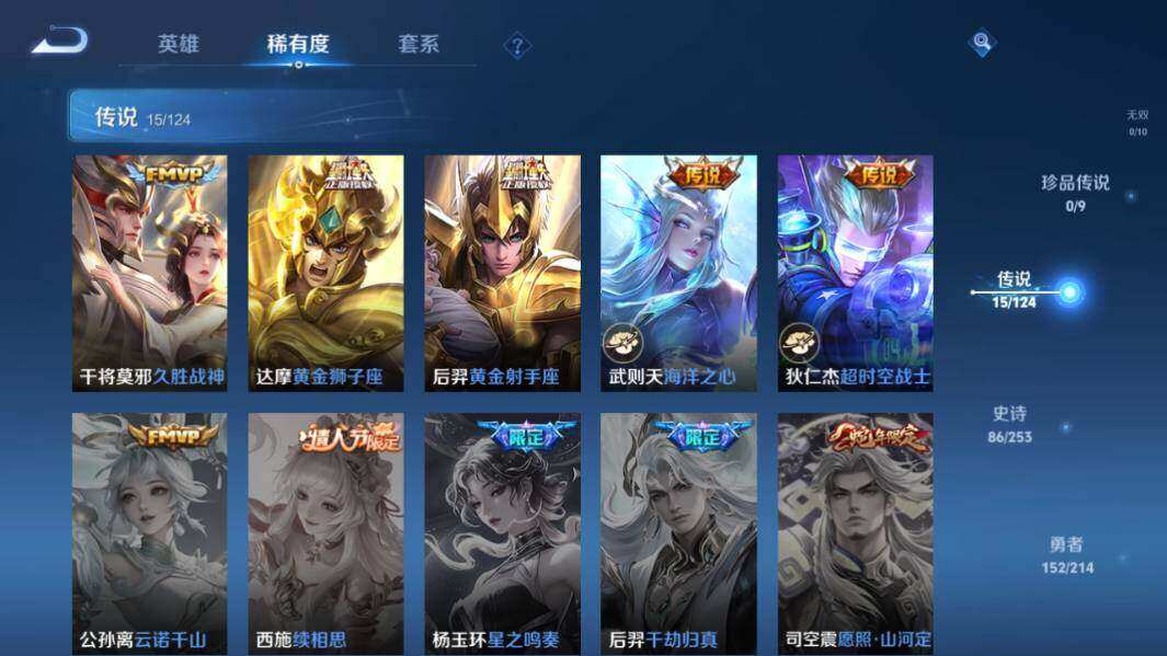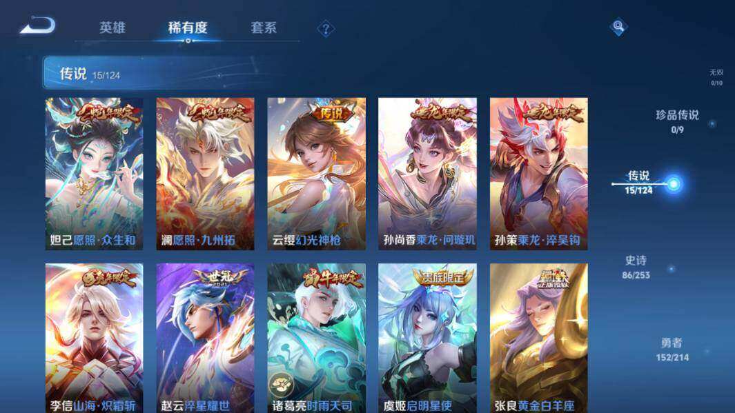 【传说皮肤】:妲己愿照众生和,澜愿照九州拓,云缨幻光神枪,孙尚香乘龙问璇玑,孙策乘龙淬吴钩,李信山海炽霜斩,赵云淬星耀世,诸葛亮时雨天司,虞姬启明星使,张良黄金白羊座,干将莫邪久胜战神,达摩黄金狮子座,后羿黄金射手座,武则天海洋之心,狄仁杰超时空战士