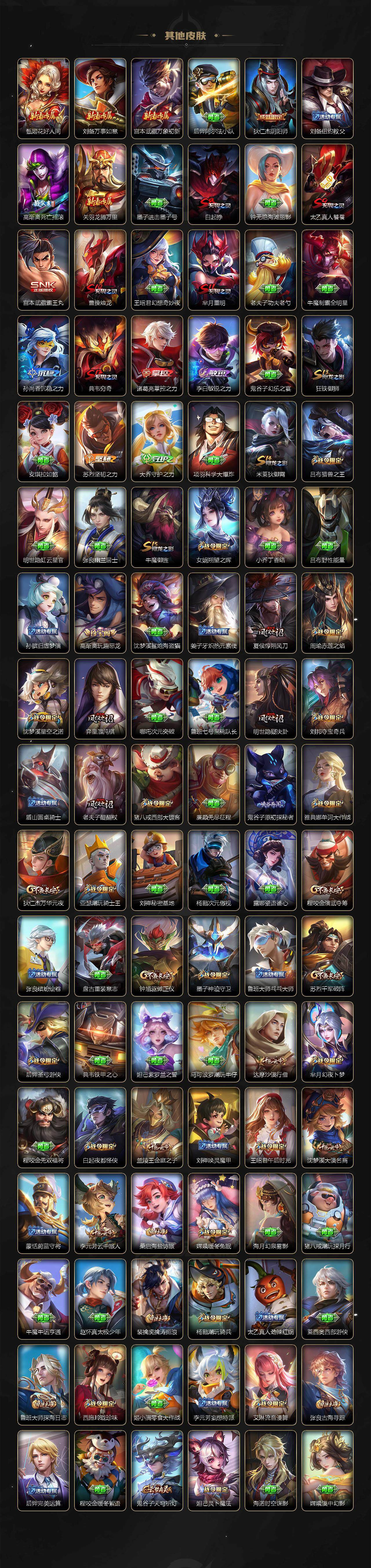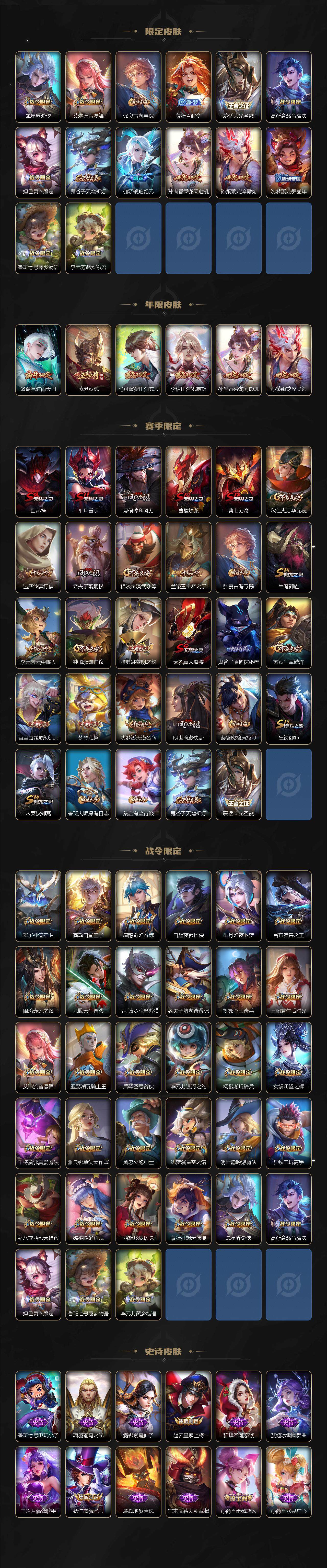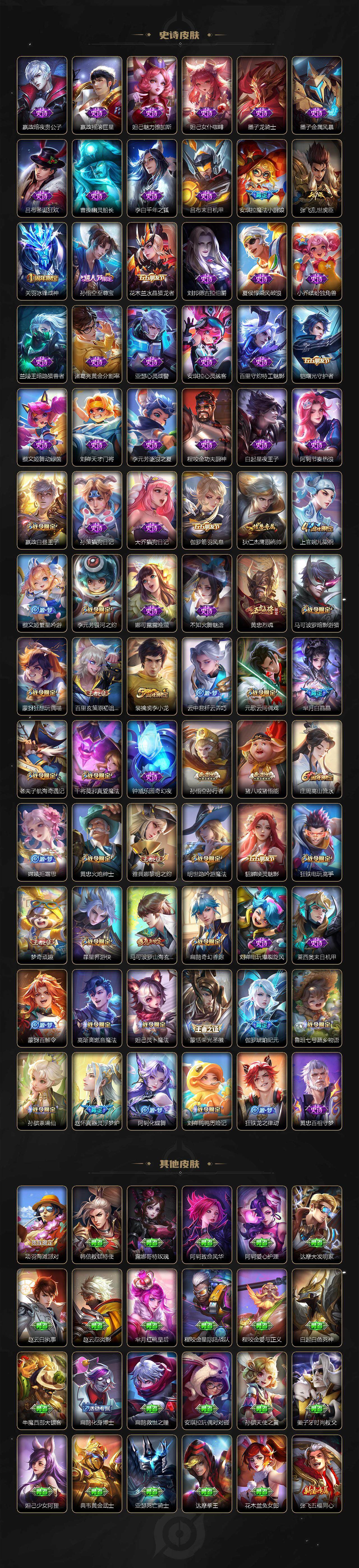 【限定皮肤】:白起狰,狄仁杰阴阳师,赵云皇家上将,墨子神迹守卫,嬴政白昼王子,孙尚香蔷薇恋人,庄周高山流水,高渐离死亡摇滚,高渐离玩趣恶龙,扁鹊奇幻香踪,白起夜都怪侠,芈月重明,芈月白晶晶,芈月幻夜卜梦,吕布猎兽之王,周瑜赤莲之焰,元歌云间偶戏,夏侯惇朔风刀,曹操烛龙,典韦穷奇,马可波罗暗影游猎,马可波罗山海玄木吟,狄仁杰魔术师,狄仁杰万华元夜,达摩沙漠行僧,项羽海滩派对,老夫子醍醐杖,老夫子航海奇遇记,关羽冰锋战神,安琪拉魔法小厨娘,程咬金演武夺筹,刘邦夺宝奇兵,王昭君午后时光,兰陵王金庭之子,亚瑟潮玩骑士王,孙悟空至尊宝,孙悟空孙行者,牛魔御旌,后羿圣弓游侠,李元芳银河之约,李元芳云中旅人,虞姬启明星使,钟馗驱傩正仪,杨戬潮玩骑兵,女娲朔望之晖,干将莫邪真爱魔法,雅典娜单词大作战,雅典娜黎明之约,蔡文姬繁星吟游,太乙真人饕餮,鬼谷子原初探秘者,诸葛亮时雨天司,黄忠烈魂,黄忠火炮绅士,苏烈千军破阵,百里玄策原初追逐者,弈星混沌棋,梦奇顽趣,沈梦溪星空之诺,沈梦溪大漠名商,明世隐疑决卦,明世隐吟游魔法,裴擒虎李小龙,裴擒虎擒涛扼浪,狂铁御狮,狂铁电玩高手,米莱狄御霄,云中君纤云弄巧,李信山海炽霜斩,猪八戒西部大镖客,猪八戒猪悟能,上官婉儿梁祝,嫦娥拒霜思,嫦娥暖冬兔眠,西施玲珑珍味,蒙犽狂想玩偶喵,鲁班大师探海日志,桑启海盐诗旅,暃星界游侠,艾琳流音漫舞,张良古海寻踪,蒙犽百解令,蒙恬荣光圣徽,高渐离燃音魔法,妲己灵卜魔法,鬼谷子天穹祈灯,伽罗琥珀纪元,孙尚香乘龙问璇玑,孙策乘龙淬吴钩,沈梦溪龙舞盛年,鲁班七号蔬乡物语,李元芳蔬乡物语