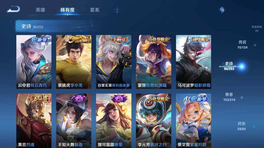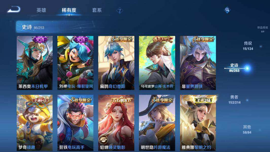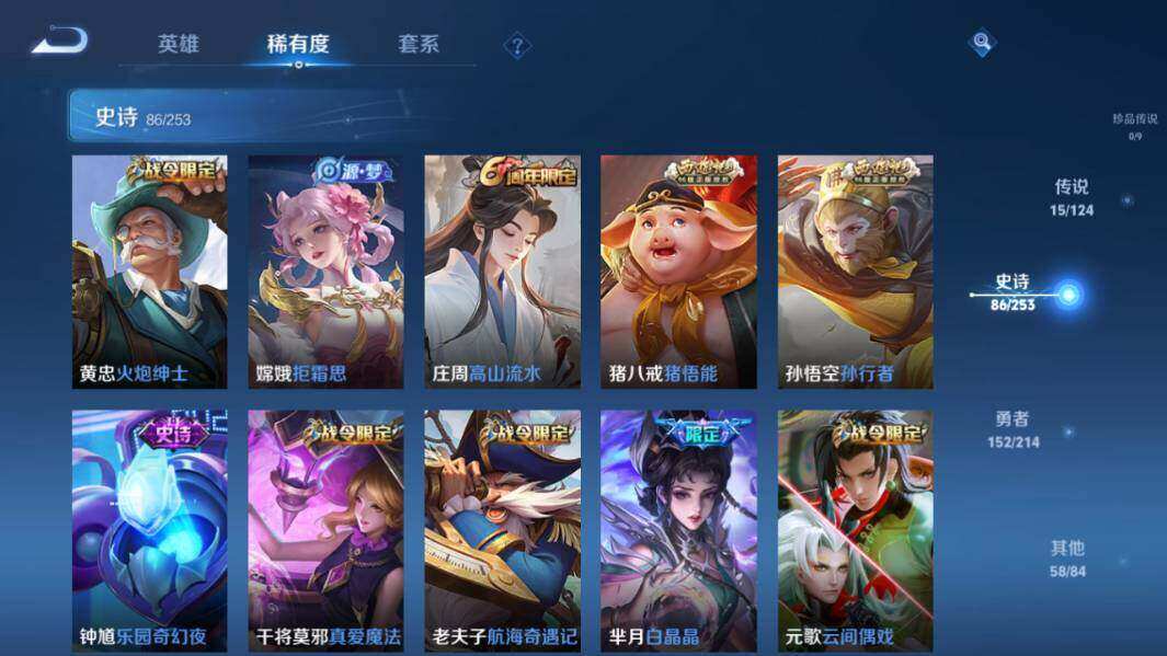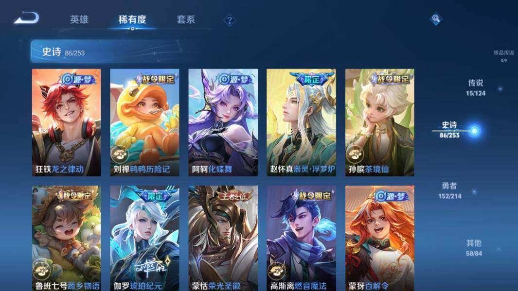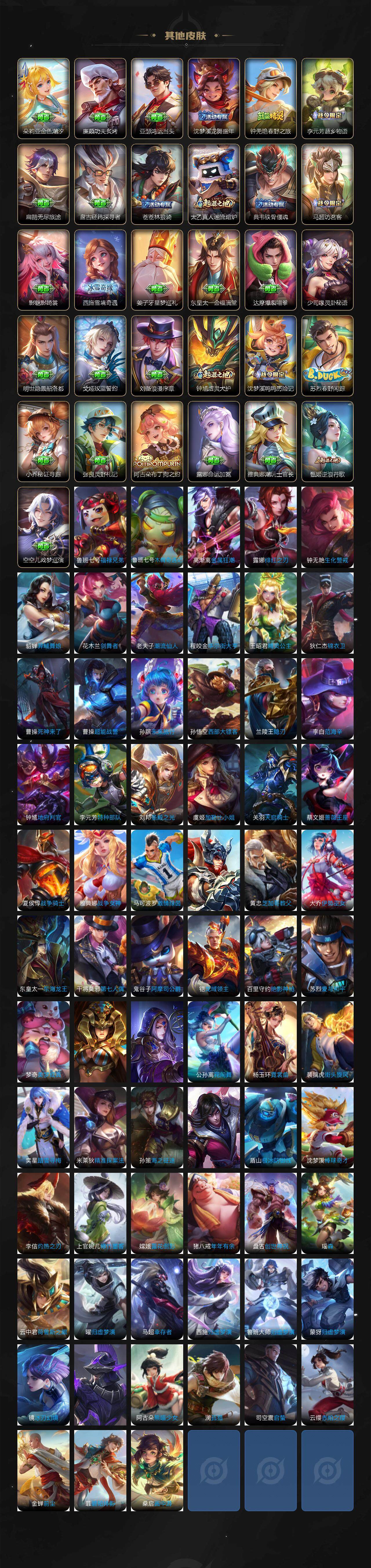 【限定皮肤】:白起狰,狄仁杰阴阳师,赵云皇家上将,墨子神迹守卫,嬴政白昼王子,孙尚香蔷薇恋人,庄周高山流水,高渐离死亡摇滚,高渐离玩趣恶龙,扁鹊奇幻香踪,白起夜都怪侠,芈月重明,芈月白晶晶,芈月幻夜卜梦,吕布猎兽之王,周瑜赤莲之焰,元歌云间偶戏,夏侯惇朔风刀,曹操烛龙,典韦穷奇,马可波罗暗影游猎,马可波罗山海玄木吟,狄仁杰魔术师,狄仁杰万华元夜,达摩沙漠行僧,项羽海滩派对,老夫子醍醐杖,老夫子航海奇遇记,关羽冰锋战神,安琪拉魔法小厨娘,程咬金演武夺筹,刘邦夺宝奇兵,王昭君午后时光,兰陵王金庭之子,亚瑟潮玩骑士王,孙悟空至尊宝,孙悟空孙行者,牛魔御旌,后羿圣弓游侠,李元芳银河之约,李元芳云中旅人,虞姬启明星使,钟馗驱傩正仪,杨戬潮玩骑兵,女娲朔望之晖,干将莫邪真爱魔法,雅典娜单词大作战,雅典娜黎明之约,蔡文姬繁星吟游,太乙真人饕餮,鬼谷子原初探秘者,诸葛亮时雨天司,黄忠烈魂,黄忠火炮绅士,苏烈千军破阵,百里玄策原初追逐者,弈星混沌棋,梦奇顽趣,沈梦溪星空之诺,沈梦溪大漠名商,明世隐疑决卦,明世隐吟游魔法,裴擒虎李小龙,裴擒虎擒涛扼浪,狂铁御狮,狂铁电玩高手,米莱狄御霄,云中君纤云弄巧,李信山海炽霜斩,猪八戒西部大镖客,猪八戒猪悟能,上官婉儿梁祝,嫦娥拒霜思,嫦娥暖冬兔眠,西施玲珑珍味,蒙犽狂想玩偶喵,鲁班大师探海日志,桑启海盐诗旅,暃星界游侠,艾琳流音漫舞,张良古海寻踪,蒙犽百解令,蒙恬荣光圣徽,高渐离燃音魔法,妲己灵卜魔法,鬼谷子天穹祈灯,伽罗琥珀纪元,孙尚香乘龙问璇玑,孙策乘龙淬吴钩,沈梦溪龙舞盛年,鲁班七号蔬乡物语,李元芳蔬乡物语