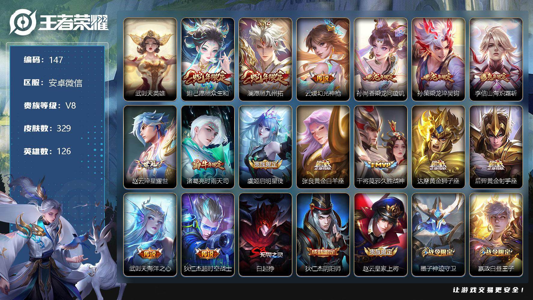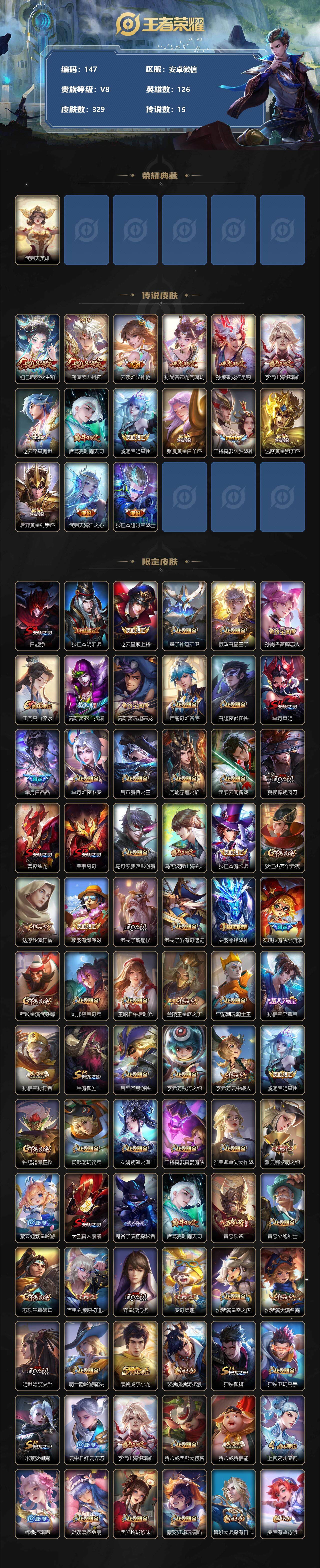 [12152008]【商品标题】:AK501-安卓WX-V8-永恒钻石I段位-126英雄-329皮肤-0典藏-0珍品无双-0无双-0珍品传说-15传说-89史诗 【荣耀典藏】:武则天英雄 【传说皮肤】:妲己愿照众生和,澜愿照九州拓,云缨幻光神枪,孙尚香乘龙问璇玑,孙策乘龙淬吴钩,李信山海炽霜斩,赵云淬星耀世,诸葛亮时雨天司,虞姬启明星使,张良黄金白羊座,干将莫邪久胜战神,达摩黄金狮子座,后羿黄金射手座,武则天海洋之心,狄仁杰超时空战士 【限定皮肤】:白起狰,狄仁杰阴阳师,赵云皇家上将,墨子神迹守卫,嬴政白昼王子,孙尚香蔷薇恋人,庄周高山流水,高渐离死亡摇滚,高渐离玩趣恶龙,扁鹊奇幻香踪,白起夜都怪侠,芈月重明,芈月白晶晶,芈月幻夜卜梦,吕布猎兽之王,周瑜赤莲之焰,元歌云间偶戏,夏侯惇朔风刀,曹操烛龙,典韦穷奇,马可波罗暗影游猎,马可波罗山海玄木吟,狄仁杰魔术师,狄仁杰万华元夜,达摩沙漠行僧,项羽海滩派对,老夫子醍醐杖,老夫子航海奇遇记,关羽冰锋战神,安琪拉魔法小厨娘,程咬金演武夺筹,刘邦夺宝奇兵,王昭君午后时光,兰陵王金庭之子,亚瑟潮玩骑士王,孙悟空至尊宝,孙悟空孙行者,牛魔御旌,后羿圣弓游侠,李元芳银河之约,李元芳云中旅人,虞姬启明星使,钟馗驱傩正仪,杨戬潮玩骑兵,女娲朔望之晖,干将莫邪真爱魔法,雅典娜单词大作战,雅典娜黎明之约,蔡文姬繁星吟游,太乙真人饕餮,鬼谷子原初探秘者,诸葛亮时雨天司,黄忠烈魂,黄忠火炮绅士,苏烈千军破阵,百里玄策原初追逐者,弈星混沌棋,梦奇顽趣,沈梦溪星空之诺,沈梦溪大漠名商,明世隐疑决卦,明世隐吟游魔法,裴擒虎李小龙,裴擒虎擒涛扼浪,狂铁御狮,狂铁电玩高手,米莱狄御霄,云中君纤云弄巧,李信山海炽霜斩,猪八戒西部大镖客,猪八戒猪悟能,上官婉儿梁祝,嫦娥拒霜思,嫦娥暖冬兔眠,西施玲珑珍味,蒙犽狂想玩偶喵,鲁班大师探海日志,桑启海盐诗旅,暃星界游侠,艾琳流音漫舞,张良古海寻踪,蒙犽百解令,蒙恬荣光圣徽,高渐离燃音魔法,妲己灵卜魔法,鬼谷子天穹祈灯,伽罗琥珀纪元,孙尚香乘龙问璇玑,孙策乘龙淬吴钩,沈梦溪龙舞盛年,鲁班七号蔬乡物语,李元芳蔬乡物语 【年限皮肤】:诸葛亮时雨天司,黄忠烈魂,马可波罗山海玄木吟,李信山海炽霜斩,孙尚香乘龙问璇玑,孙策乘龙淬吴钩 【赛季限定】:白起狰,芈月重明,夏侯惇朔风刀,曹操烛龙,典韦穷奇,狄仁杰万华元夜,达摩沙漠行僧,老夫子醍醐杖,