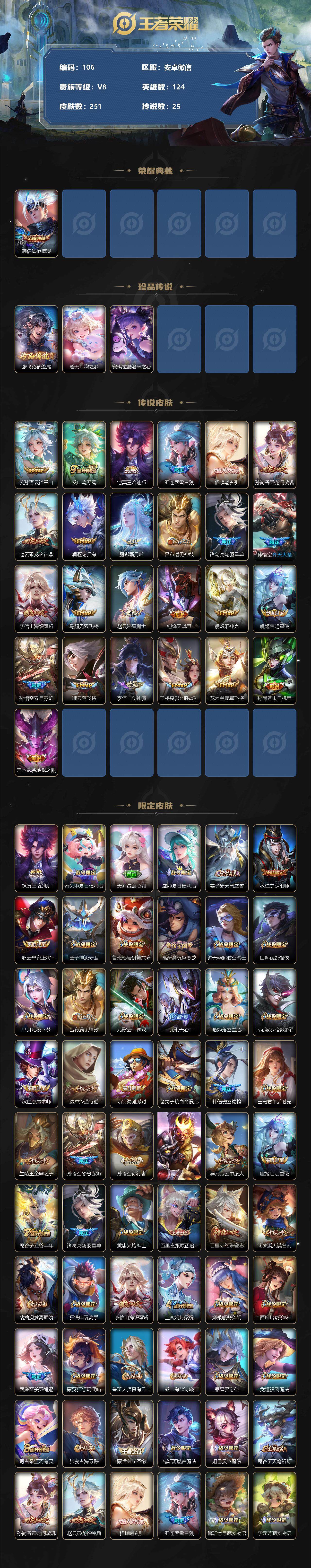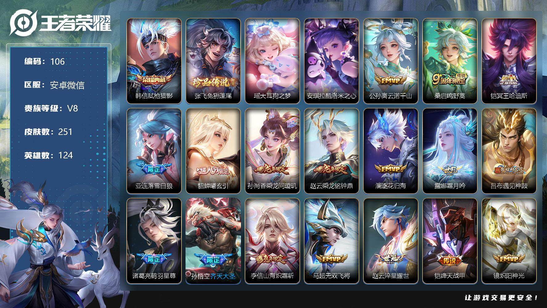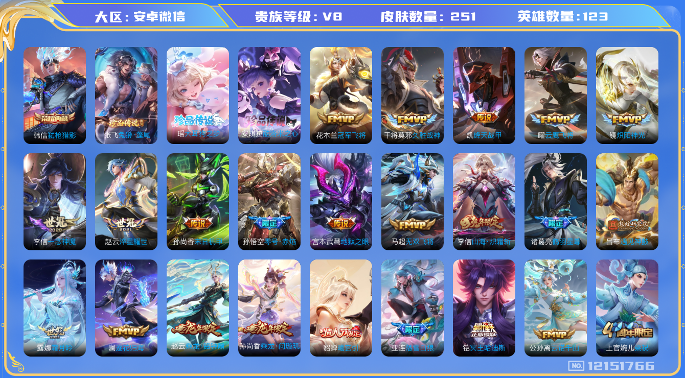 [12151766]【商品标题】:安卓WX-V8-最强王者段位-124英雄-251皮肤-1典藏-0珍品无双-0无双-3珍品传说-25传说-78史诗