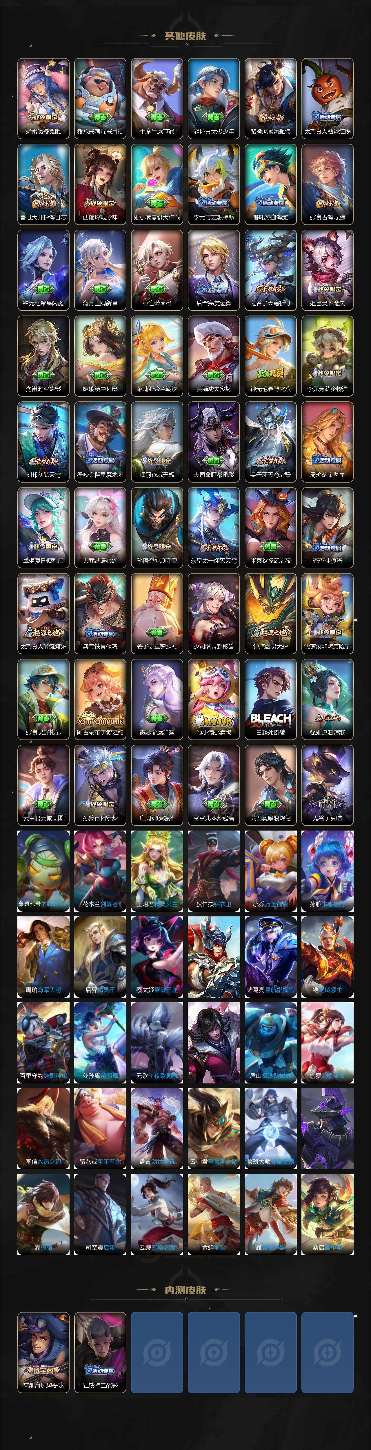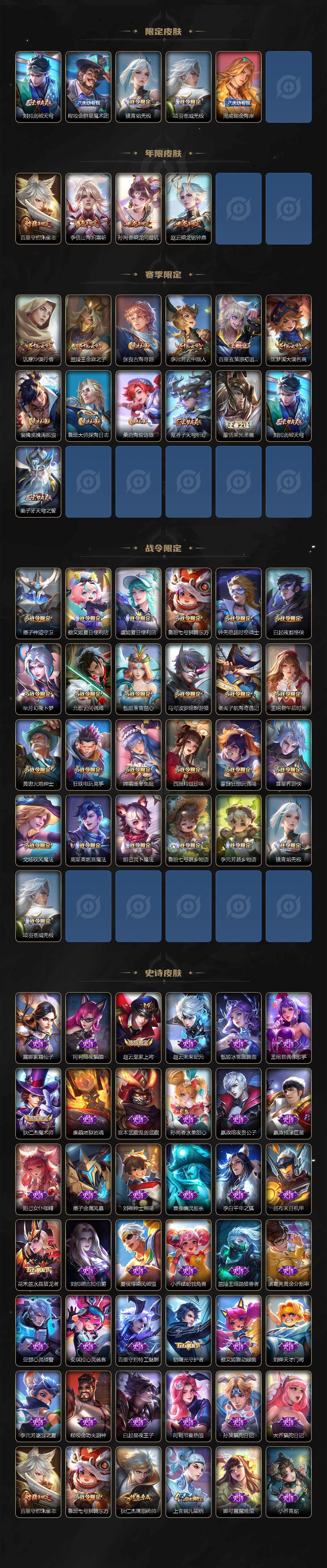 【限定皮肤】:铠冥王哈迪斯,蔡文姬夏日便利店,大乔绒语心约,虞姬夏日便利店,姜子牙天穹之誓,狄仁杰阴阳师,赵云皇家上将,墨子神迹守卫,鲁班七号狮舞东方,高渐离玩趣恶龙,钟无艳超时空战士,白起夜都怪侠,芈月幻夜卜梦,吕布遇见神鼓,元歌云间偶戏,元歌无心,甄姬落雪兰心,马可波罗暗影游猎,狄仁杰魔术师,达摩沙漠行僧,项羽海滩派对,老夫子航海奇遇记,韩信傲雪梅枪,王昭君午后时光,兰陵王金庭之子,孙悟空零号赤焰,孙悟空孙行者,孙悟空齐天大圣,李元芳云中旅人,虞姬启明星使,鬼谷子五谷丰年,诸葛亮鹤羽星尊,黄忠火炮绅士,百里玄策原初追逐者,百里守约朱雀志,沈梦溪大漠名商,裴擒虎擒涛扼浪,狂铁电玩高手,李信山海炽霜斩,上官婉儿梁祝,嫦娥暖冬兔眠,西施玲珑珍味,西施至美乘鲤谣,蒙犽狂想玩偶喵,鲁班大师探海日志,桑启海盐诗旅,暃星界游侠,戈娅驭风魔法,阿古朵江河有灵,张良古海寻踪,蒙恬荣光圣徽,高渐离燃音魔法,妲己灵卜魔法,鬼谷子天穹祈灯,孙尚香乘龙问璇玑,赵云乘龙铭钟鼎,貂蝉曦玄引,亚连落雪白狼,鲁班七号蔬乡物语,李元芳蔬乡物语,刘邦剑破天穹,程咬金群星魔术团,镜青焰无极,项羽苍威无极,周瑜熔金海岸