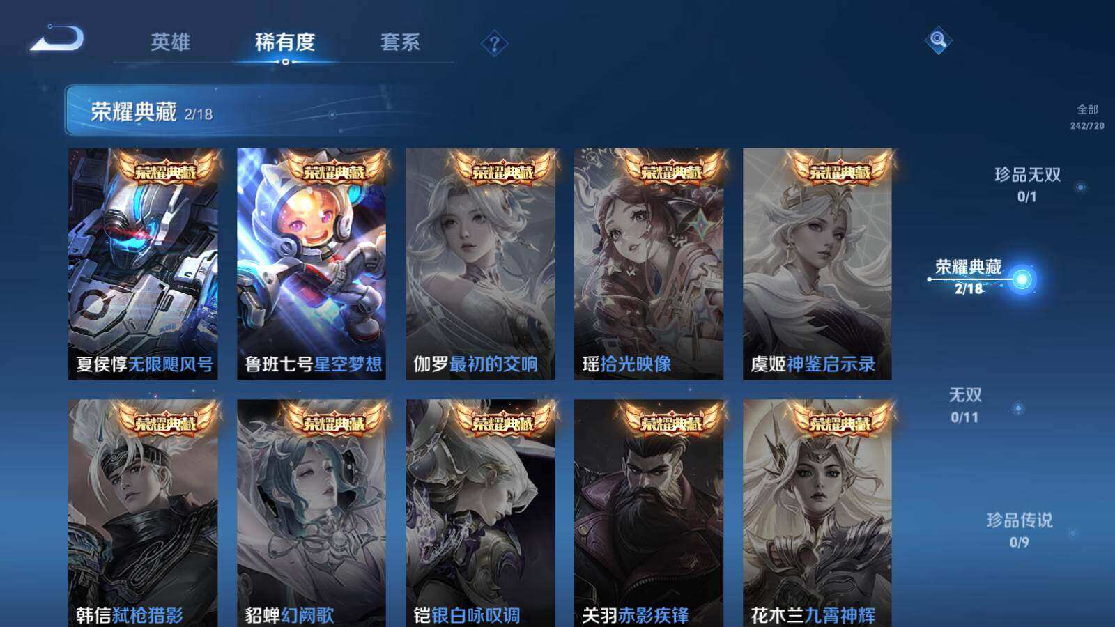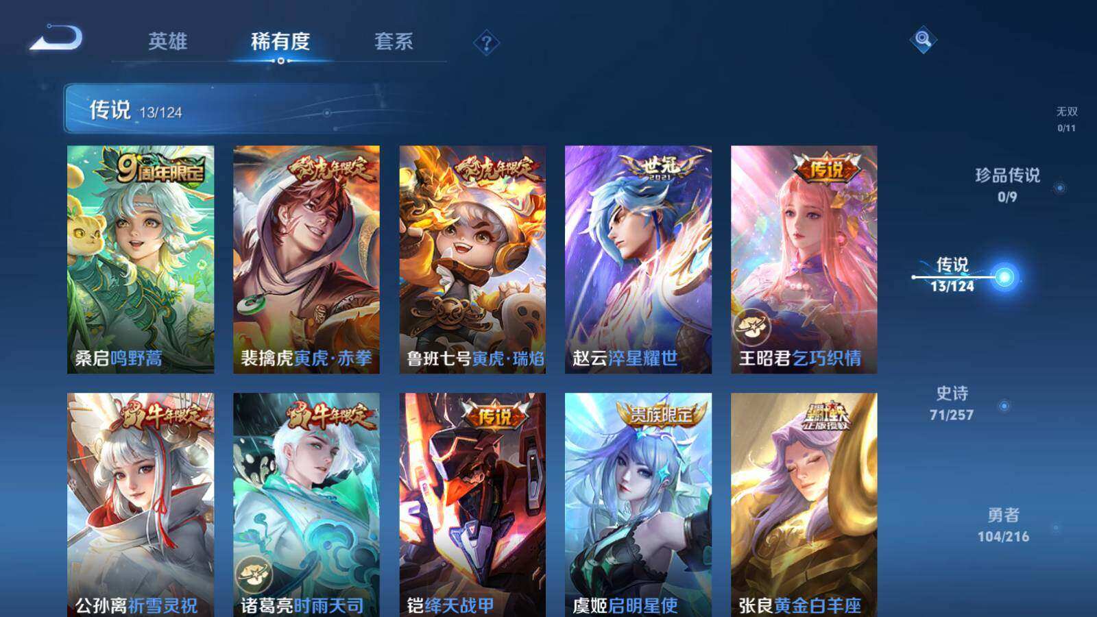 【传说皮肤】:桑启鸣野蒿,裴擒虎寅虎赤拳,鲁班七号寅虎瑞焰,赵云淬星耀世,王昭君乞巧织情,公孙离祈雪灵祝,诸葛亮时雨天司,铠绛天战甲,虞姬启明星使,张良黄金白羊座,达摩黄金狮子座,花木兰冠军飞将,狄仁杰超时空战士