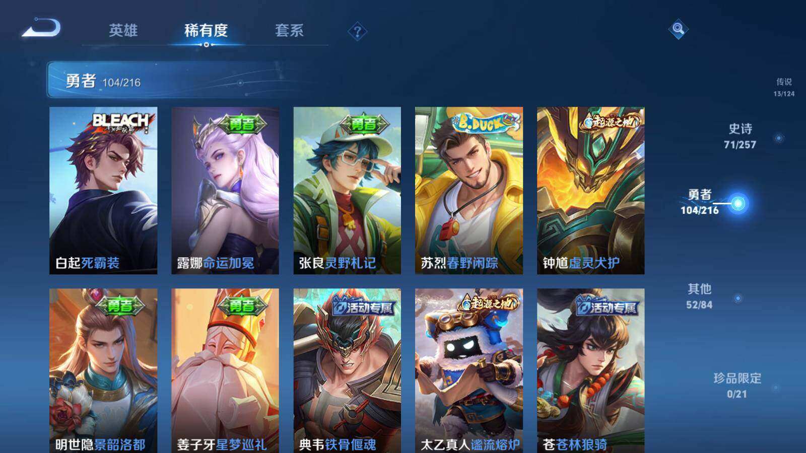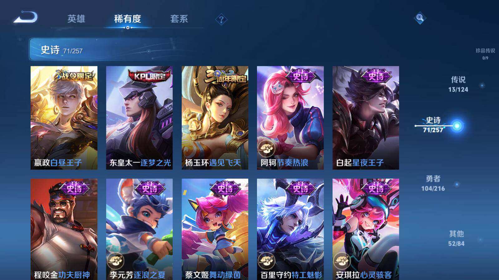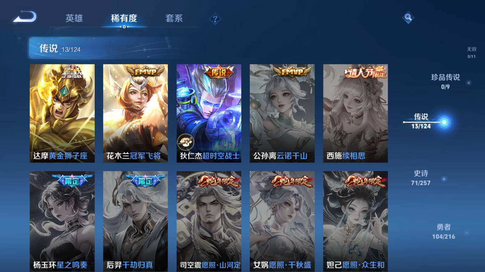 扁鹊炼金王,虞姬凯尔特女王,白起狰,太乙真人饕餮,曹操烛龙,芈月重明,典韦穷奇,狂铁御狮,米莱狄御霄,牛魔御旌,夏侯惇朔风刀,明世隐疑决卦,老夫子醍醐杖,鬼谷子原初探秘者,狄仁杰万华元夜,程咬金演武夺筹,钟馗驱傩正仪,苏烈千军破阵,吕布猎兽之王,嬴政白昼王子,女娲朔望之晖,钟馗神迹守卫,鲁班七号狮舞东方,刘邦夺宝奇兵,马可波罗暗影游猎,弈星混沌棋,达摩沙漠行僧,兰陵王金庭之子,沈梦溪大漠名商,李元芳云中旅人,桑启海盐诗旅,裴擒虎擒涛扼浪,鲁班大师探海日志,张良古海寻踪