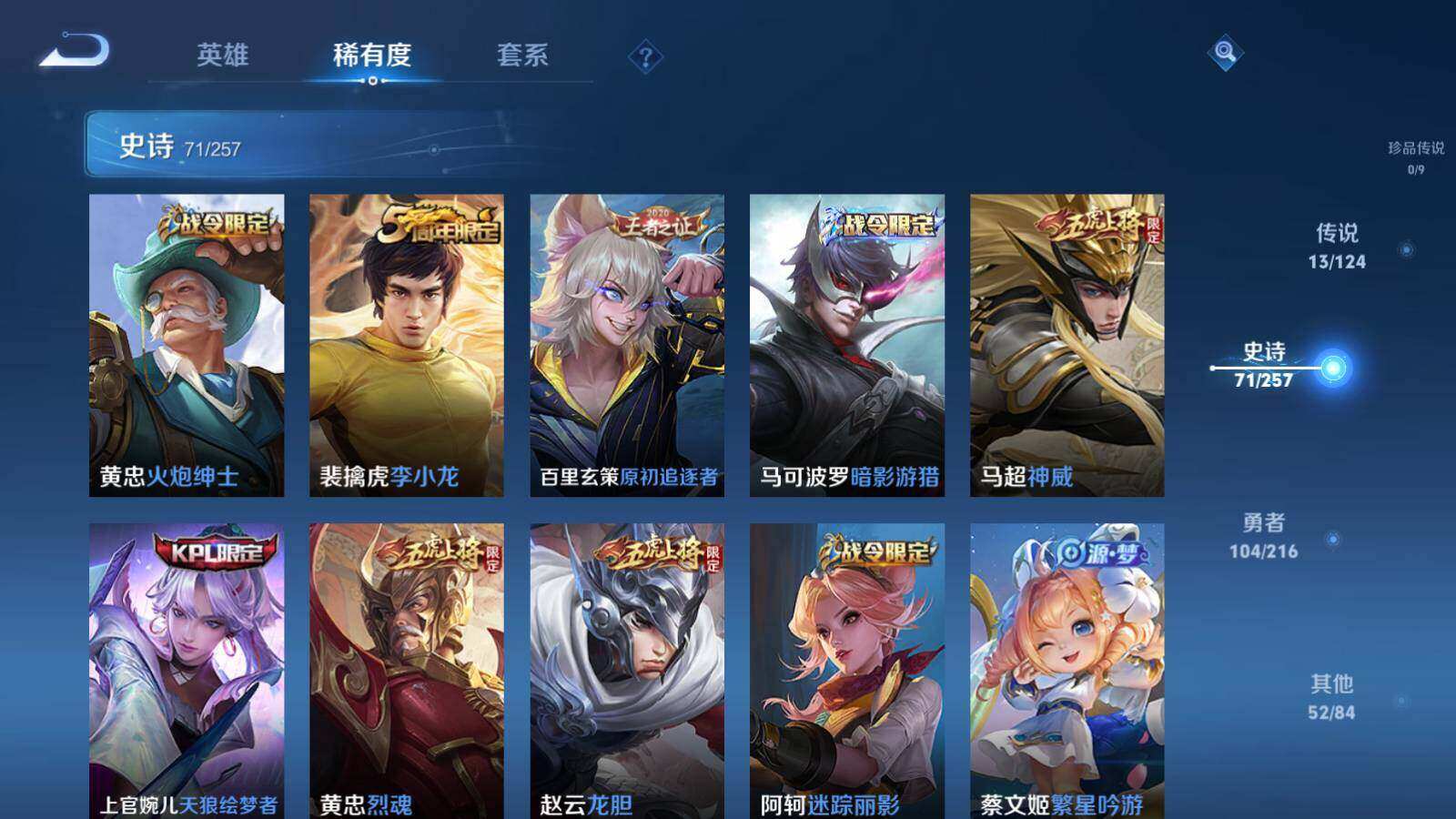 【限定皮肤】:白起狰,狄仁杰阴阳师,虞姬凯尔特女王,廉颇寅虎御盾,赵云皇家上将,赵云龙胆,墨子神迹守卫,嬴政优雅恋人,嬴政白昼王子,鲁班七号狮舞东方,鲁班七号寅虎瑞焰,高渐离死亡摇滚,阿轲迷踪丽影,孙膑寅虎展翼,扁鹊炼金王,芈月重明,芈月幻夜卜梦,吕布猎兽之王,周瑜赤莲之焰,元歌无心,夏侯惇朔风刀,甄姬女儿国国王,甄姬游园惊梦,甄姬落雪兰心,曹操烛龙,典韦穷奇,马可波罗暗影游猎,狄仁杰魔术师,狄仁杰万华元夜,达摩沙漠行僧,项羽海滩派对,老夫子醍醐杖,关羽冰锋战神,安琪拉魔法小厨娘,程咬金演武夺筹,刘邦夺宝奇兵,韩信傲雪梅枪,兰陵王驯魔猎人,兰陵王金庭之子,花木兰瑞麟志,亚瑟潮玩骑士王,孙悟空大圣娶亲,牛魔御旌,后羿圣弓游侠,李元芳云中旅人,虞姬启明星使,钟馗神迹守卫,钟馗驱傩正仪,杨玉环遇见飞天,杨玉环寅虎心曲,女娲朔望之晖,干将莫邪冰霜恋舞曲,蔡文姬繁星吟游,太乙真人饕餮,东皇太一逐梦之光,鬼谷子原初探秘者,鬼谷子五谷丰年,诸葛亮时雨天司,黄忠烈魂,黄忠火炮绅士,铠青龙志,苏烈千军破阵,百里玄策原初追逐者,弈星混沌棋,公孙离祈雪灵祝,沈梦溪大漠名商,明世隐疑决卦,裴擒虎李小龙,裴擒虎寅虎赤拳,裴擒虎擒涛扼浪,狂铁御狮,米莱狄御霄,云中君时之祈愿,盾山御銮,猪八戒西部大镖客,上官婉儿梁祝,上官婉儿天狼绘梦者,鲁班大师探海日志,桑启海盐诗旅,阿古朵江河有灵,张良古海寻踪,沈梦溪龙舞盛年,刘邦剑破天穹