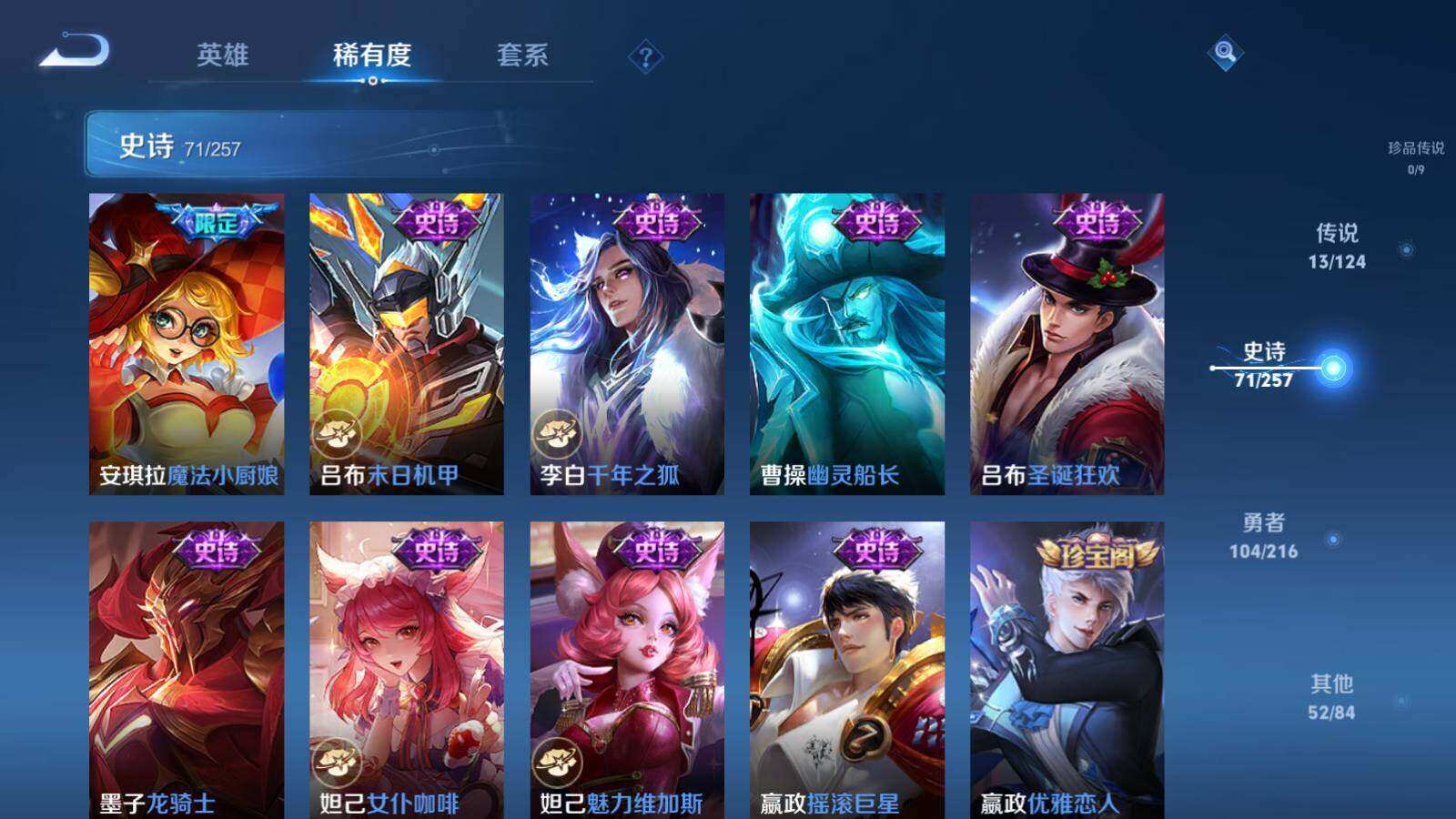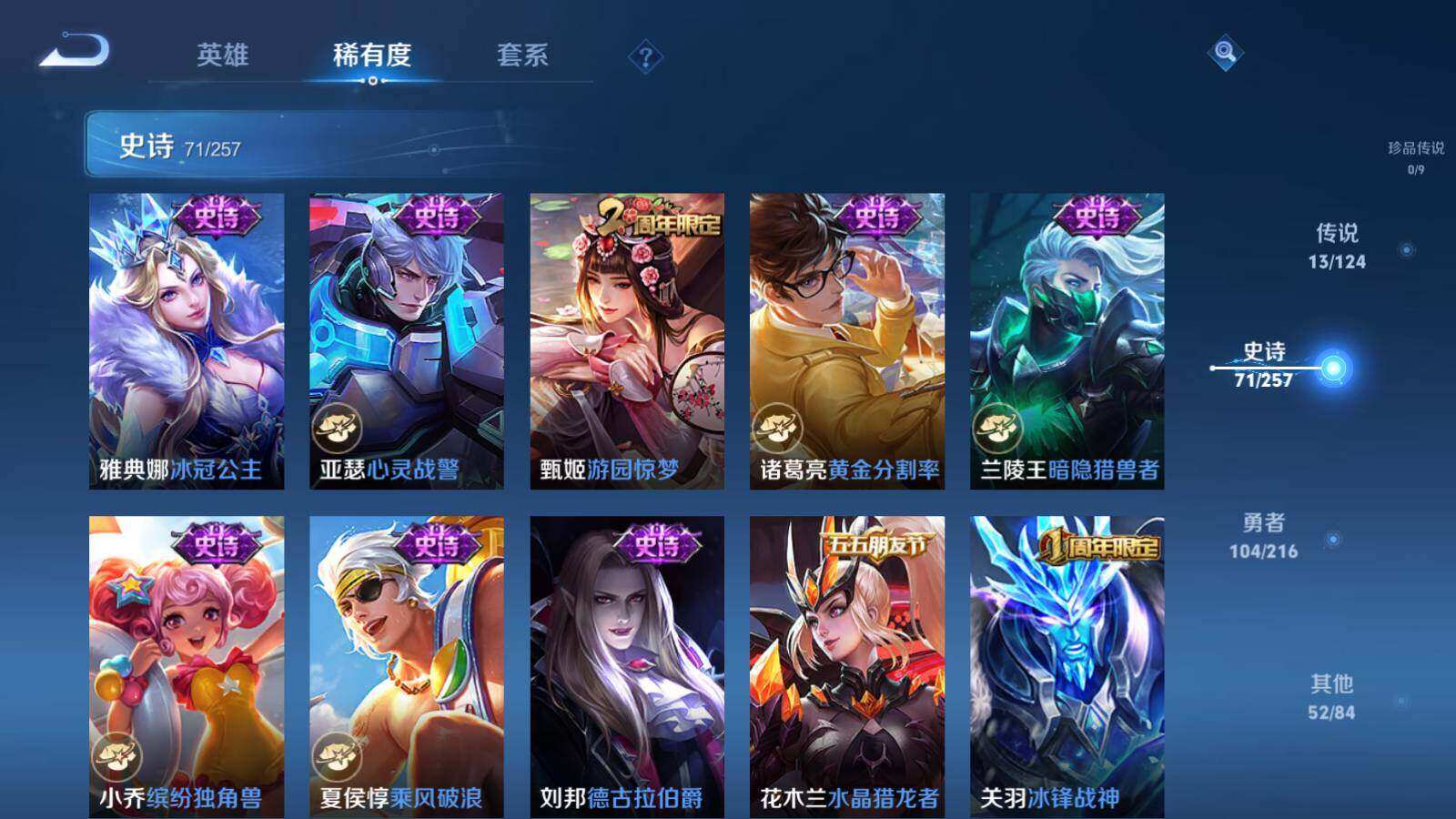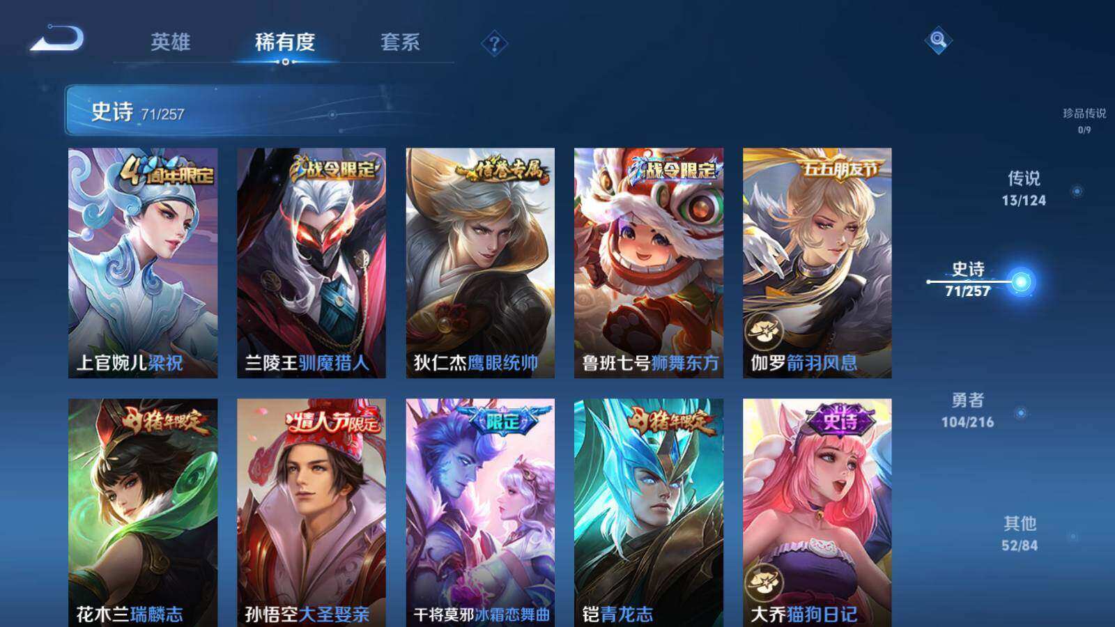 关羽冰锋战神,裴擒虎李小龙,上官婉儿梁祝,公孙离祈雪灵祝,诸葛亮时雨天司,赵云龙胆,黄忠烈魂,马超神威,上官婉儿天狼绘梦者,东皇太一逐梦之光,铠青龙志,花木兰瑞麟志,孙悟空大圣娶亲,干将莫邪冰霜恋舞曲,安琪拉魔法小厨娘,廉颇寅虎·御盾,甄姬女儿国国王,韩信傲雪梅枪,鲁班七号寅虎·瑞焰,孙膑寅虎·展翼,杨玉环寅虎·心曲,裴擒虎寅虎·赤拳,云中君时之祈愿,桑启鸣野蒿