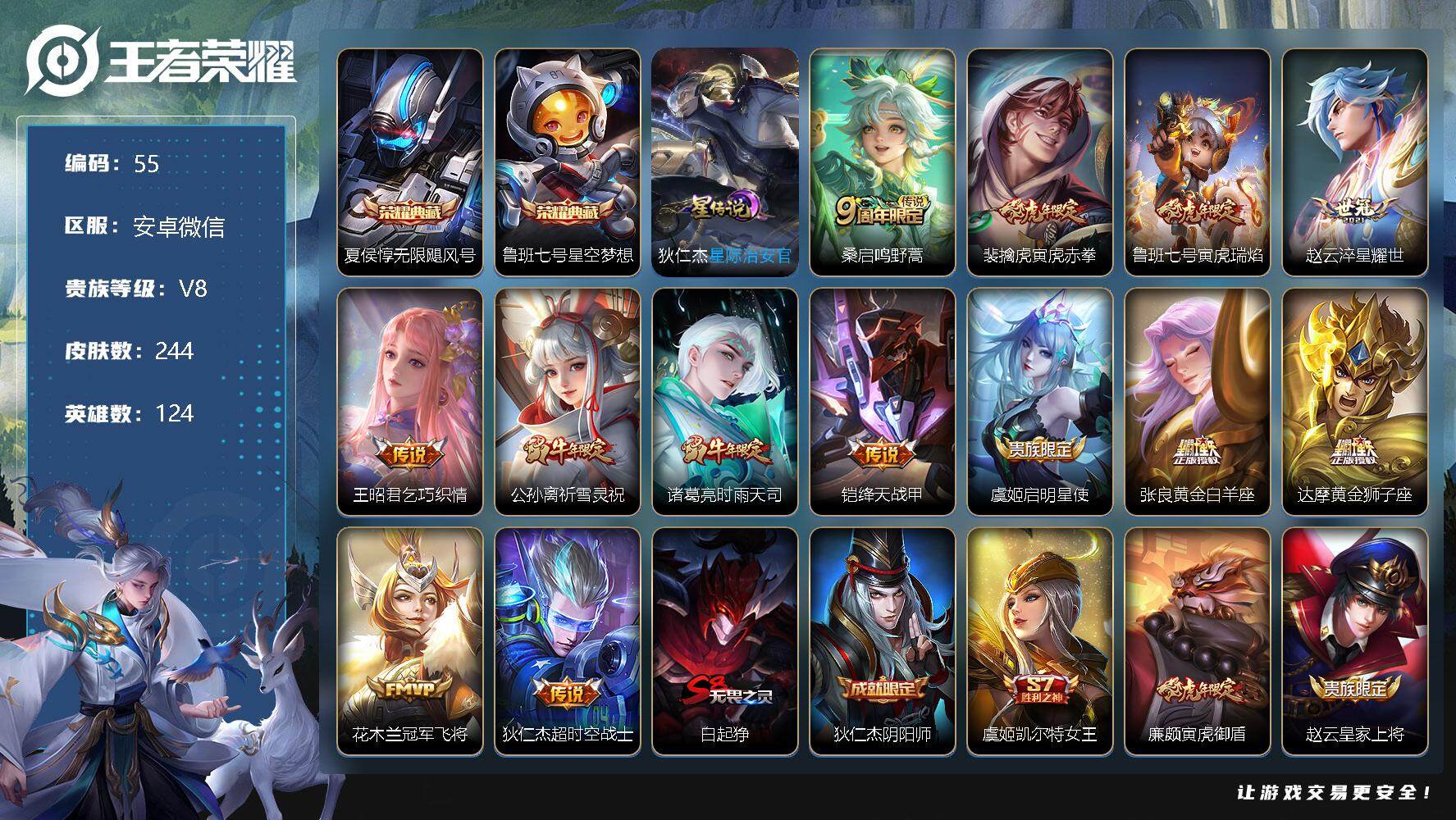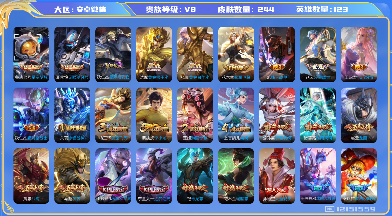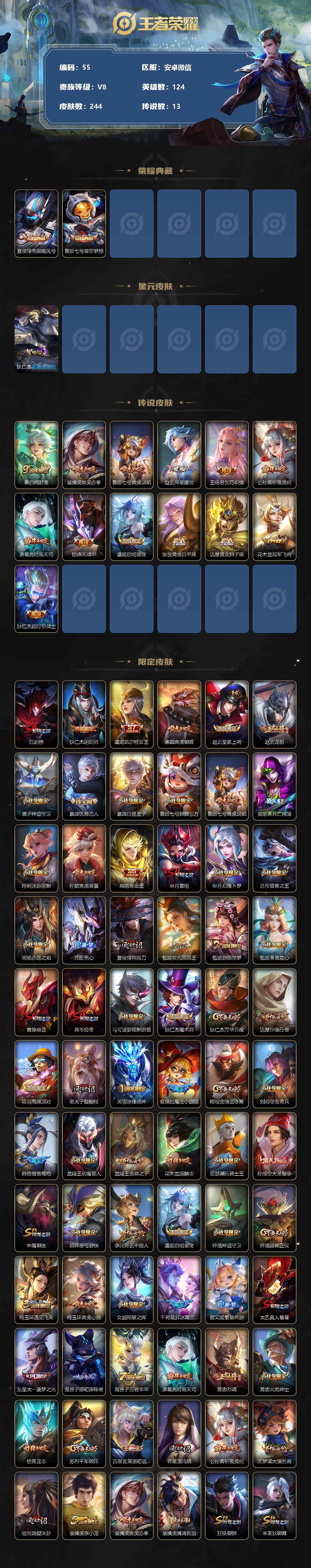 [12151559]AK614-有二次-安卓WX-V8-永恒钻石I段位-124英雄-242皮肤-2典藏-13传说-71史诗 【荣耀典藏】:夏侯惇无限飓风号,鲁班七号星空梦想 【传说皮肤】:桑启鸣野蒿,裴擒虎寅虎赤拳,鲁班七号寅虎瑞焰,赵云淬星耀世,王昭君乞巧织情,公孙离祈雪灵祝,诸葛亮时雨天司,铠绛天战甲,虞姬启明星使,张良黄金白羊座,达摩黄金狮子座,花木兰冠军飞将,狄仁杰超时空战士 【限定皮肤】:白起狰,狄仁杰阴阳师,虞姬凯尔特女王,廉颇寅虎御盾,赵云皇家上将,赵云龙胆,墨子神迹守卫,嬴政优雅恋人,嬴政白昼王子,鲁班七号狮舞东方,鲁班七号寅虎瑞焰,高渐离死亡摇滚,阿轲迷踪丽影,孙膑寅虎展翼,扁鹊炼金王,芈月重明,芈月幻夜卜梦,吕布猎兽之王,周瑜赤莲之焰,元歌无心,夏侯惇朔风刀,甄姬女儿国国王,甄姬游园惊梦,甄姬落雪兰心,曹操烛龙,典韦穷奇,马可波罗暗影游猎,狄仁杰魔术师,狄仁杰万华元夜,达摩沙漠行僧,项羽海滩派对,老夫子醍醐杖,关羽冰锋战神,安琪拉魔法小厨娘,程咬金演武夺筹,刘邦夺宝奇兵,韩信傲雪梅枪,兰陵王驯魔猎人,兰陵王金庭之子,花木兰瑞麟志,亚瑟潮玩骑士王,孙悟空大圣娶亲,牛魔御旌,后羿圣弓游侠,李元芳云中旅人,虞姬启明星使,钟馗神迹守卫,钟馗驱傩正仪,杨玉环遇见飞天,杨玉环寅虎心曲,女娲朔望之晖,干将莫邪冰霜恋舞曲,蔡文姬繁星吟游,太乙真人饕餮,东皇太一逐梦之光,鬼谷子原初探秘者,鬼谷子五谷丰年,诸葛亮时雨天司,黄忠烈魂,黄忠火炮绅士,铠青龙志,苏烈千军破阵,百里玄策原初追逐者,弈星混沌棋,公孙离祈雪灵祝,沈梦溪大漠名商,明世隐疑决卦,裴擒虎李小龙,裴擒虎寅虎赤拳,裴擒虎擒涛扼浪,狂铁御狮,米莱狄御霄,云中君时之祈愿,盾山御銮,猪八戒西部大镖客,上官婉儿梁祝,上官婉儿天狼绘梦者,鲁班大师探海日志,桑启海盐诗旅,阿古朵江河有灵,张良古海寻踪,沈梦溪龙舞盛年,刘邦剑破天穹 【年限皮肤】:花木兰瑞麟志,铠青龙志,裴擒虎寅虎赤拳,孙膑寅虎展翼,鲁班七号寅虎瑞焰,杨玉环寅虎心曲,廉颇寅虎御盾,公孙离祈雪灵祝,诸葛亮时雨天司,马超神威,黄忠烈魂,赵云龙胆 【赛季限定】:扁鹊炼金王,白起狰,芈月重明,夏侯惇朔风刀,曹操烛龙,典韦穷奇,狄仁杰万华元夜,达摩沙漠行僧,老夫子醍醐杖,程咬金演武夺筹,兰陵王金庭之子,张良古海寻踪,牛魔御旌,李元芳云中旅人,虞姬凯尔特女王,钟馗驱傩正仪,太乙真人饕