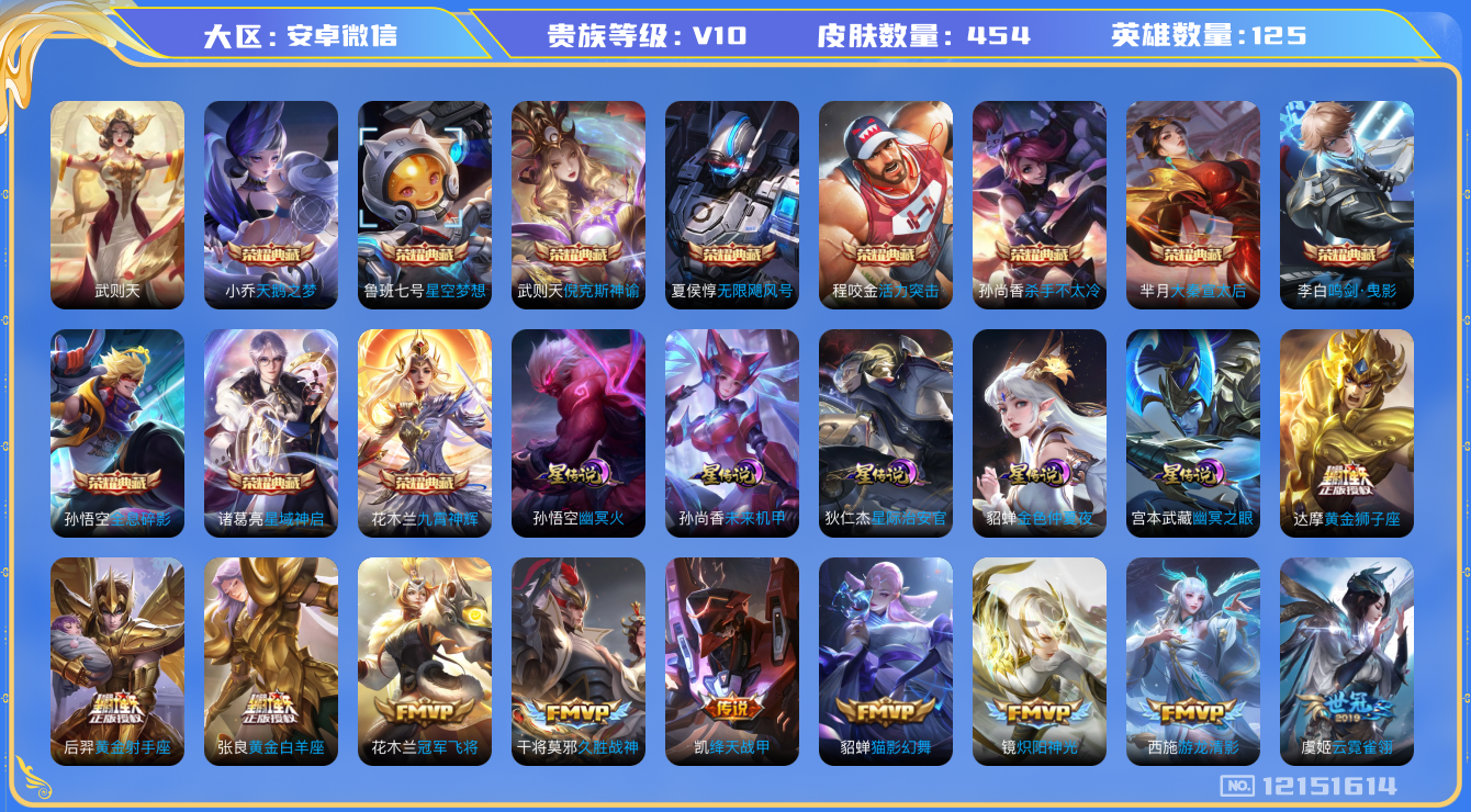 - [12228862]V7 5传说 125英雄 227皮肤 可修改实名 优质装备:久胜战神,鹤羽星尊,惊梅引 传说皮:铠冥王哈迪斯 珍宝阁皮:万物之道,优雅恋人,女武神 限定皮:逐霄战戟,鸣野蒿,至尊宝,遇见飞天,高山流水,五谷丰年,李小龙,朱雀志(守约年限),大圣娶亲 史诗皮:星界战将,谪仙醉月,雪豹·霜爪,藏狐·褐绒,石田雨龙,百相守梦-百里守约,星界特工,百相守梦-黄忠,紫霞仙子,苍穹之光,特工魅影,江河有灵,高渐离燃音魔法,蒙恬荣光圣徽,冰冠公主,偶像歌手,电玩·爆裂旋风,暗夜猫娘,末日机甲-吕布,猫狗日记-孙策,时之恋人-孙尚香,乱世虎臣,节奏热浪,女仆咖啡,摇滚巨星,水果甜心,绅士熊喵,天才门将,星夜王子,功夫厨神,暗隐猎兽者,幽灵船长,鬼剑武藏,心灵战警,乐园奇幻夜,天秀·启明,舞动绿茵,地狱岩魂,纤云弄巧,繁星吟游(呼啦呼啦),缤纷独角兽,乘风破浪,水晶猎龙者,曙光守护者,金属风暴,原初追逐者,圣诞恋歌,鹰眼统帅,魅力维加斯,黎明之约