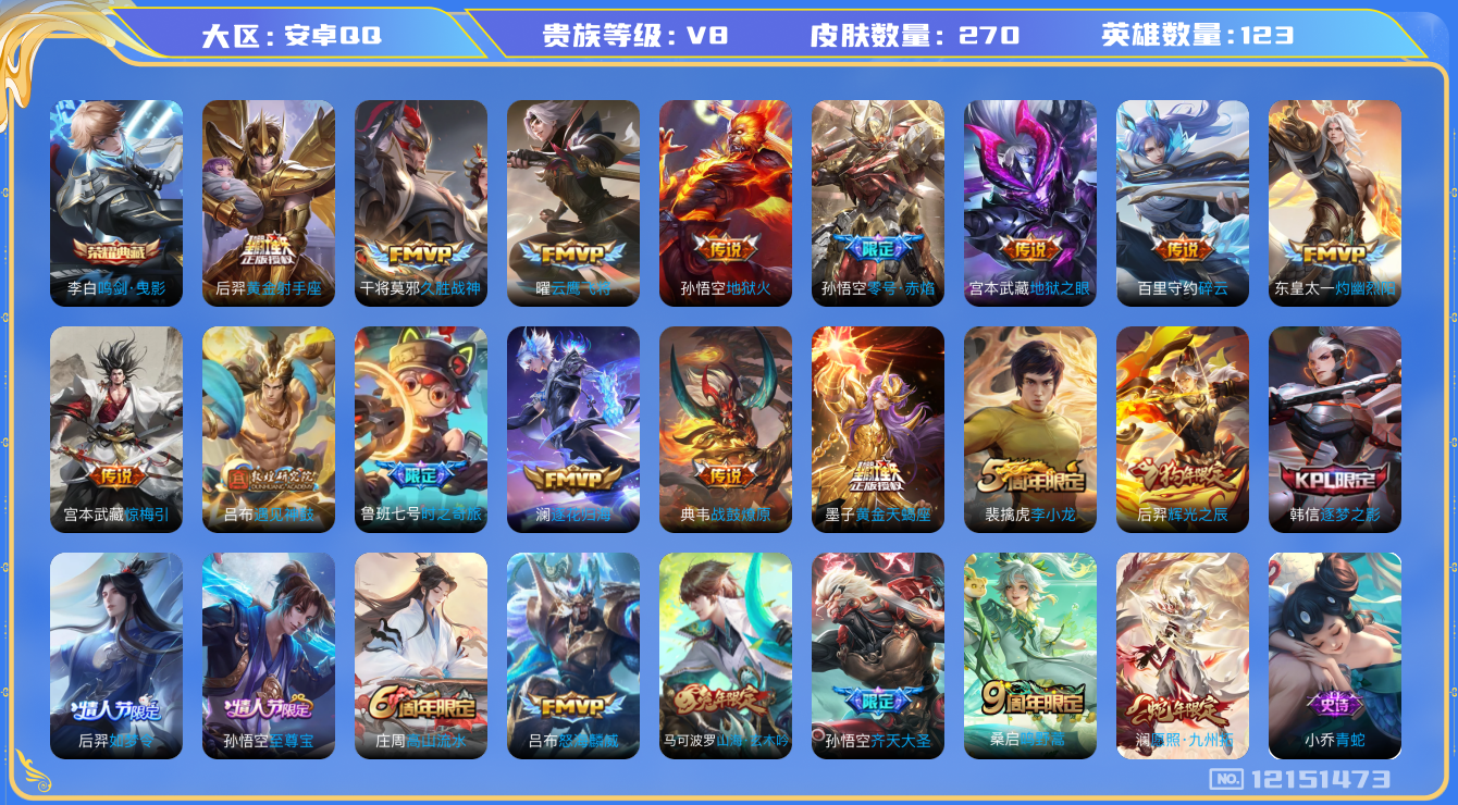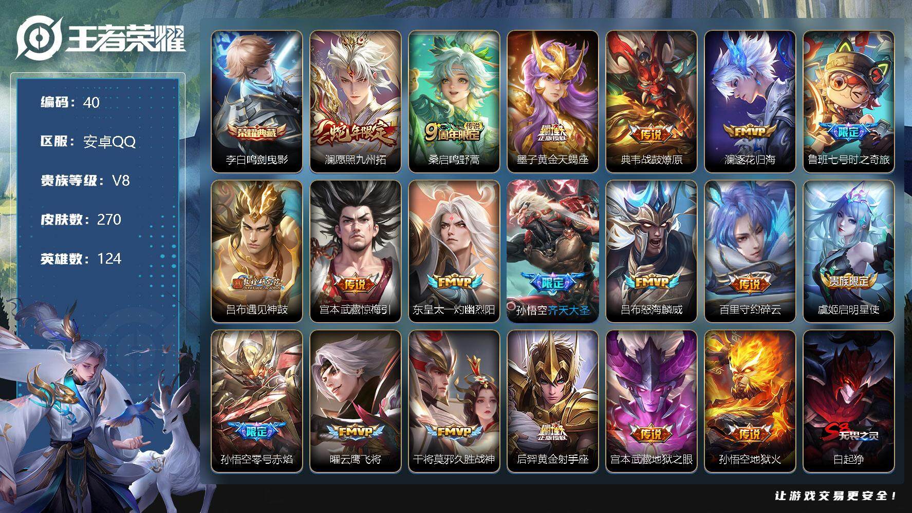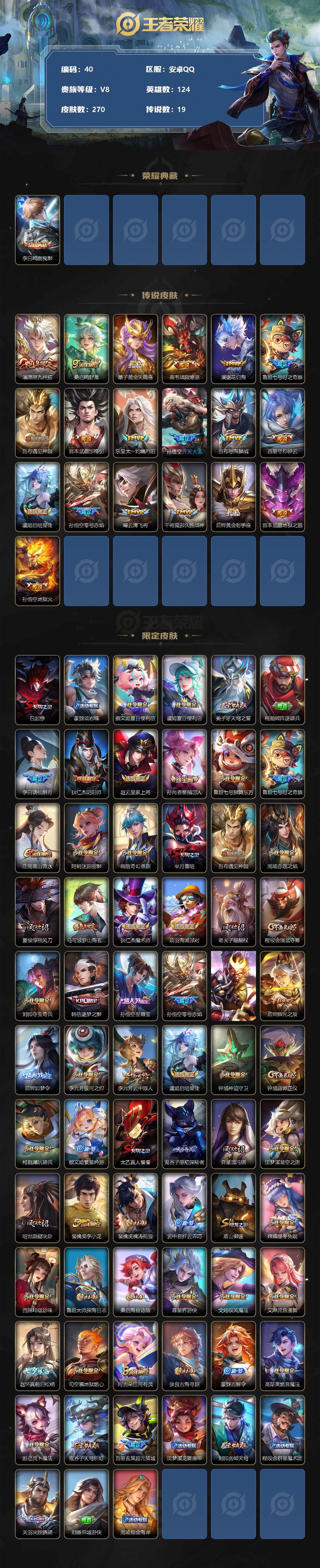 [12151473]【商品标题】:MQ720-安卓Q-V8-永恒钻石III段位-124英雄-270皮肤-1典藏-0珍品无双-0无双-0珍品传说-19传说-70史诗