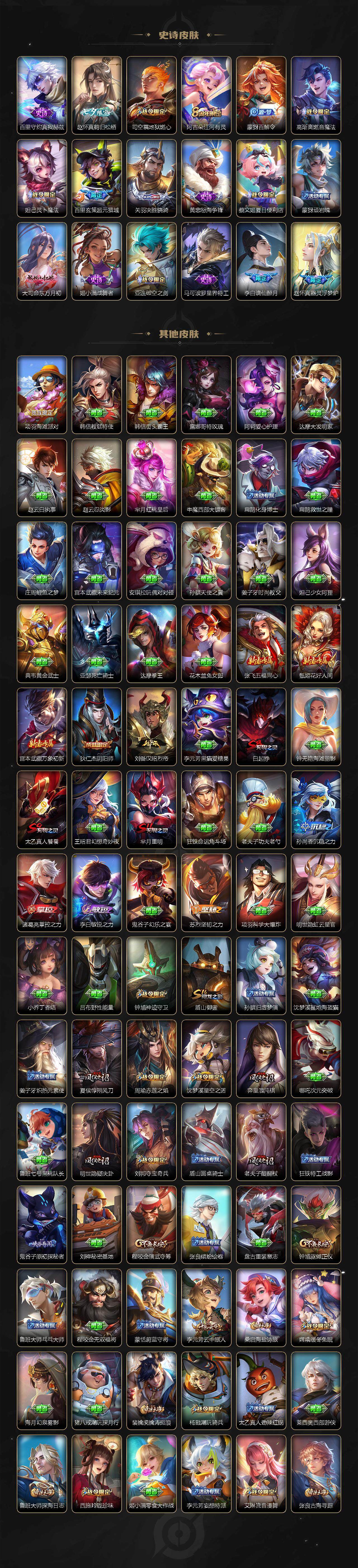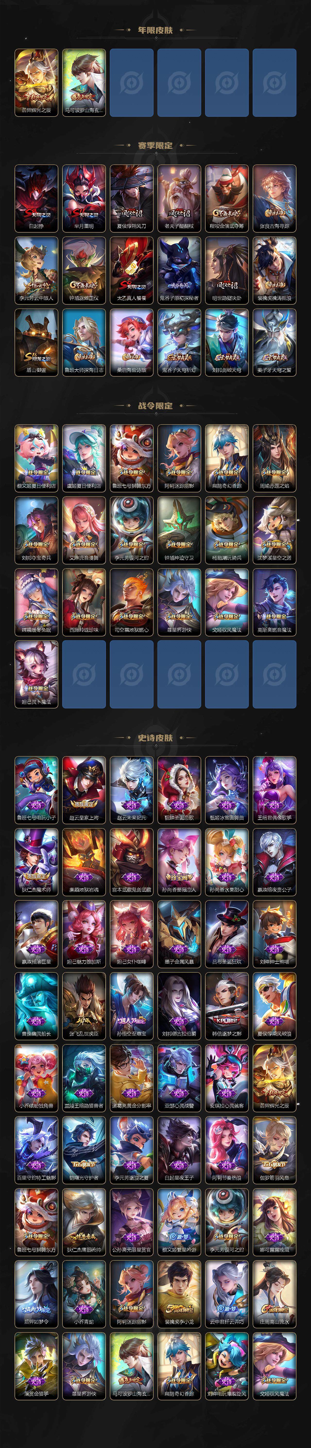【限定皮肤】:白起狰,蒙犽顽岩魄,蔡文姬夏日便利店,虞姬夏日便利店,姜子牙天穹之誓,杨戬破阵退雄兵,李白谪仙醉月,狄仁杰阴阳师,赵云皇家上将,孙尚香蔷薇恋人,鲁班七号狮舞东方,鲁班七号时之奇旅,庄周高山流水,阿轲迷踪丽影,扁鹊奇幻香踪,芈月重明,吕布遇见神鼓,周瑜赤莲之焰,夏侯惇朔风刀,马可波罗山海玄木吟,狄仁杰魔术师,项羽海滩派对,老夫子醍醐杖,程咬金演武夺筹,刘邦夺宝奇兵,韩信逐梦之影,孙悟空至尊宝,孙悟空零号赤焰,孙悟空齐天大圣,后羿辉光之辰,后羿如梦令,李元芳银河之约,李元芳云中旅人,虞姬启明星使,钟馗神迹守卫,钟馗驱傩正仪,杨戬潮玩骑兵,蔡文姬繁星吟游,太乙真人饕餮,鬼谷子原初探秘者,弈星混沌棋,沈梦溪星空之诺,明世隐疑决卦,裴擒虎李小龙,裴擒虎擒涛扼浪,云中君纤云弄巧,盾山御銮,嫦娥暖冬兔眠,西施玲珑珍味,鲁班大师探海日志,桑启海盐诗旅,暃星界游侠,戈娅驭风魔法,艾琳流音漫舞,赵怀真鹤归松栖,司空震地狱燃心,阿古朵江河有灵,张良古海寻踪,蒙犽百解令,高渐离燃音魔法,妲己灵卜魔法,鬼谷子天穹祈灯,百里玄策超元猎域,沈梦溪龙舞盛年,刘邦剑破天穹,程咬金群星魔术团,关羽决胜骁骑,刘备异域游侠,周瑜熔金海岸