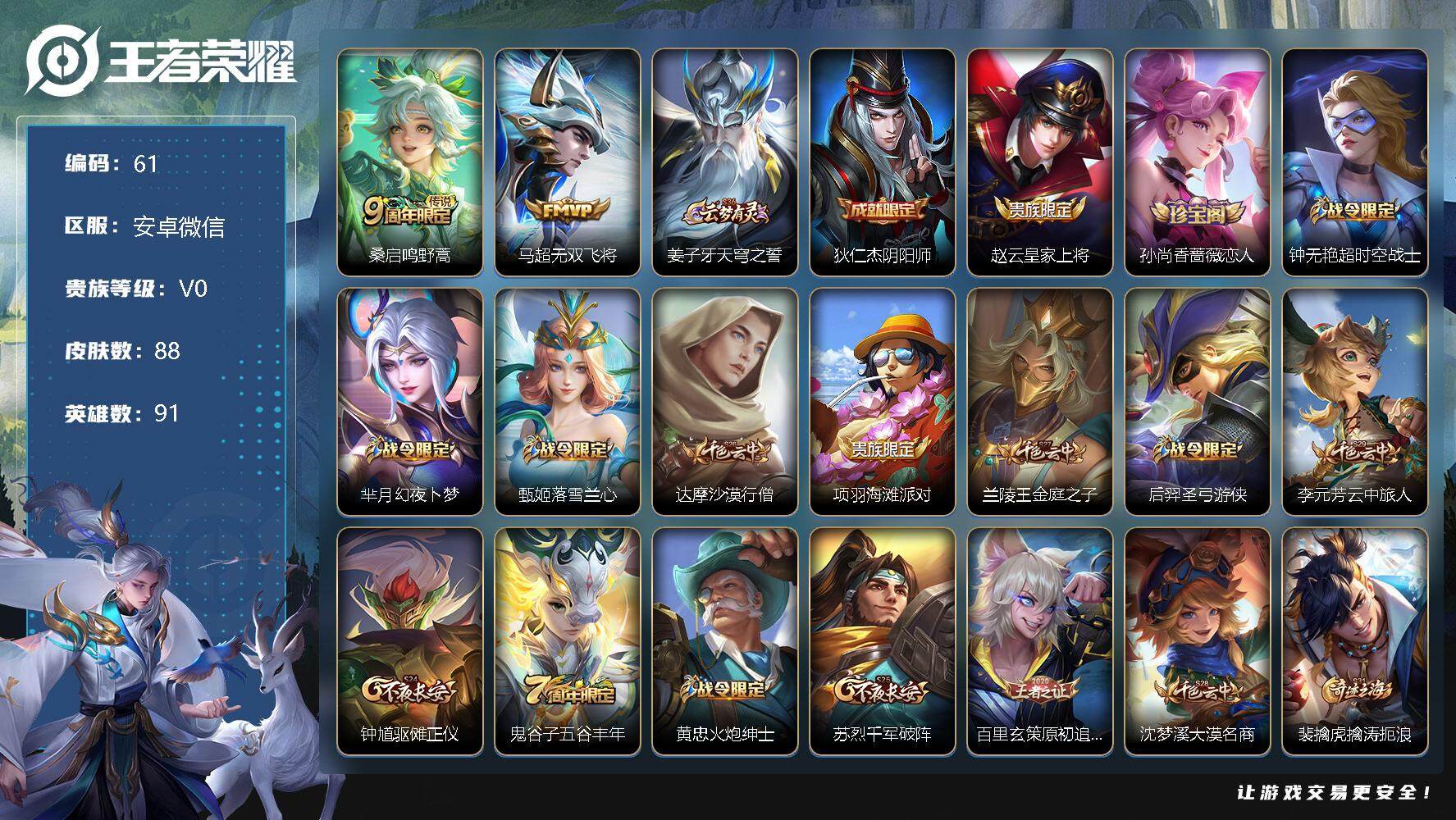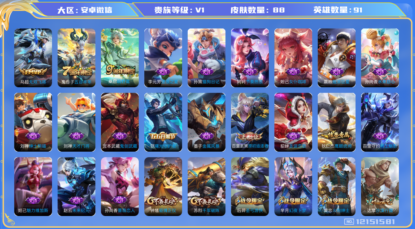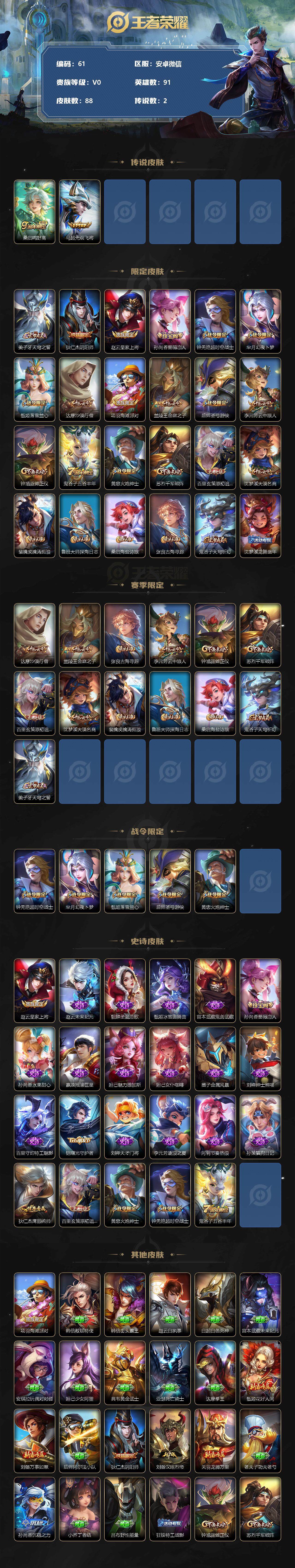 [12151581]【商品标题】:AK534-安卓WX-V5-至尊星耀II段位-91英雄-88皮肤-0典藏-0珍品无双-0无双-0珍品传说-2传说-23史诗