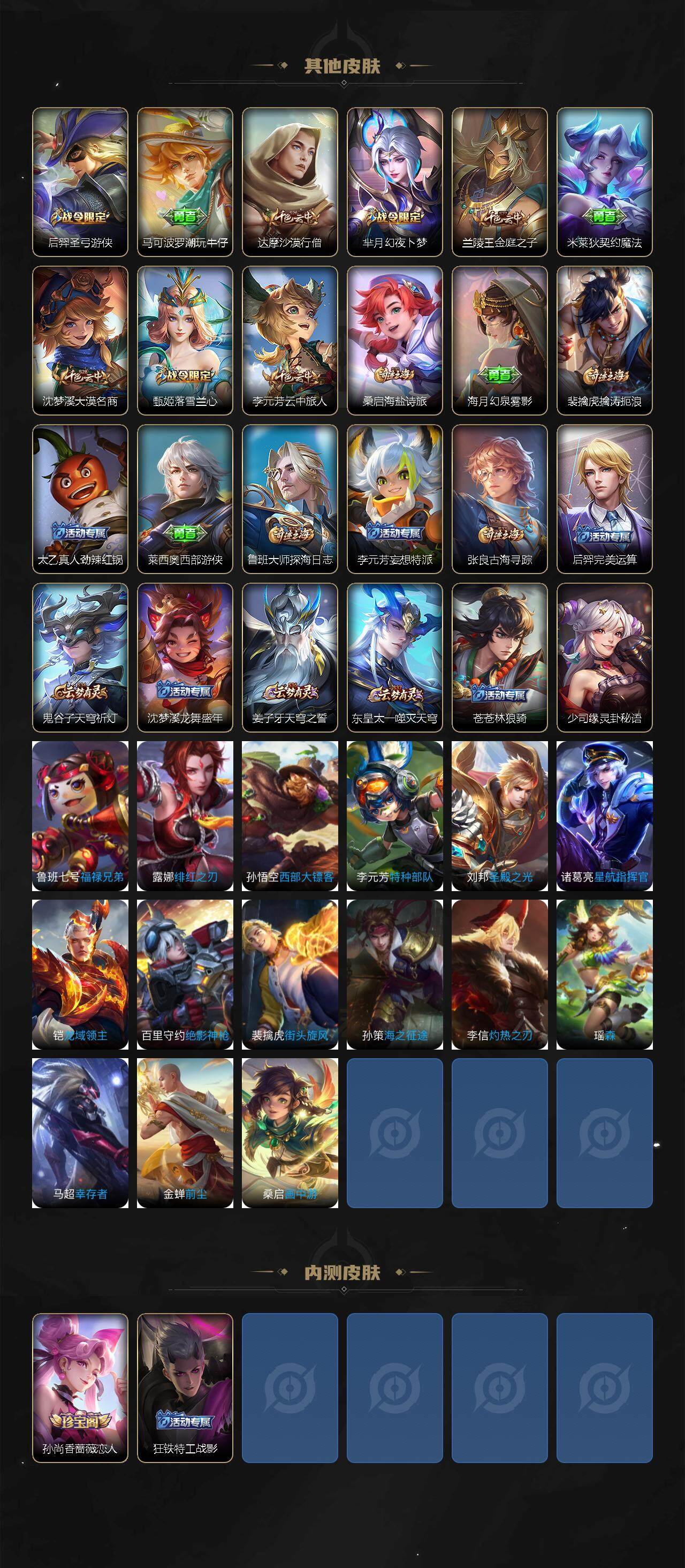 【其他皮肤】:项羽海滩派对,韩信教廷特使,韩信街头霸王,赵云白执事,白起白色死神,宫本武藏未来纪元,安琪拉玩偶对对碰,妲己少女阿狸,典韦黄金武士,亚瑟死亡骑士,达摩拳王,甄姬花好人间,刘备万事如意,后羿阿尔法小队,狄仁杰阴阳师,刘备汉昭烈帝,关羽龙腾万里,老夫子功夫老勺,孙尚香沉稳之力,小乔丁香结,吕布野性能量,狂铁特工战影,钟馗驱傩正仪,苏烈千军破阵,后羿圣弓游侠,马可波罗潮玩牛仔,达摩沙漠行僧,芈月幻夜卜梦,兰陵王金庭之子,米莱狄契约魔法,沈梦溪大漠名商,甄姬落雪兰心,李元芳云中旅人,桑启海盐诗旅,海月幻泉雾影,裴擒虎擒涛扼浪,太乙真人劲辣红锅,莱西奥西部游侠,鲁班大师探海日志,李元芳妄想特派,张良古海寻踪,后羿完美运算,鬼谷子天穹祈灯,沈梦溪龙舞盛年,姜子牙天穹之誓,东皇太一噬灭天穹,苍苍林狼骑,少司缘灵卦秘语,鲁班七号福禄兄弟,露娜绯红之刃,孙悟