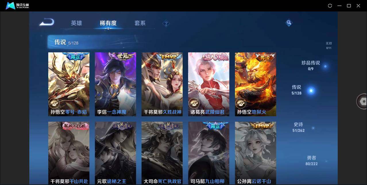 【传说皮肤】:孙悟空零号赤焰,李信一念神魔,干将莫邪久胜战神,诸葛亮武陵仙君,孙悟空地狱火