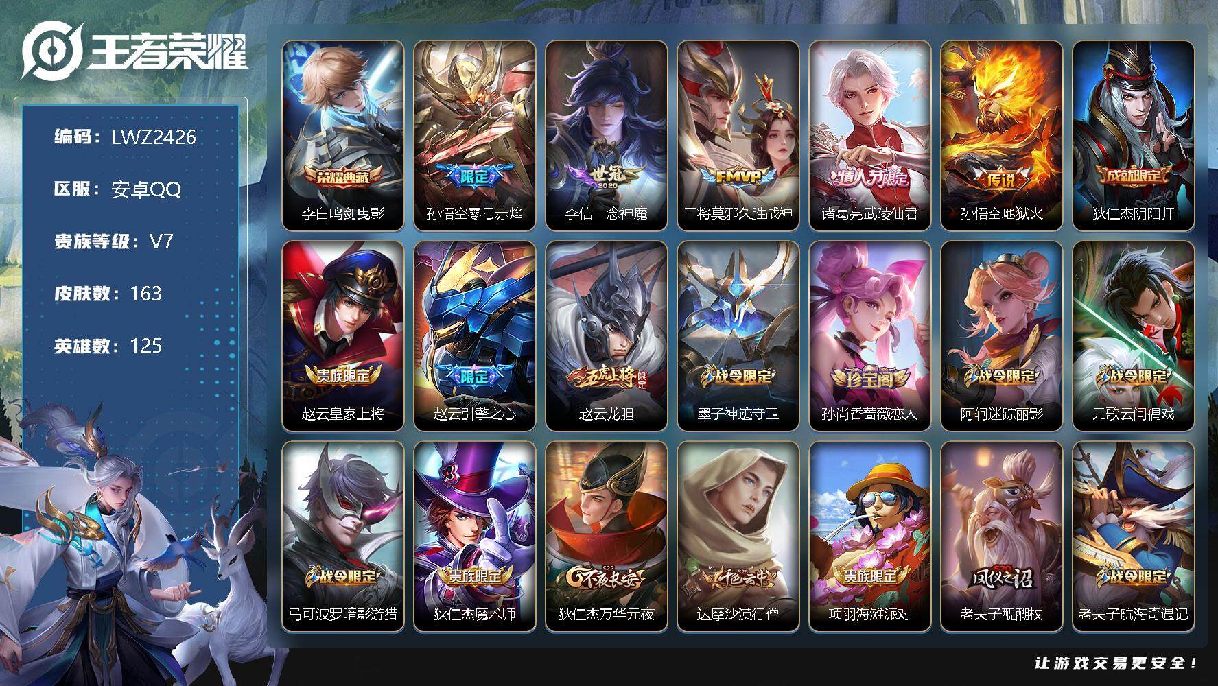 [12128340]【特价急出/详情看图】:安卓Q-V7-至尊星耀IV段位-125英雄-163皮肤-1典藏-5传说-51史诗 【荣耀典藏】:李白鸣剑曳影 【传说皮肤】:孙悟空零号赤焰,李信一念神魔,干将莫邪久胜战神,诸葛亮武陵仙君,孙悟空地狱火 【限定皮肤】:狄仁杰阴阳师,赵云皇家上将,赵云引擎之心,赵云龙胆,墨子神迹守卫,孙尚香蔷薇恋人,阿轲迷踪丽影,元歌云间偶戏,马可波罗暗影游猎,狄仁杰魔术师,狄仁杰万华元夜,达摩沙漠行僧,项羽海滩派对,老夫子醍醐杖,老夫子航海奇遇记,程咬金演武夺筹,刘邦夺宝奇兵,韩信傲雪梅枪,兰陵王金庭之子,花木兰默契交锋,亚瑟潮玩骑士王,孙悟空零号赤焰,张飞虎魄,李元芳云中旅人,钟馗驱傩正仪,干将莫邪冰霜恋舞曲,雅典娜单词大作战,雅典娜黎明之约,蔡文姬繁星吟游,鬼谷子原初探秘者,鬼谷子五谷丰年,诸葛亮武陵仙君,黄忠烈魂,百里守约朱雀志,弈星混沌棋,沈梦溪大漠名商,明世隐疑决卦,裴擒虎李小龙,裴擒虎擒涛扼浪,云中君纤云弄巧,猪八戒西部大镖客,嫦娥拒霜思,西施玲珑珍味,蒙犽狂想玩偶喵,鲁班大师探海日志,戈娅驭风魔法,阿古朵江河有灵,张良古海寻踪,鬼谷子天穹祈灯,沈梦溪龙舞盛年,刘邦剑破天穹,程咬金群星魔术团 【年限皮肤】:百里守约朱雀志,黄忠烈魂,张飞虎魄,赵云龙胆 【赛季限定】:狄仁杰万华元夜,达摩沙漠行僧,老夫子醍醐杖,程咬金演武夺筹,兰陵王金庭之子,张良古海寻踪,李元芳云中旅人,钟馗驱傩正仪,雅典娜黎明之约,鬼谷子原初探秘者,弈星混沌棋,沈梦溪大漠名商,明世隐疑决卦,裴擒虎擒涛扼浪,鲁班大师探海日志,鬼谷子天穹祈灯,刘邦剑破天穹 【战令限定】:墨子神迹守卫,阿轲迷踪丽影,元歌云间偶戏,马可波罗暗影游猎,老夫子航海奇遇记,刘邦夺宝奇兵,亚瑟潮玩骑士王,雅典娜单词大作战,猪八戒西部大镖客,西施玲珑珍味,蒙犽狂想玩偶喵,戈娅驭风魔法 【史诗皮肤】:项羽苍穹之光,赵云皇家上将,赵云未来纪元,甄姬冰雪圆舞曲,王昭君偶像歌手,狄仁杰魔术师,宫本武藏鬼剑武藏,孙尚香蔷薇恋人,孙尚香水果甜心,嬴政摇滚巨星,妲己魅力维加斯,妲己女仆咖啡,墨子金属风暴,吕布圣诞狂欢,曹操幽灵船长,吕布末日机甲,韩信白龙吟,赵云引擎之心,刘邦德古拉伯爵,夏侯惇乘风破浪,小乔缤纷独角兽,亚瑟心灵战警,雅典娜冰冠公主,安琪拉心灵骇客,百里守约特工魅影,铠曙光守护者,刘禅天才门将,李元芳逐浪之夏,程