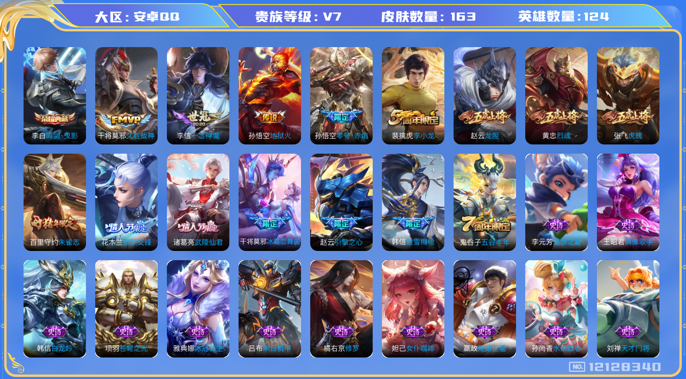 [12128340]【特价急出/详情看图】:安卓Q-V7-至尊星耀IV段位-125英雄-163皮肤-1典藏-5传说-51史诗