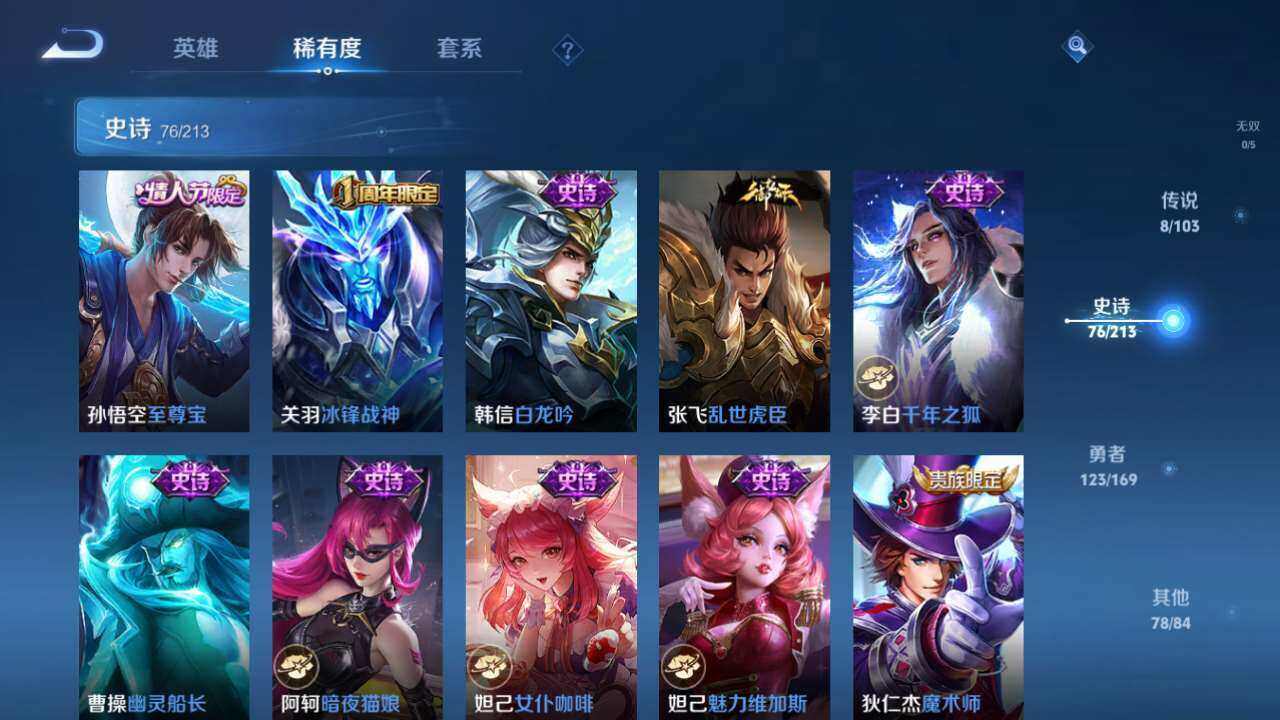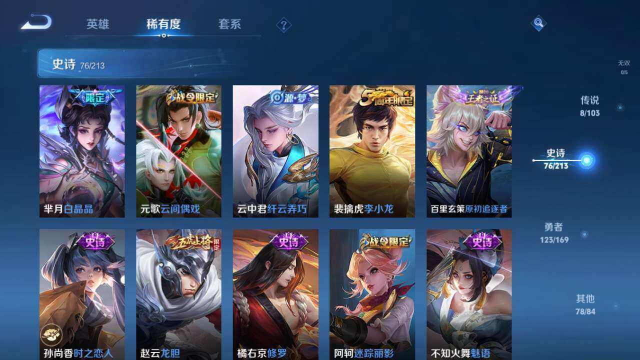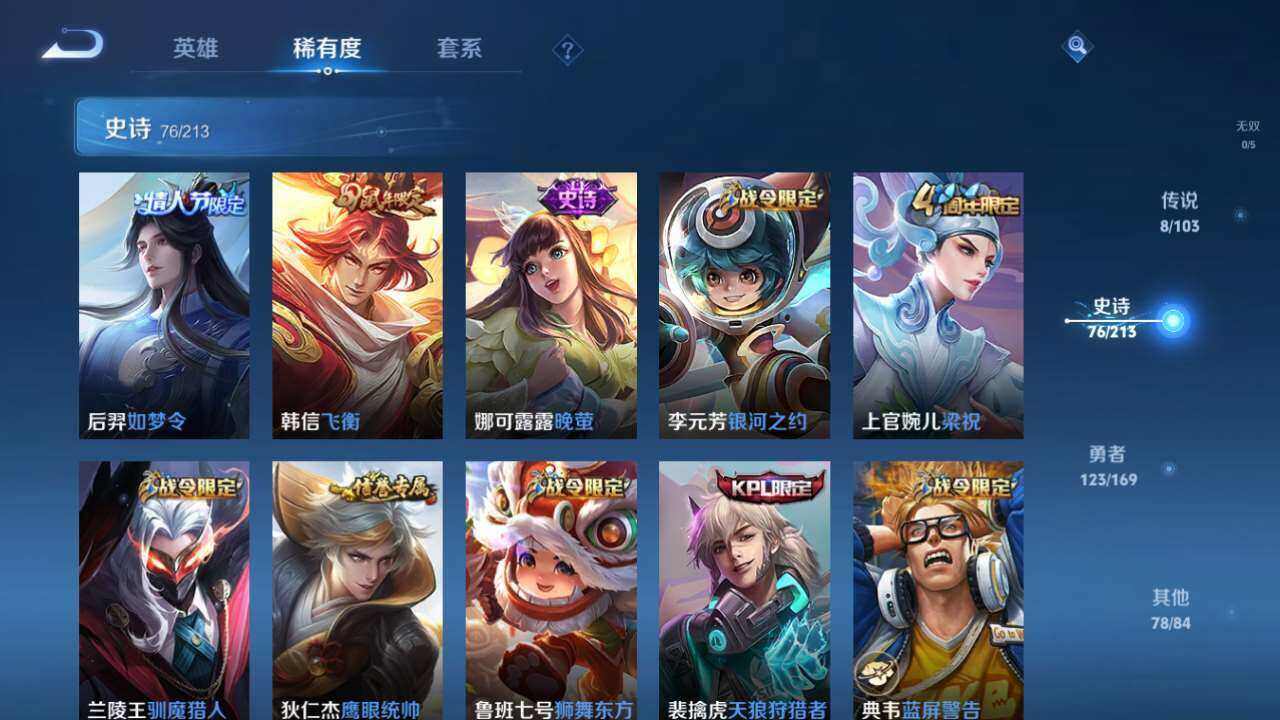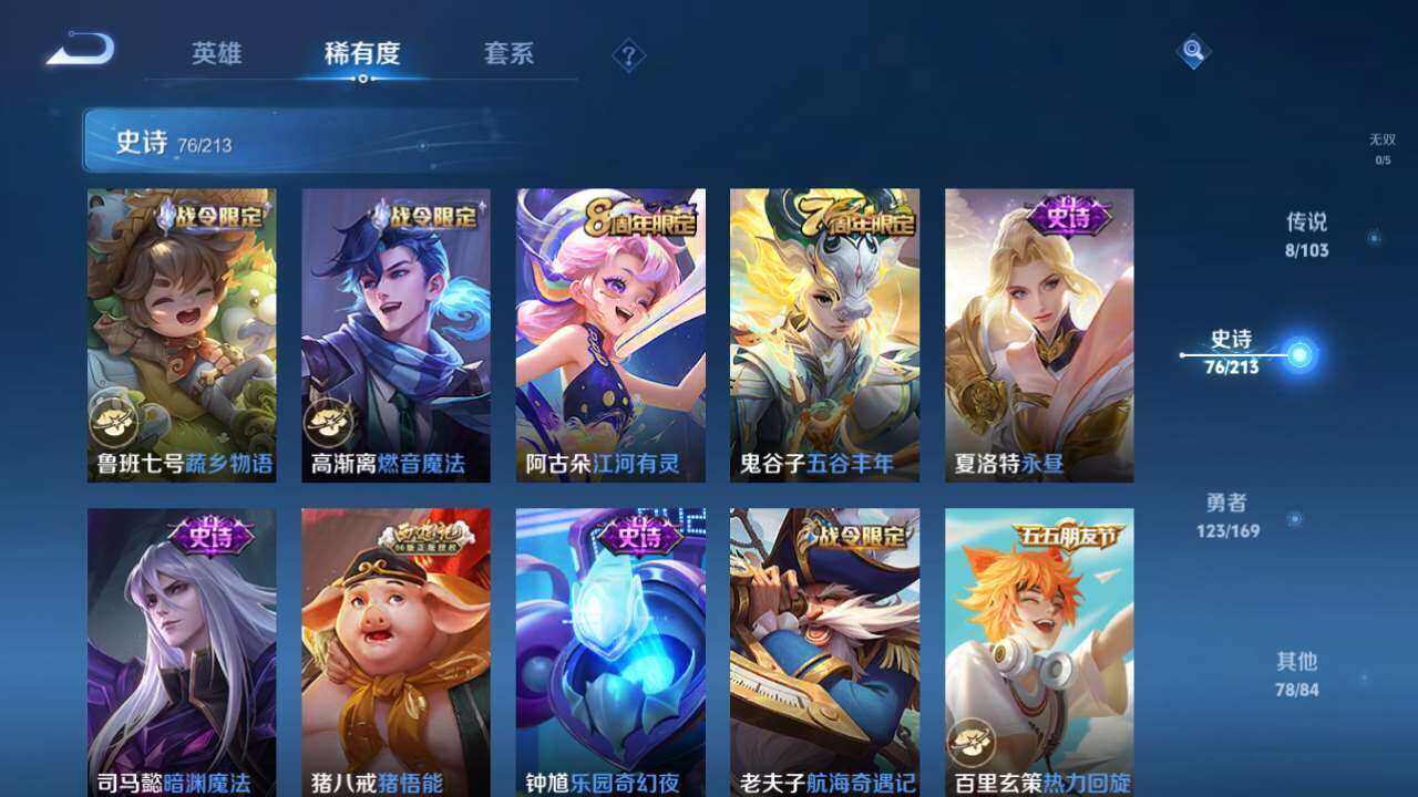 【赛季限定】:庄周蜃楼王,孙膑妖精王,扁鹊炼金王,白起狰,芈月重明,夏侯惇朔风刀,曹操烛龙,典韦穷奇,狄仁杰万华元夜,达摩沙漠行僧,老夫子醍醐杖,程咬金演武夺筹,兰陵王金庭之子,张良古海寻踪,牛魔御旌,李元芳云中旅人,虞姬凯尔特女王,钟馗驱傩正仪,太乙真人饕餮,鬼谷子原初探秘者,苏烈千军破阵,百里玄策原初追逐者,弈星混沌棋,沈梦溪大漠名商,明世隐疑决卦,裴擒虎擒涛扼浪,狂铁御狮,米莱狄御霄,盾山御銮,鲁班大师探海日志,桑启海盐诗旅,鬼谷子天穹祈灯
